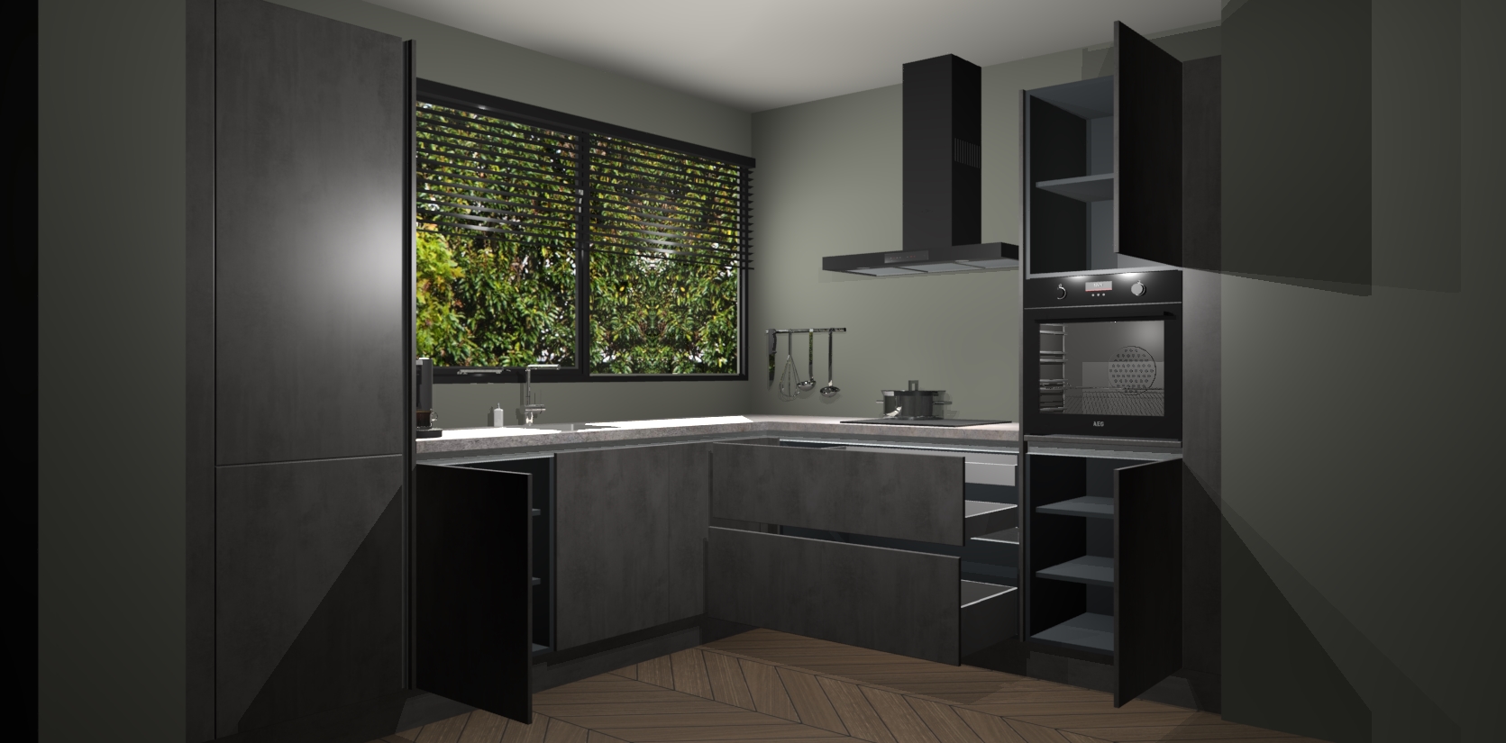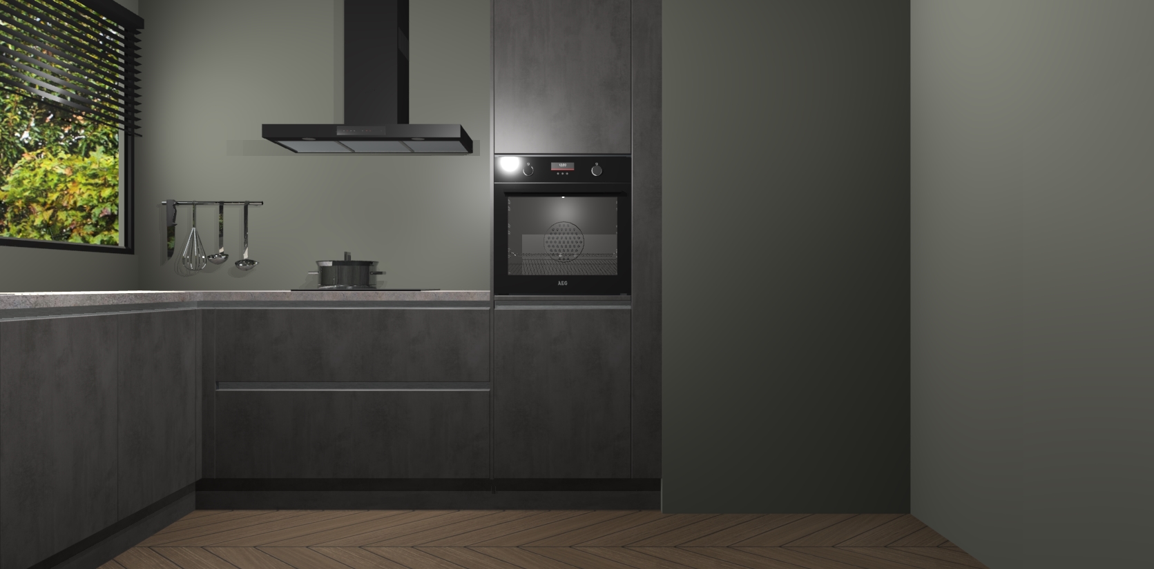 Met een modern, tijdloos design en ruime opslagruimte, zult u zich in no-time thuis voelen in uw nieuwe keuken. Uw leven wordt eenvoudiger met de soft-close deuren die voor het ultieme stille comfort zorgen - geen geluid dat u stoort terwijl u kookt. Ook is de keuken voorzien van 5 ingebouwde apparaten: een oven, inductie kookplaat, afzuigkap, vaatwasser en koelkast. Deze kunnen gemakkelijk na bestelling worden bijgewerkt naar AEG - waardoor uw luxe ervaring compleet is.
