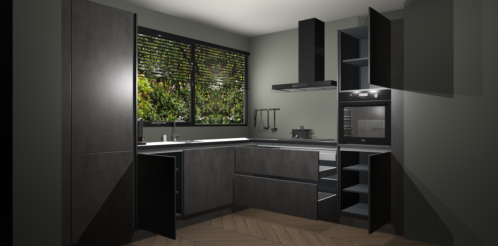 Met een modern, tijdloos design en ruime opslagruimte, zult u zich in no-time thuis voelen in uw nieuwe keuken. Uw leven wordt eenvoudiger met de soft-close deuren die voor het ultieme stille comfort zorgen - geen geluid dat u stoort terwijl u kookt. Ook is de keuken voorzien van 5 ingebouwde apparaten: een oven, inductie kookplaat, afzuigkap, vaatwasser en koelkast. Deze kunnen gemakkelijk na bestelling worden bijgewerkt naar AEG - waardoor uw luxe ervaring compleet is.