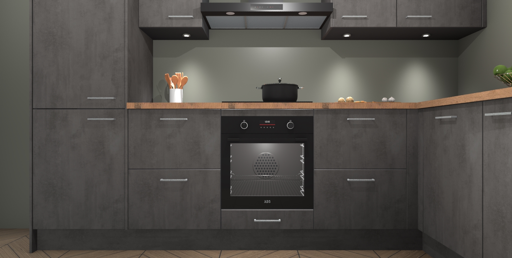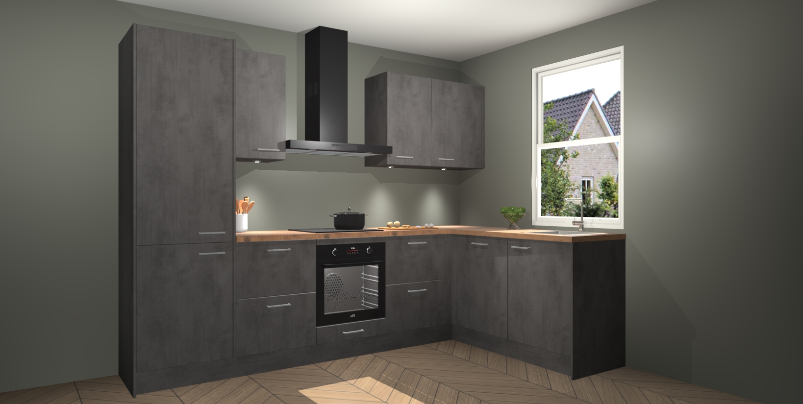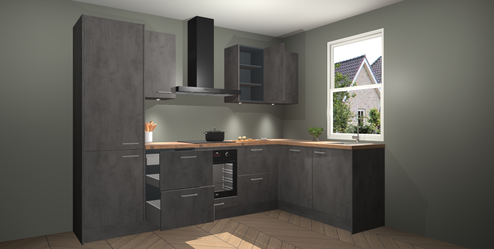 Maak kennis met de trendsettende en luxe Beton Antraciet keuken Bazel! Deze uitzonderlijke keuken van Duitse kwaliteit is stijlvol, modern en perfect om elk huis mee op te fleuren. De binnenkant van de kasten worden meegenomen in een bijpassende kleur om een samenhangende eigentijdse esthetiek te voltooien. U zult dol zijn op hoe uw pas gerenoveerde keuken eruitziet met de Beton Antraciet editie!