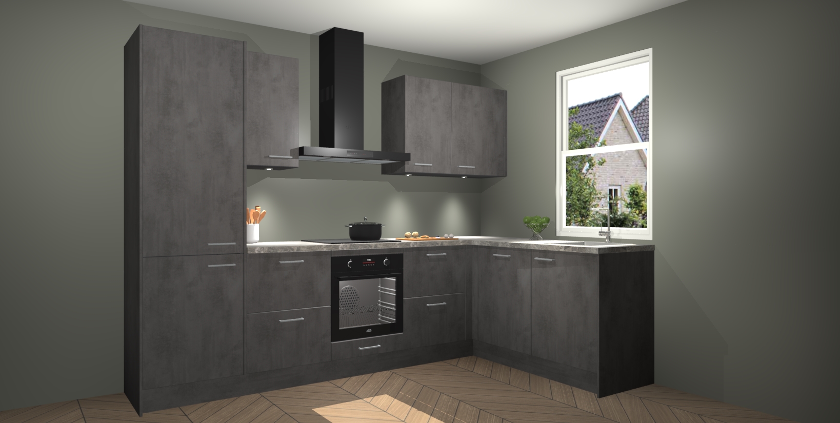 Maak kennis met de trendsettende en luxe Beton Antraciet keuken Bazel! Deze uitzonderlijke keuken van Duitse kwaliteit is stijlvol, modern en perfect om elk huis mee op te fleuren. De binnenkant van de kasten worden meegenomen in een bijpassende kleur om een samenhangende eigentijdse esthetiek te voltooien. U zult dol zijn op hoe uw pas gerenoveerde keuken eruitziet met de Beton Antraciet editie!