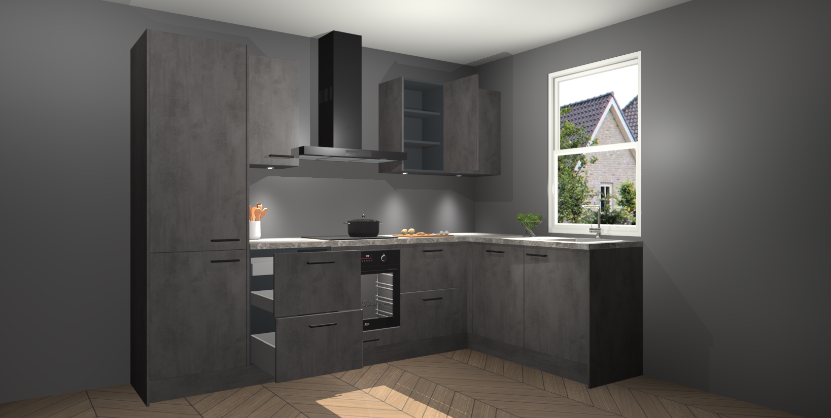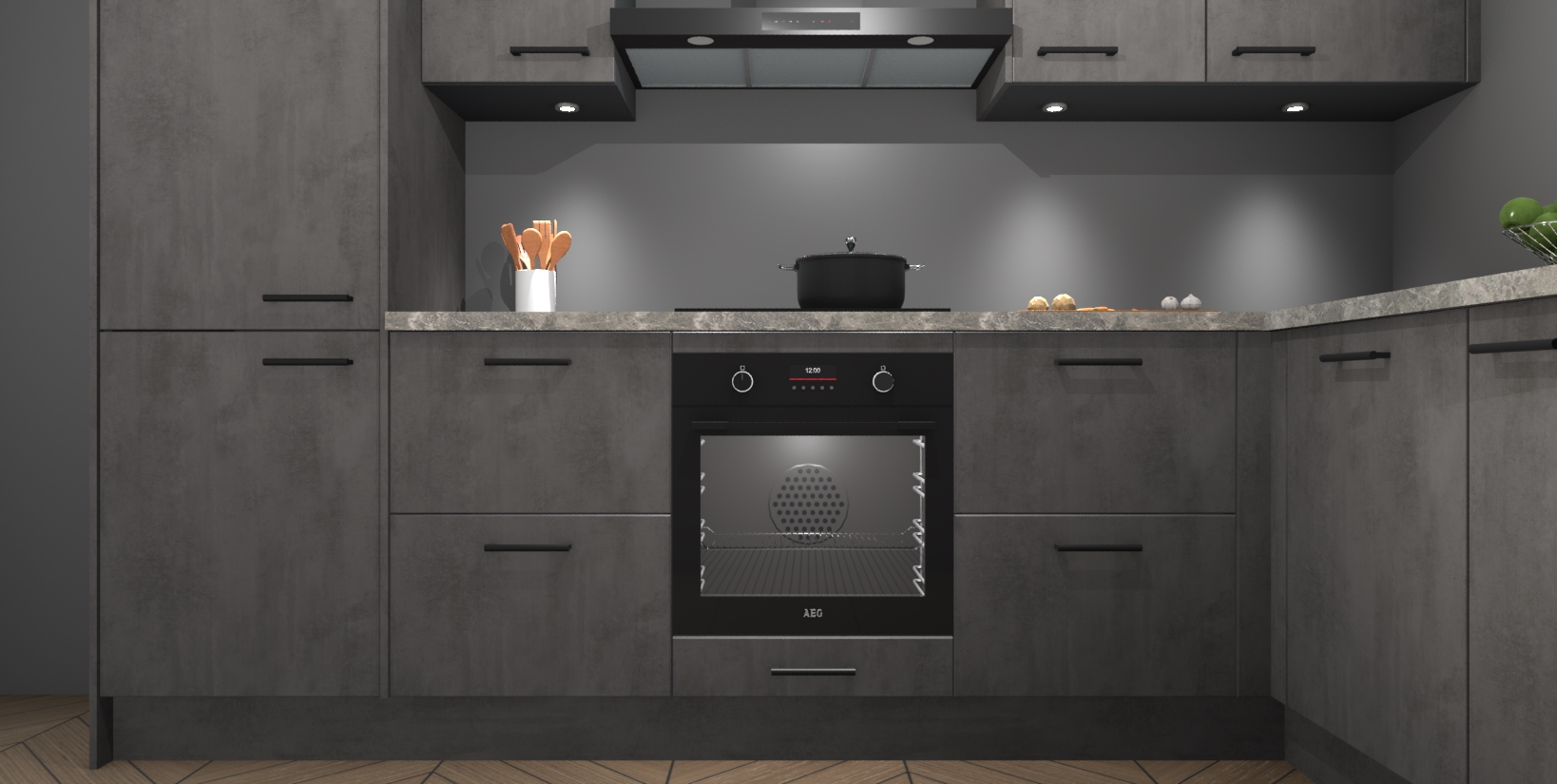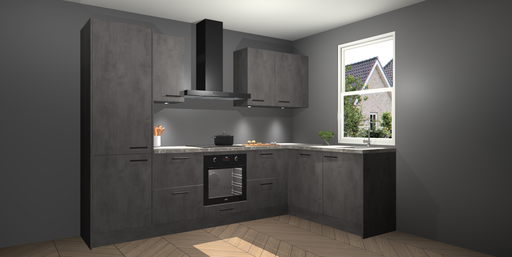 Maak kennis met de trendsettende en luxe Beton Antraciet keuken Bazel! Deze uitzonderlijke keuken van Duitse kwaliteit is stijlvol, modern en perfect om elk huis mee op te fleuren. De binnenkant van de kasten worden meegenomen in een bijpassende kleur om een samenhangende eigentijdse esthetiek te voltooien. U zult dol zijn op hoe uw pas gerenoveerde keuken eruitziet met de Beton Antraciet editie!