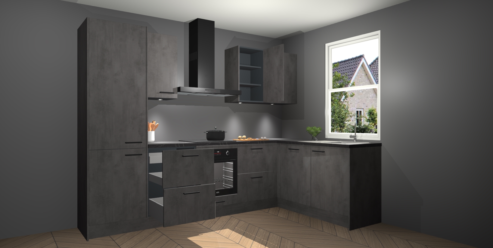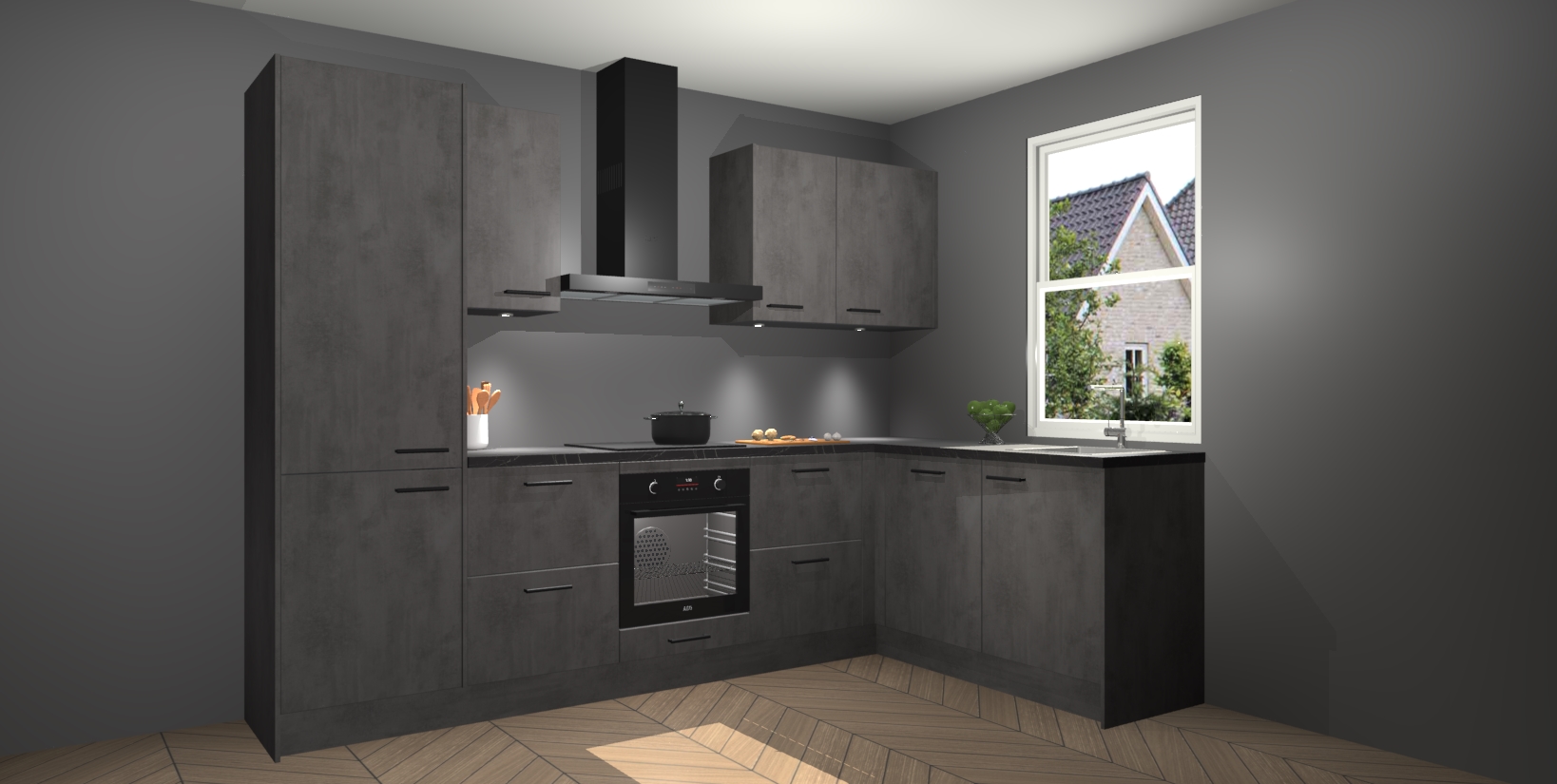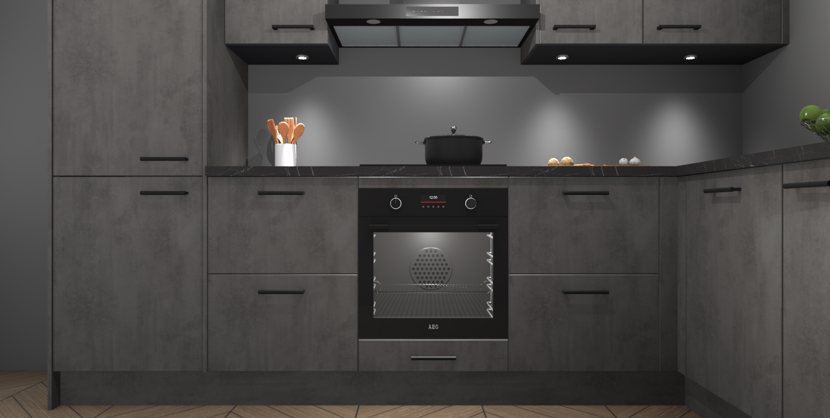 Maak kennis met de trendsettende en luxe Beton Antraciet keuken Bazel! Deze uitzonderlijke keuken van Duitse kwaliteit is stijlvol, modern en perfect om elk huis mee op te fleuren. De binnenkant van de kasten worden meegenomen in een bijpassende kleur om een samenhangende eigentijdse esthetiek te voltooien. U zult dol zijn op hoe uw pas gerenoveerde keuken eruitziet met de Beton Antraciet editie!