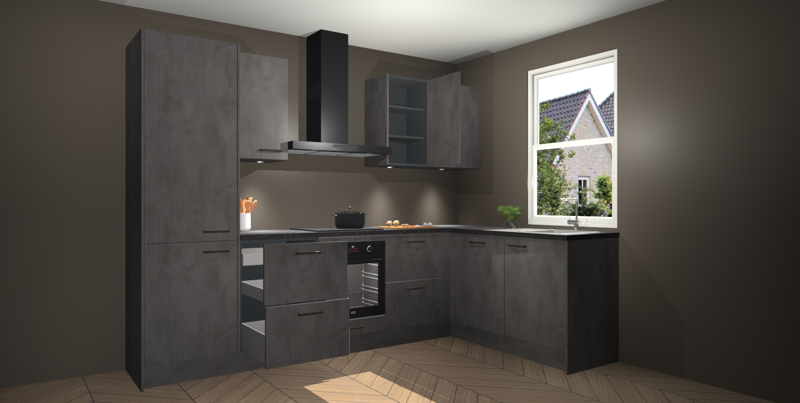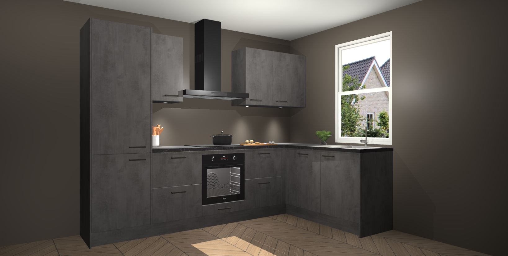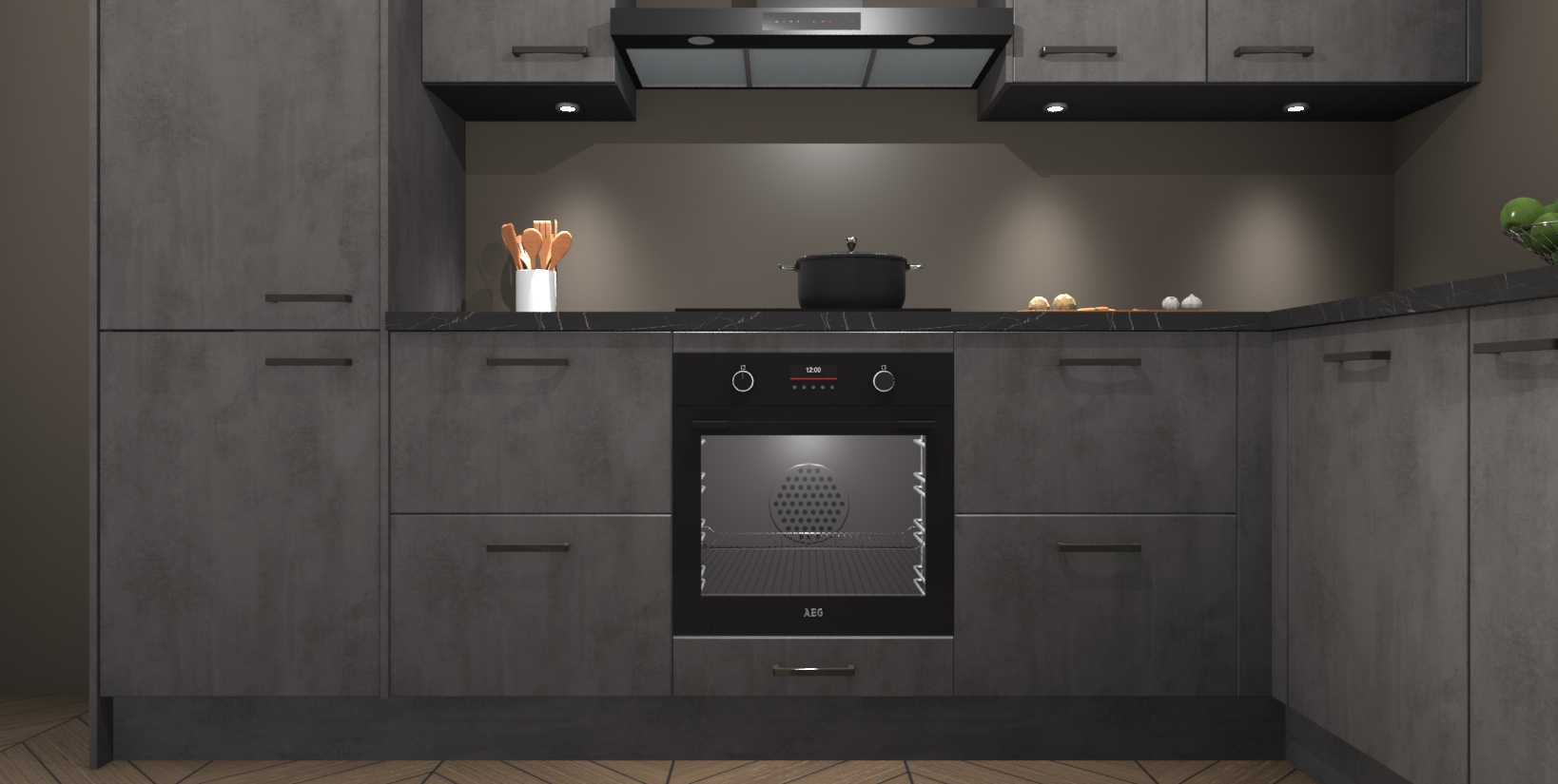 Maak kennis met de trendsettende en luxe Beton Antraciet keuken Bazel! Deze uitzonderlijke keuken van Duitse kwaliteit is stijlvol, modern en perfect om elk huis mee op te fleuren. De binnenkant van de kasten worden meegenomen in een bijpassende kleur om een samenhangende eigentijdse esthetiek te voltooien. U zult dol zijn op hoe uw pas gerenoveerde keuken eruitziet met de Beton Antraciet editie!