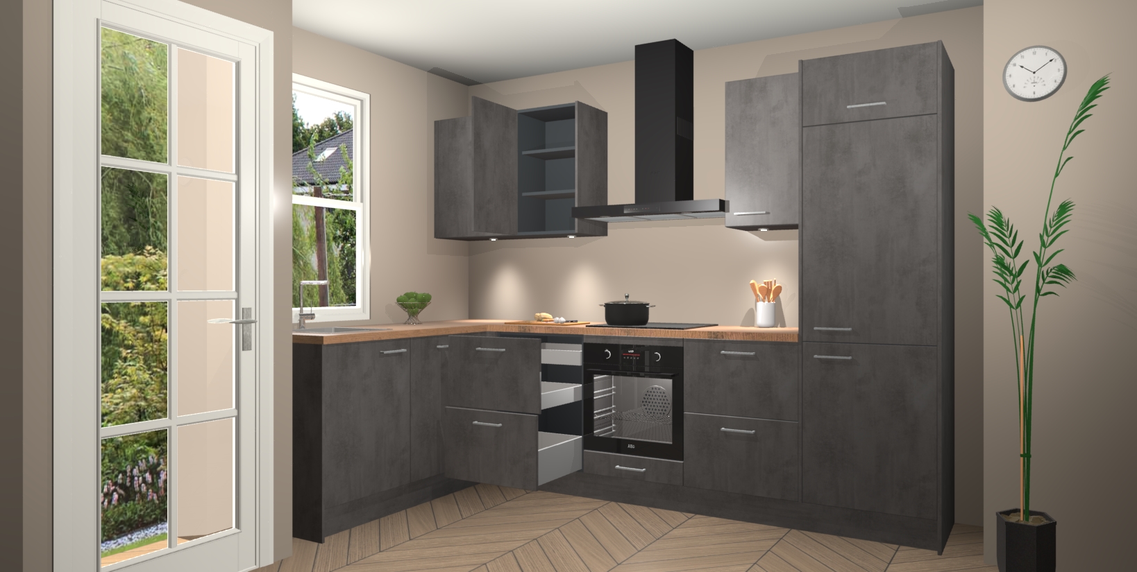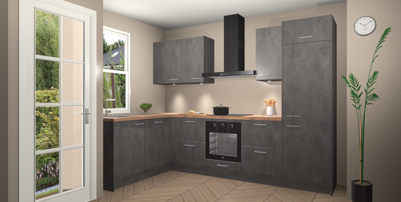Bent u op zoek naar een strakke, moderne hoekkeuken die uw huis oppept en een moderne uitstraling geeft? Kijk dan niet verder dan de beton antraciet keuken Beijing. Deze verbluffende hoekkeuken tilt hedendaags design naar een hoger niveau. Qua stijl is deze chique hoekkeuken voorzien van beton antraciet accenten, om een strakke maar opvallende look te creëren. De binnenkant van de kasten is afgewerkt in dezelfde prachtige beton antraciet kleur voor extra esthetische aantrekkingskracht.