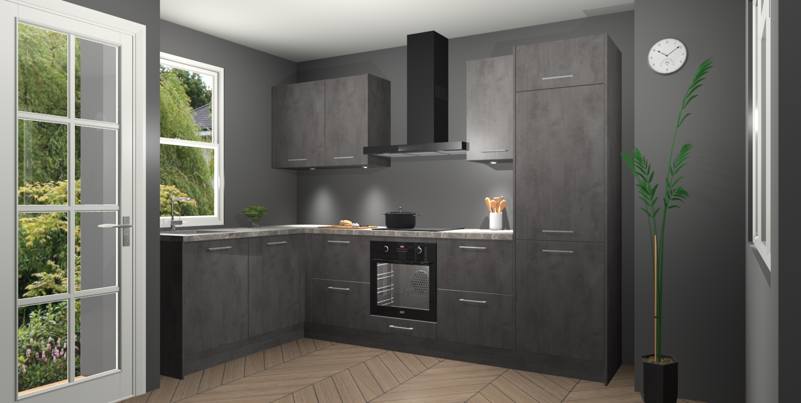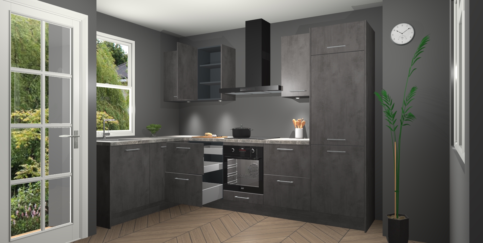 Bent u op zoek naar een strakke, moderne hoekkeuken die uw huis oppept en een moderne uitstraling geeft? Kijk dan niet verder dan de beton antraciet keuken Beijing. Deze verbluffende hoekkeuken tilt hedendaags design naar een hoger niveau. Qua stijl is deze chique hoekkeuken voorzien van beton antraciet accenten, om een strakke maar opvallende look te creëren. De binnenkant van de kasten is afgewerkt in dezelfde prachtige beton antraciet kleur voor extra esthetische aantrekkingskracht.