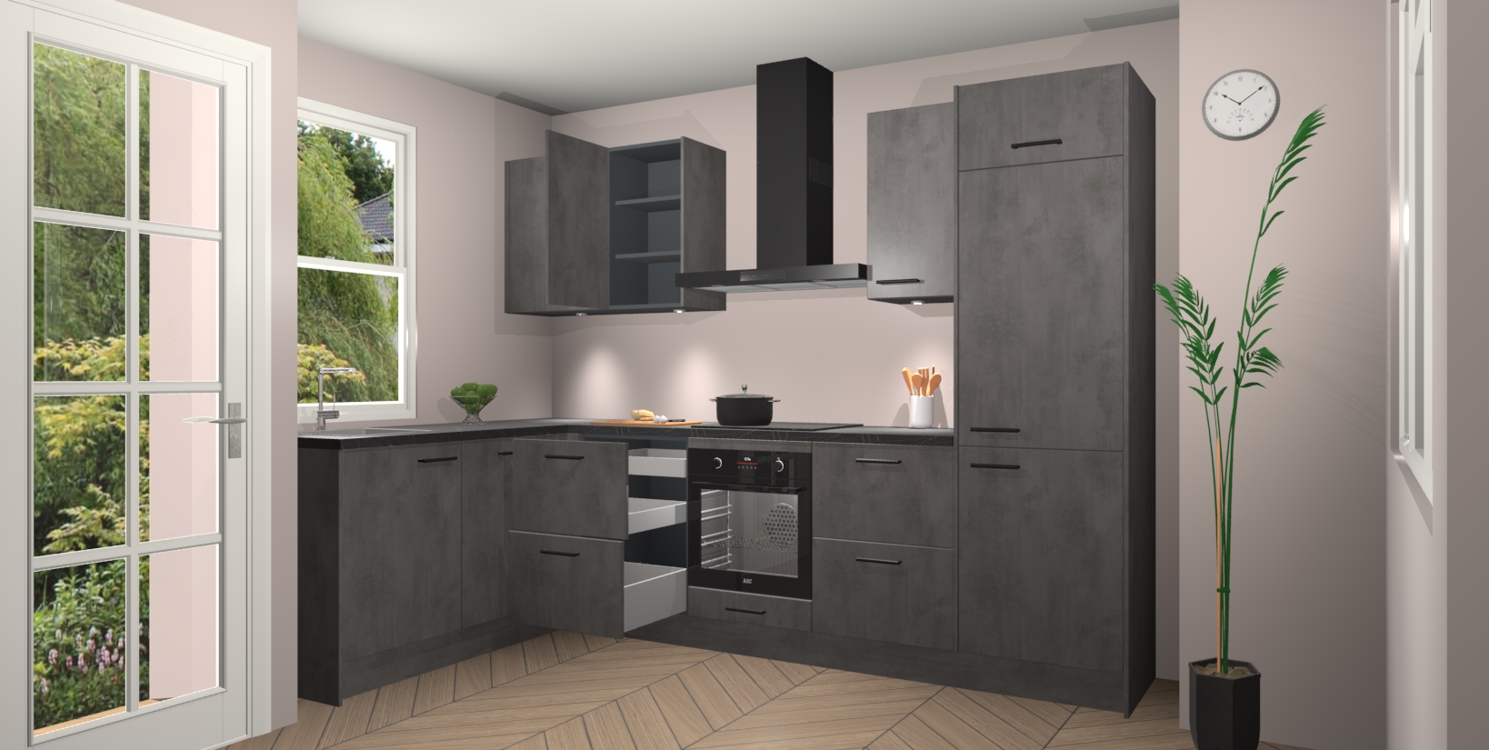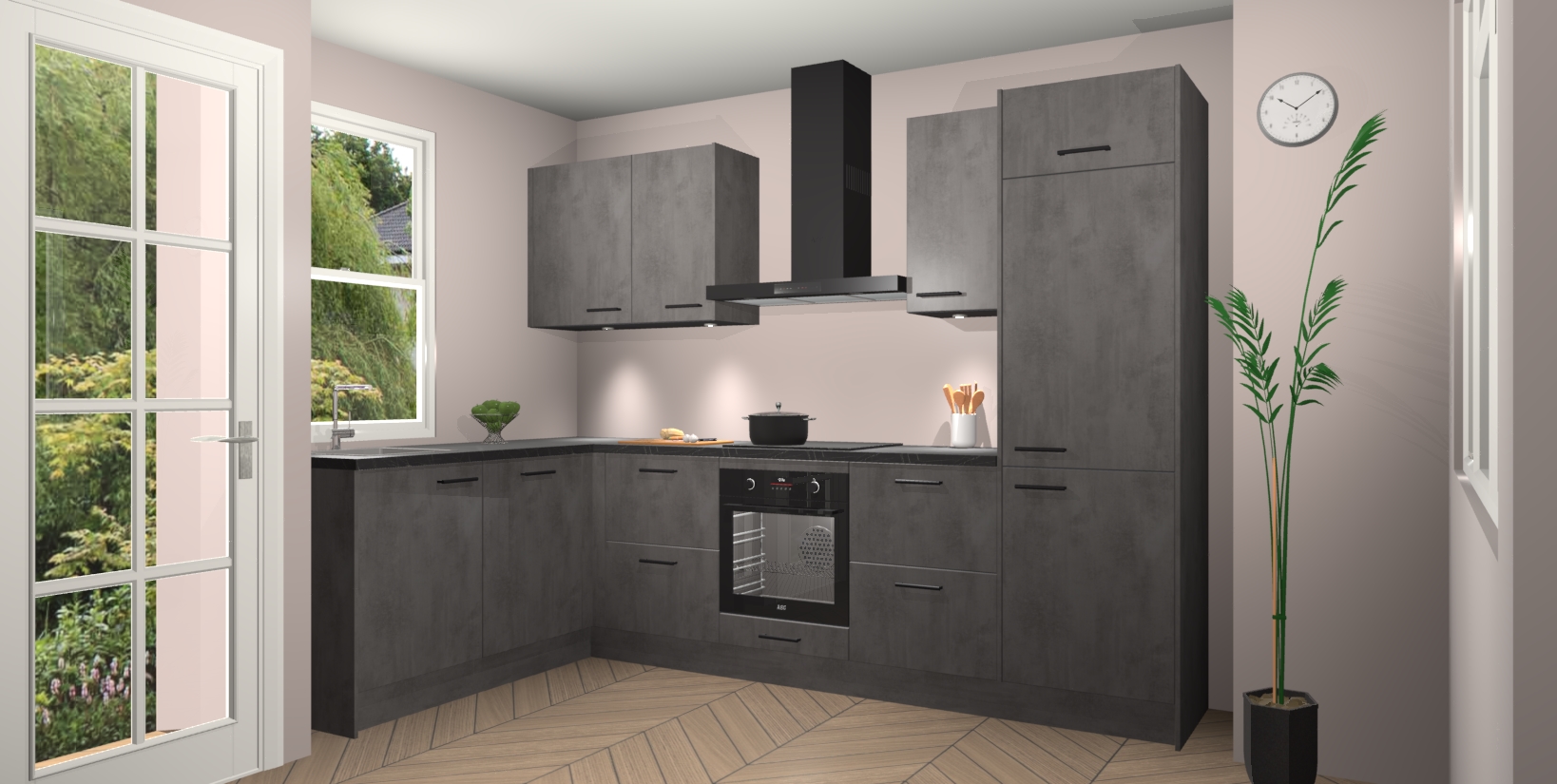 Bent u op zoek naar een strakke, moderne hoekkeuken die uw huis oppept en een moderne uitstraling geeft? Kijk dan niet verder dan de beton antraciet keuken Beijing. Deze verbluffende hoekkeuken tilt hedendaags design naar een hoger niveau. Qua stijl is deze chique hoekkeuken voorzien van beton antraciet accenten, om een strakke maar opvallende look te creëren. De binnenkant van de kasten is afgewerkt in dezelfde prachtige beton antraciet kleur voor extra esthetische aantrekkingskracht.
