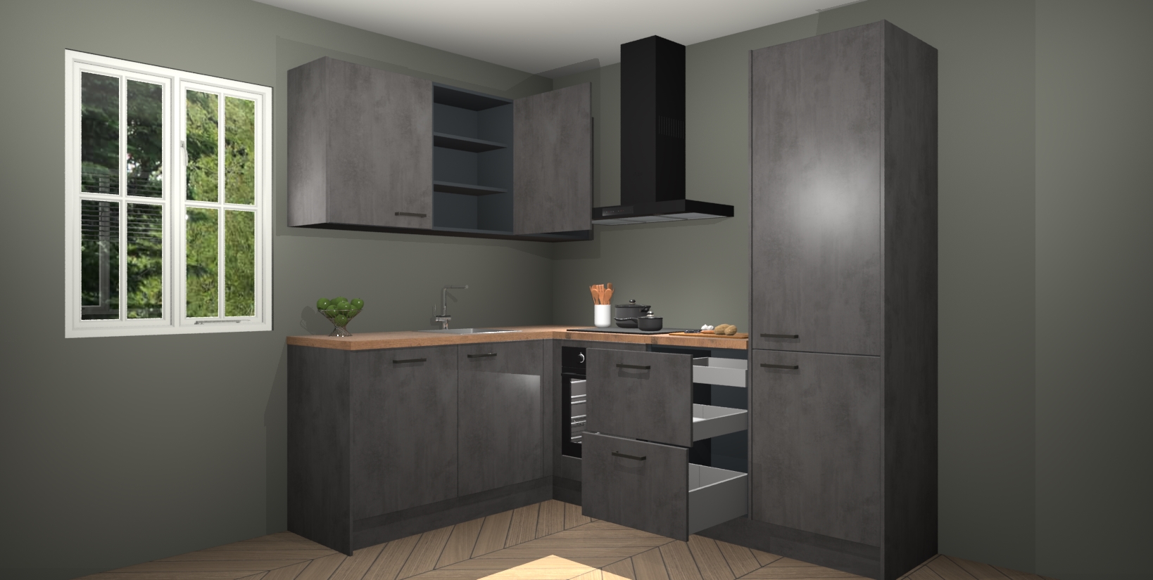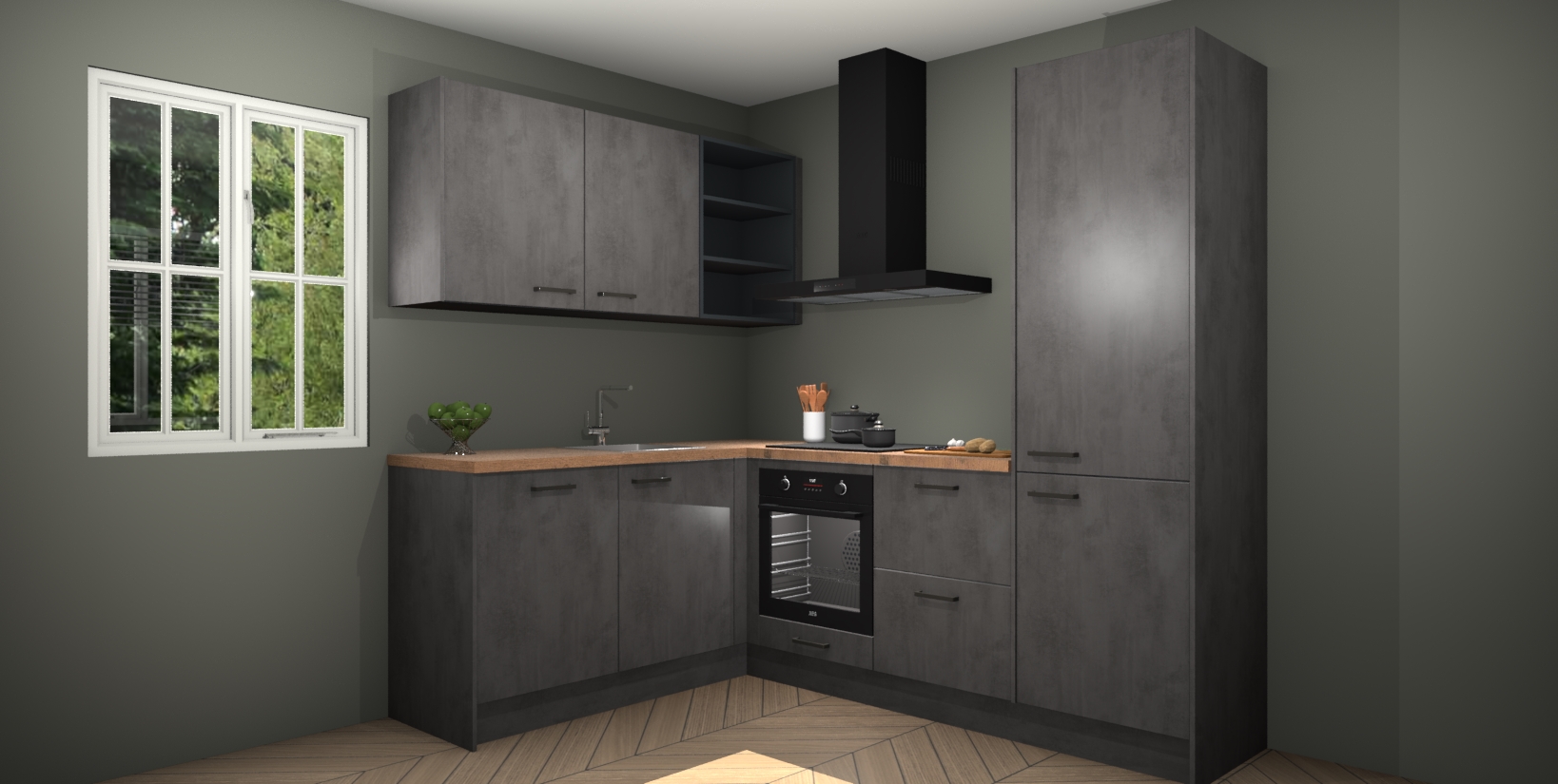 Maak kennis met de Beton Antraciet keuken Boekarest, een moderne hoekkeuken waar al uw vrienden en familie jaloers op zullen zijn! Het verbluffende mooie ontwerp past in elk interieur en is een ideale keuze voor wie op zoek is naar een klassieke, maar verfijnde look.