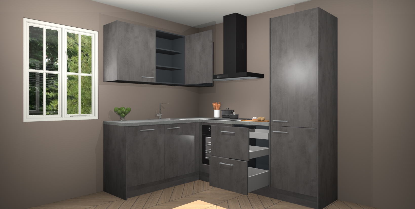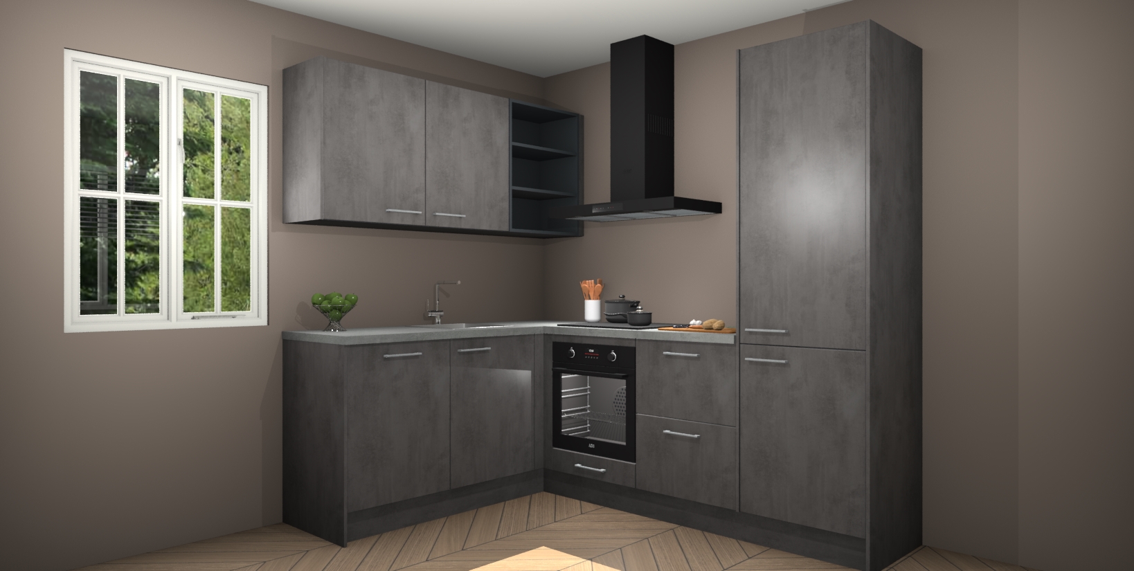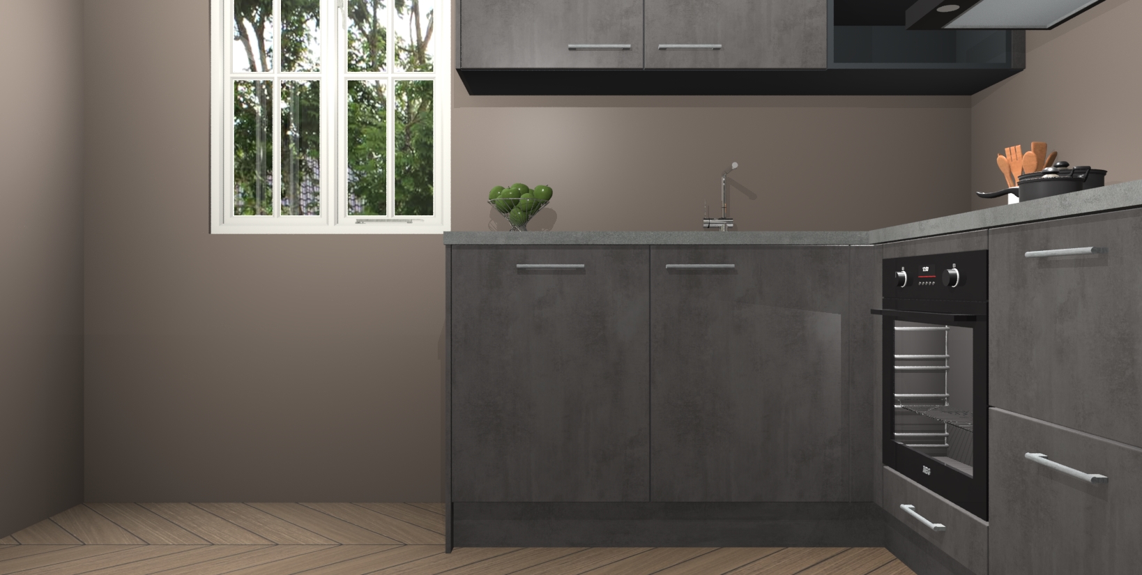 Maak kennis met de Beton Antraciet keuken Boekarest, een moderne hoekkeuken waar al uw vrienden en familie jaloers op zullen zijn! Het verbluffende mooie ontwerp past in elk interieur en is een ideale keuze voor wie op zoek is naar een klassieke, maar verfijnde look.