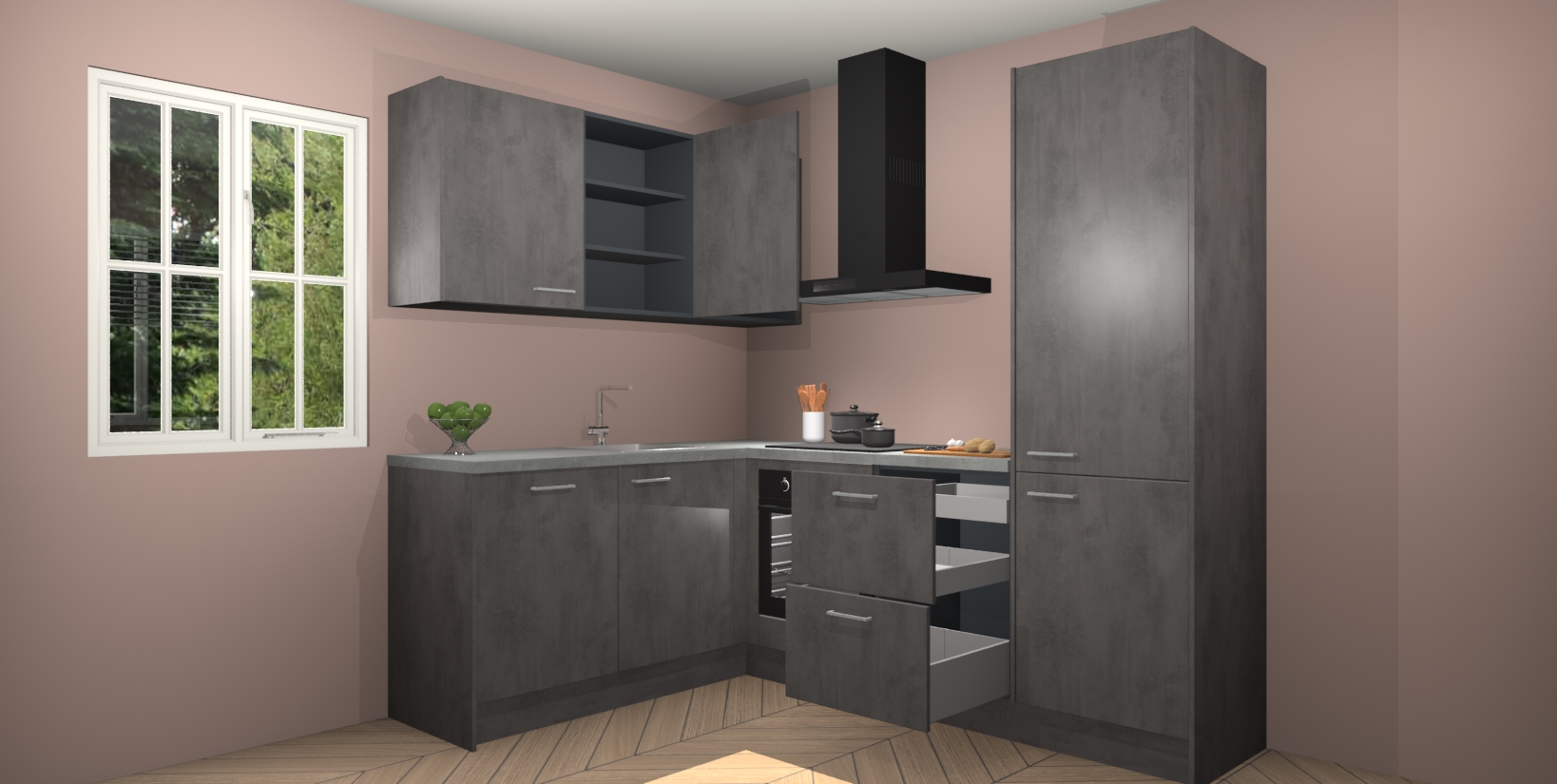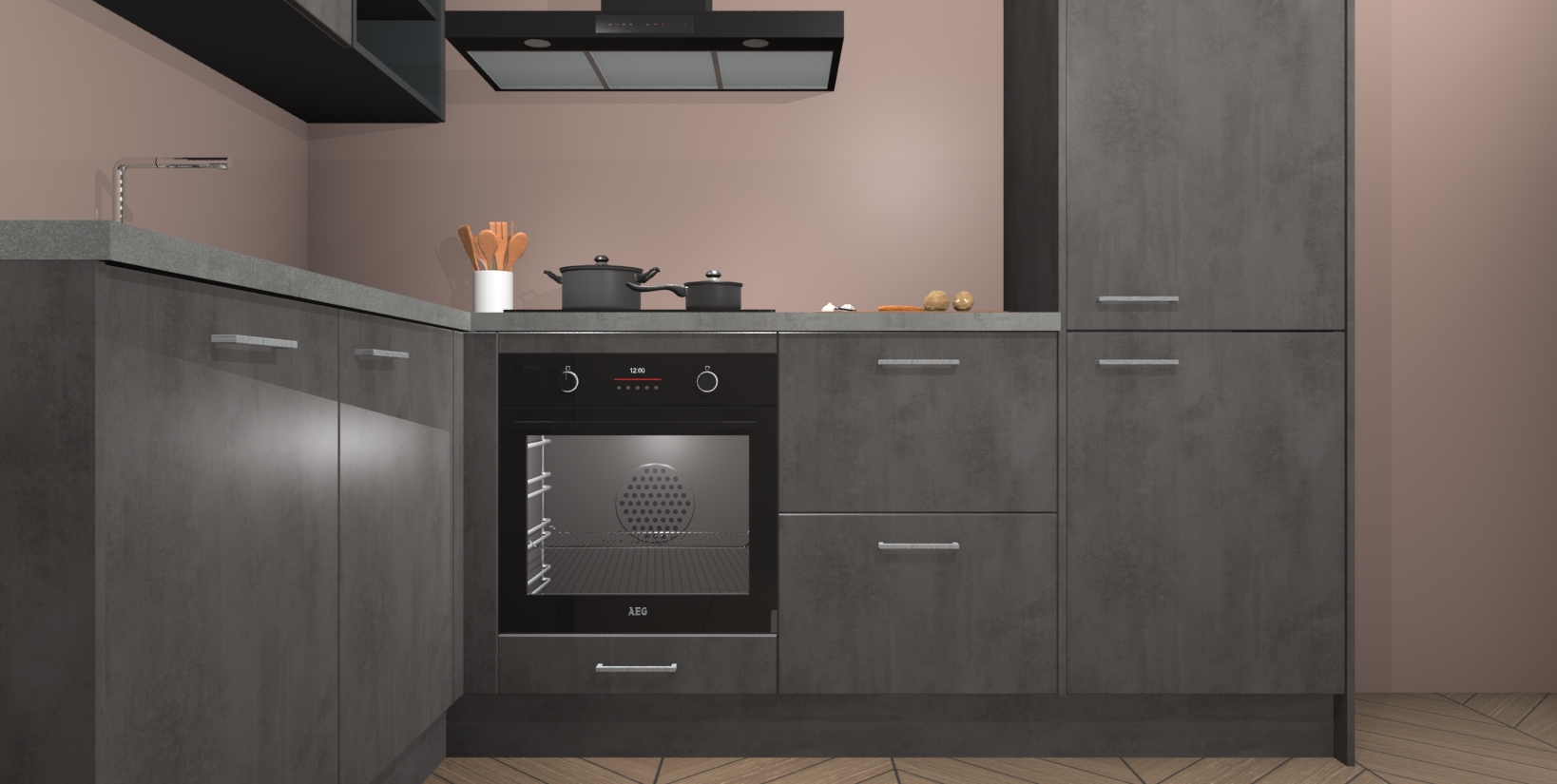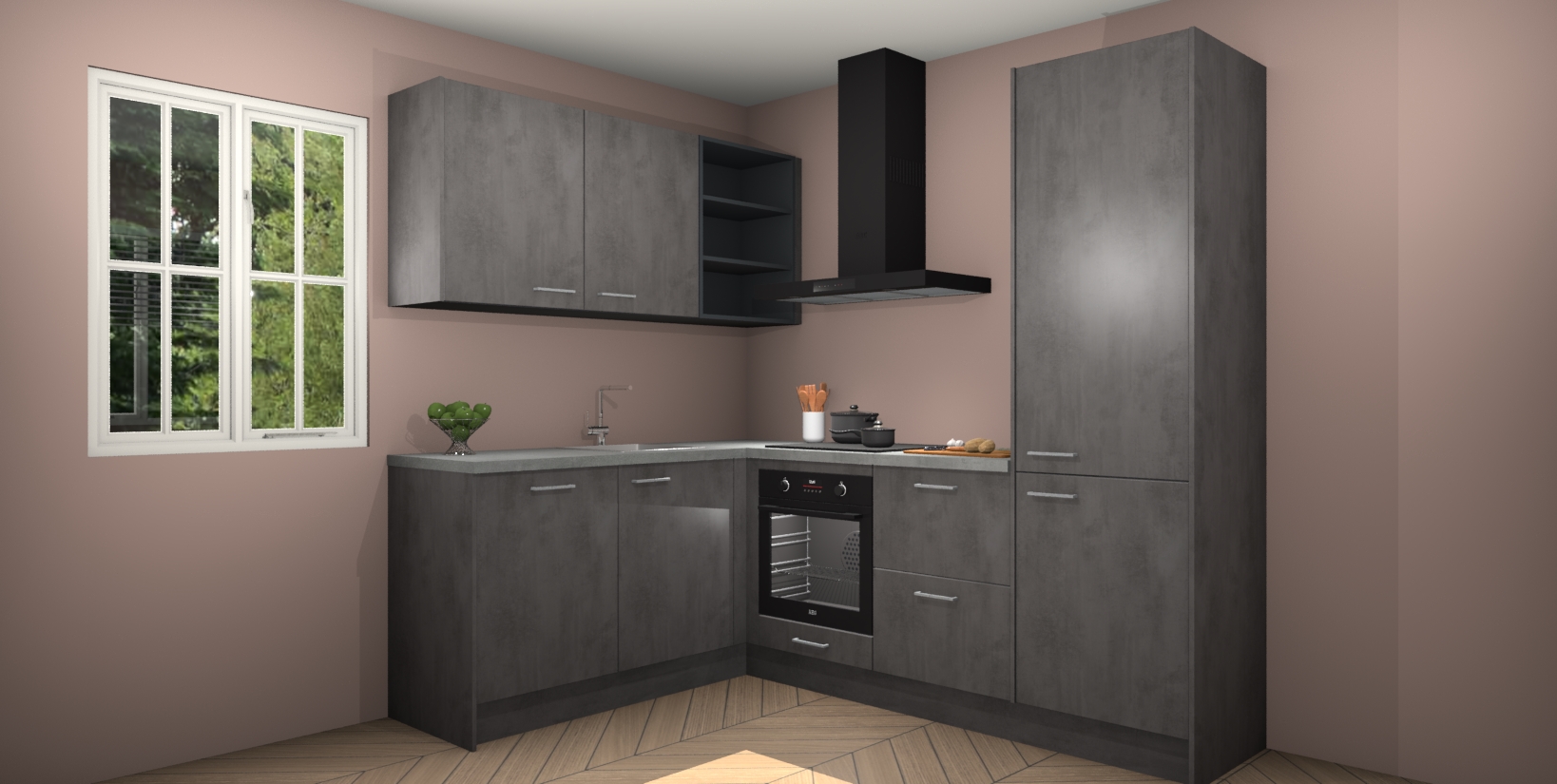 Maak kennis met de Beton Antraciet keuken Boekarest, een moderne hoekkeuken waar al uw vrienden en familie jaloers op zullen zijn! Het verbluffende mooie ontwerp past in elk interieur en is een ideale keuze voor wie op zoek is naar een klassieke, maar verfijnde look.