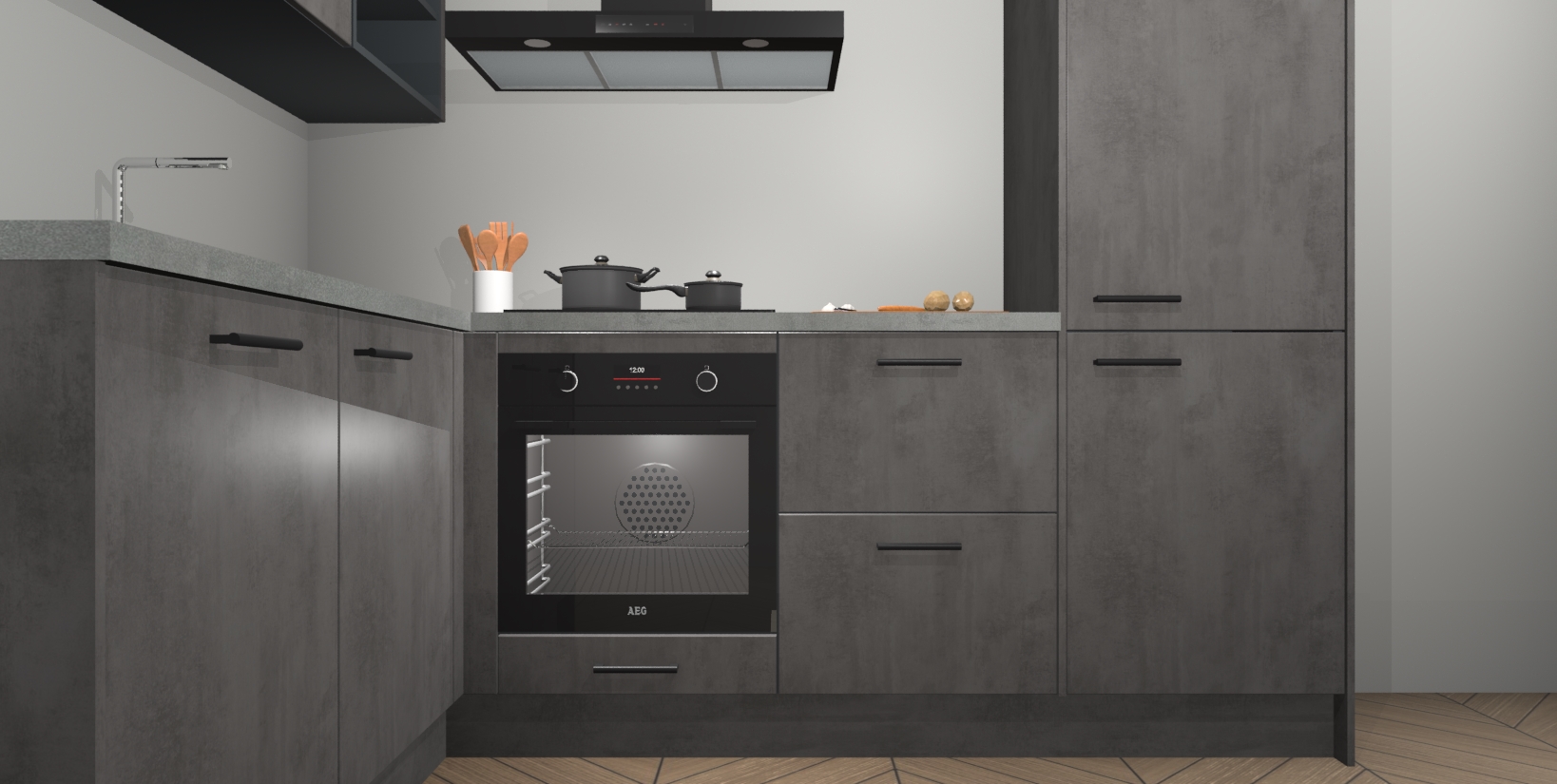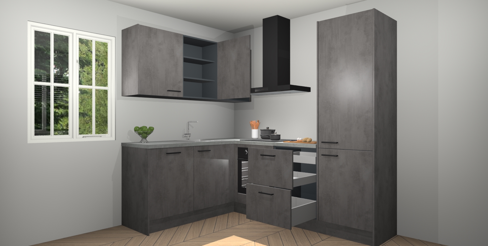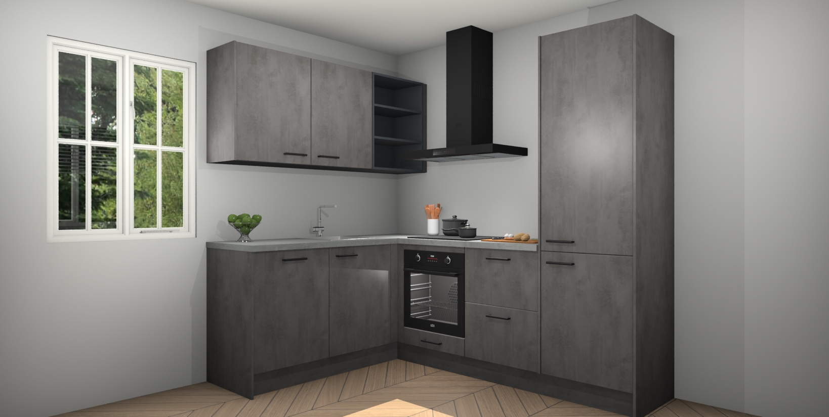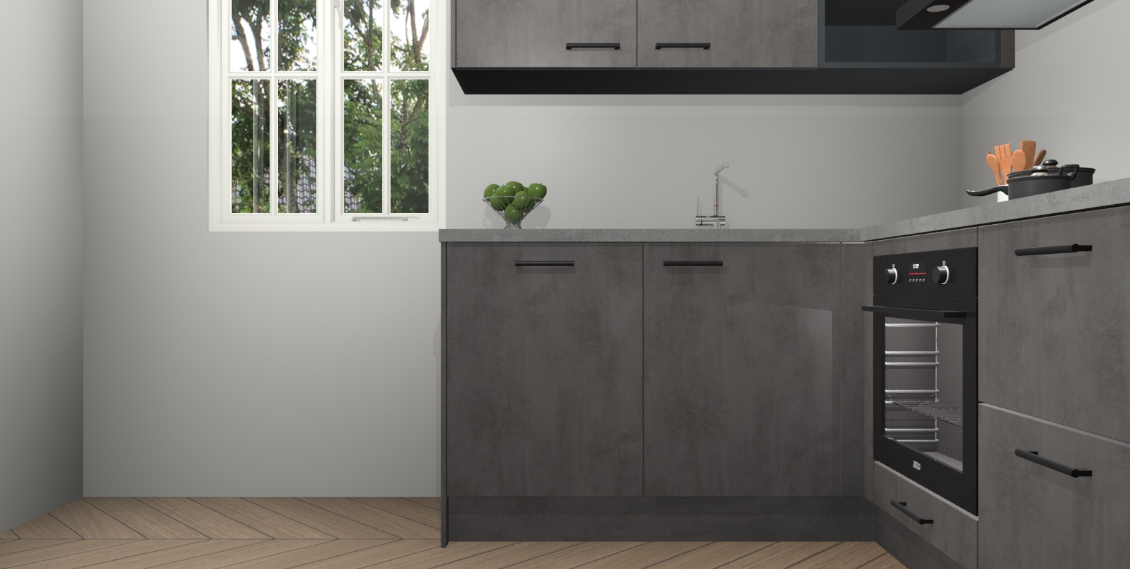 Maak kennis met de Beton Antraciet keuken Boekarest, een moderne hoekkeuken waar al uw vrienden en familie jaloers op zullen zijn! Het verbluffende mooie ontwerp past in elk interieur en is een ideale keuze voor wie op zoek is naar een klassieke, maar verfijnde look.