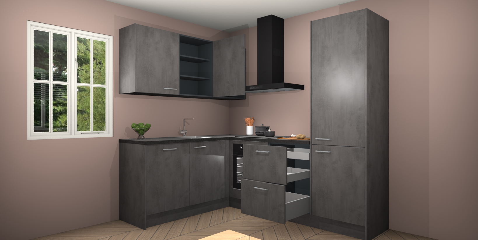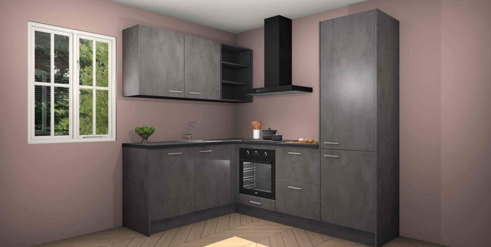 Maak kennis met de Beton Antraciet keuken Boekarest, een moderne hoekkeuken waar al uw vrienden en familie jaloers op zullen zijn! Het verbluffende mooie ontwerp past in elk interieur en is een ideale keuze voor wie op zoek is naar een klassieke, maar verfijnde look.