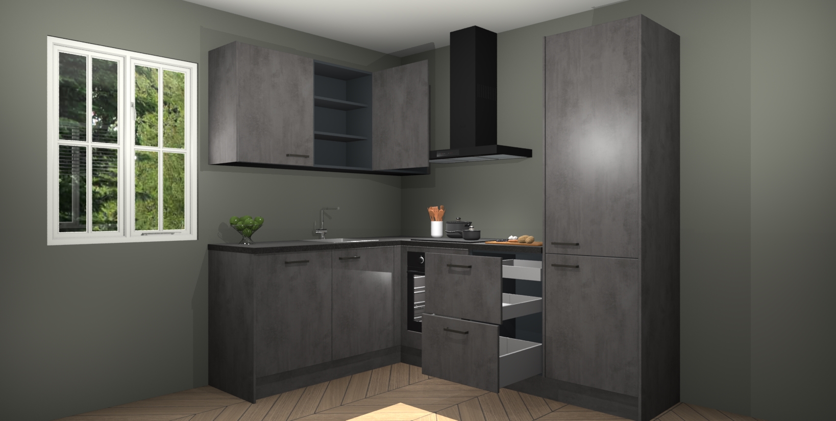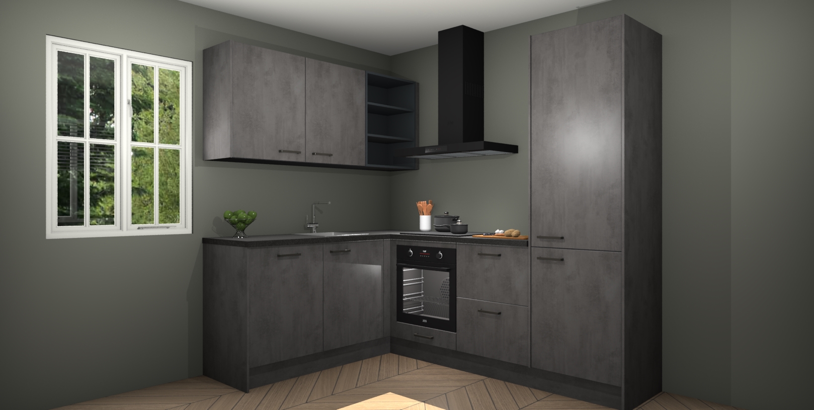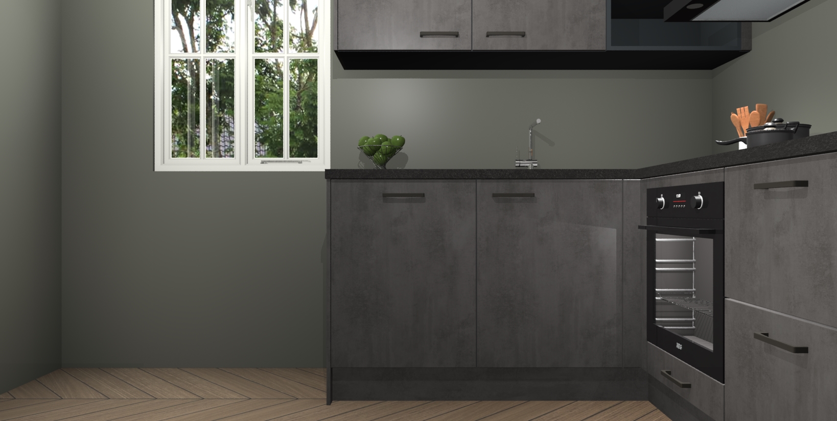 Maak kennis met de Beton Antraciet keuken Boekarest, een moderne hoekkeuken waar al uw vrienden en familie jaloers op zullen zijn! Het verbluffende mooie ontwerp past in elk interieur en is een ideale keuze voor wie op zoek is naar een klassieke, maar verfijnde look.