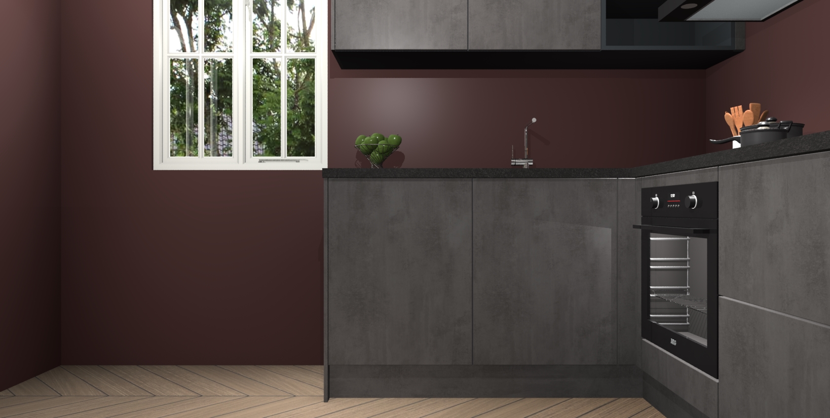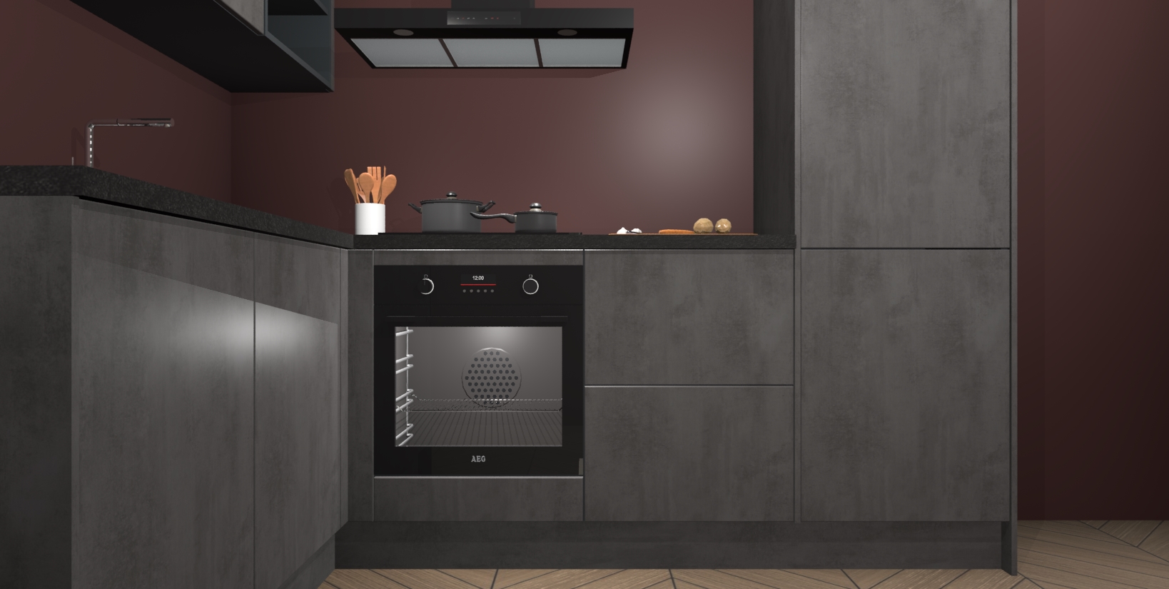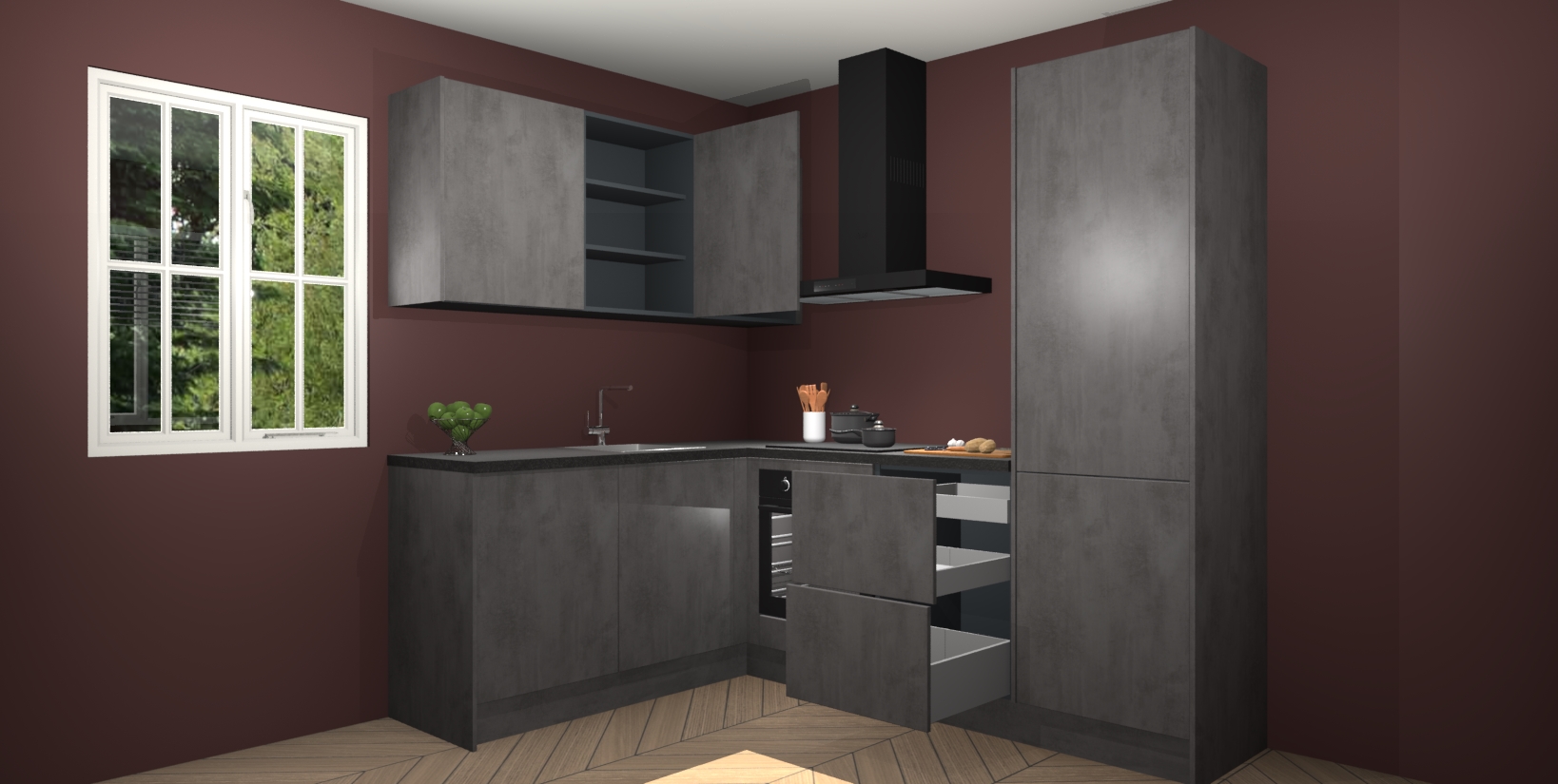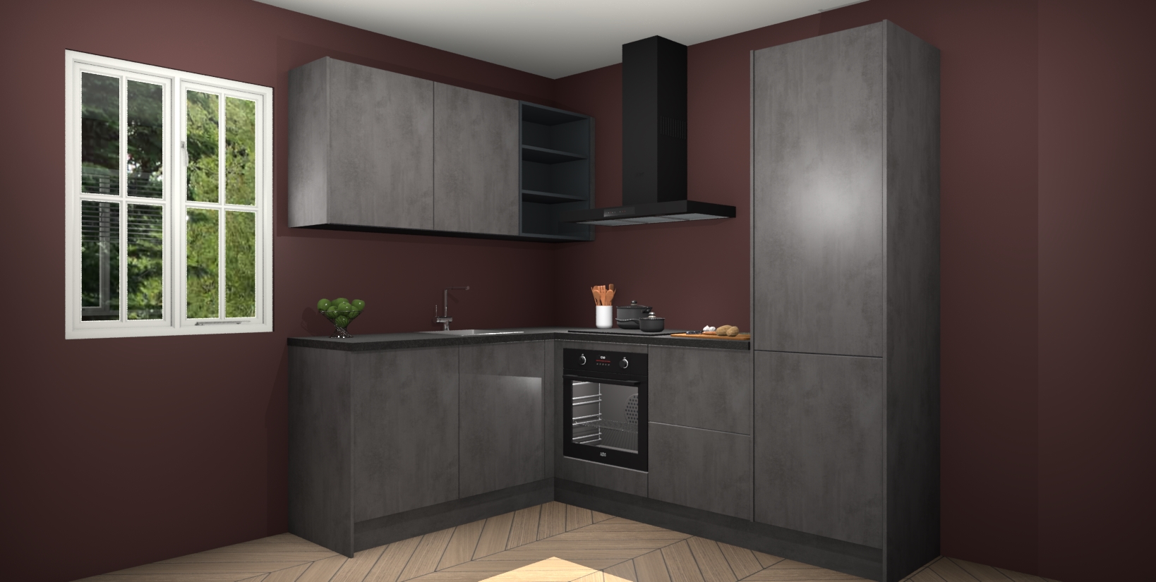 Maak kennis met de Beton Antraciet keuken Boekarest, een moderne hoekkeuken waar al uw vrienden en familie jaloers op zullen zijn! Het verbluffende mooie ontwerp past in elk interieur en is een ideale keuze voor wie op zoek is naar een klassieke, maar verfijnde look.