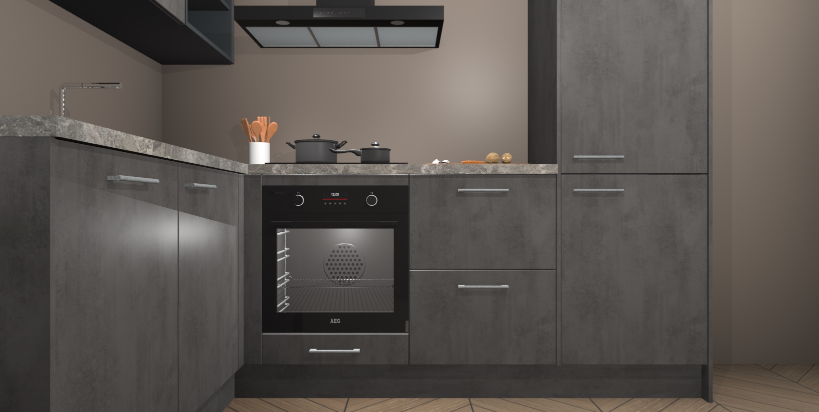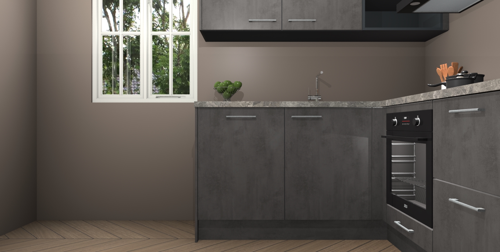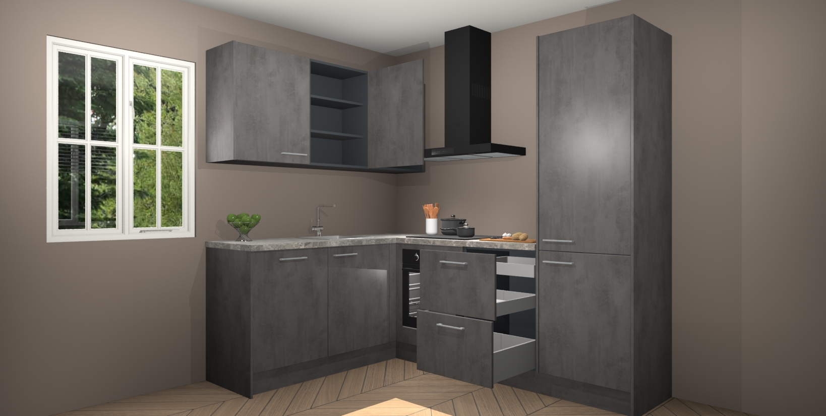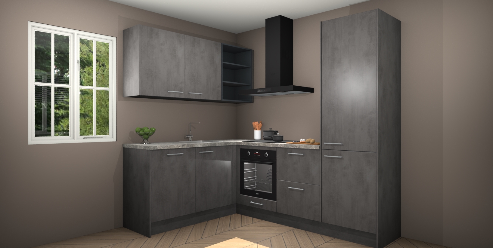 Maak kennis met de Beton Antraciet keuken Boekarest, een moderne hoekkeuken waar al uw vrienden en familie jaloers op zullen zijn! Het verbluffende mooie ontwerp past in elk interieur en is een ideale keuze voor wie op zoek is naar een klassieke, maar verfijnde look.