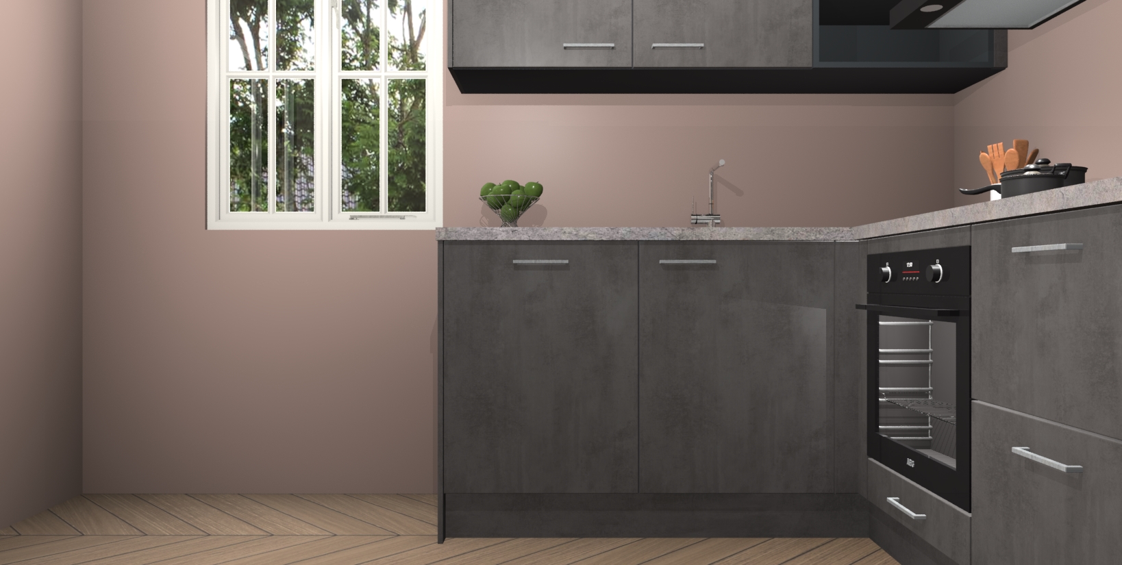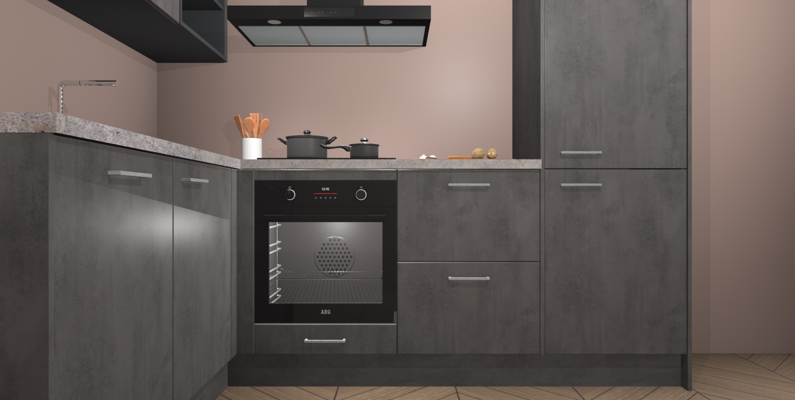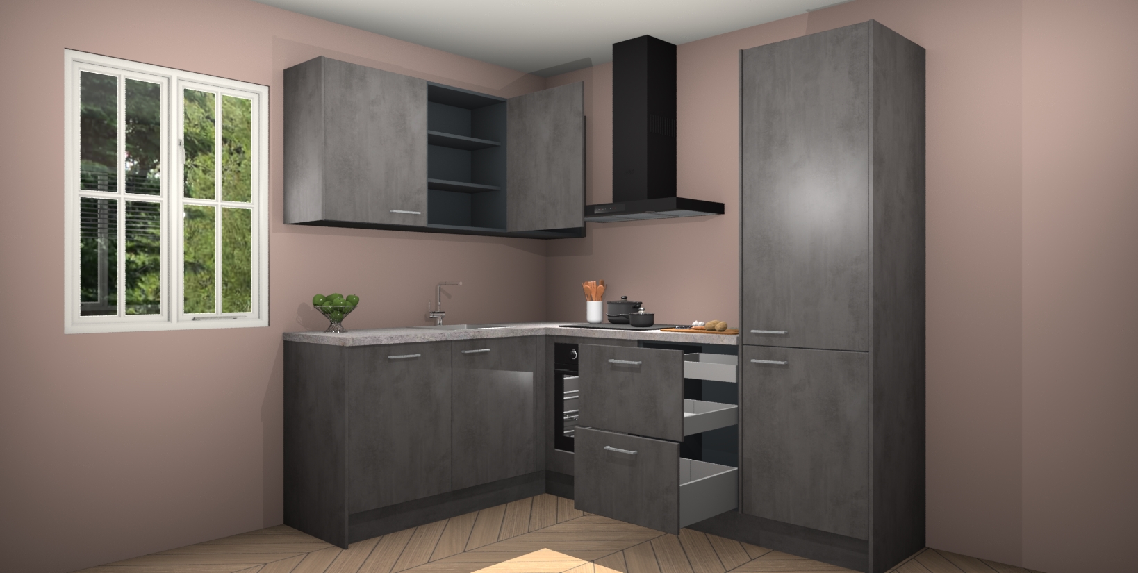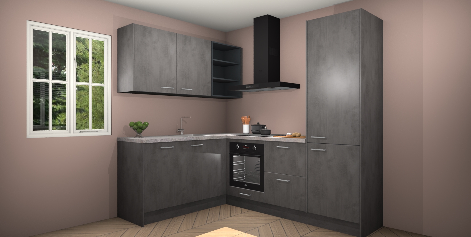 Maak kennis met de Beton Antraciet keuken Boekarest, een moderne hoekkeuken waar al uw vrienden en familie jaloers op zullen zijn! Het verbluffende mooie ontwerp past in elk interieur en is een ideale keuze voor wie op zoek is naar een klassieke, maar verfijnde look.