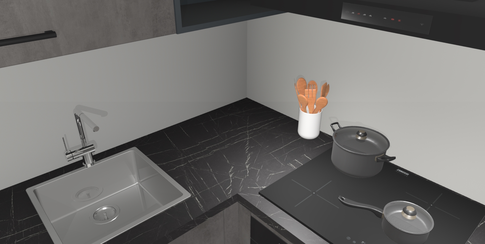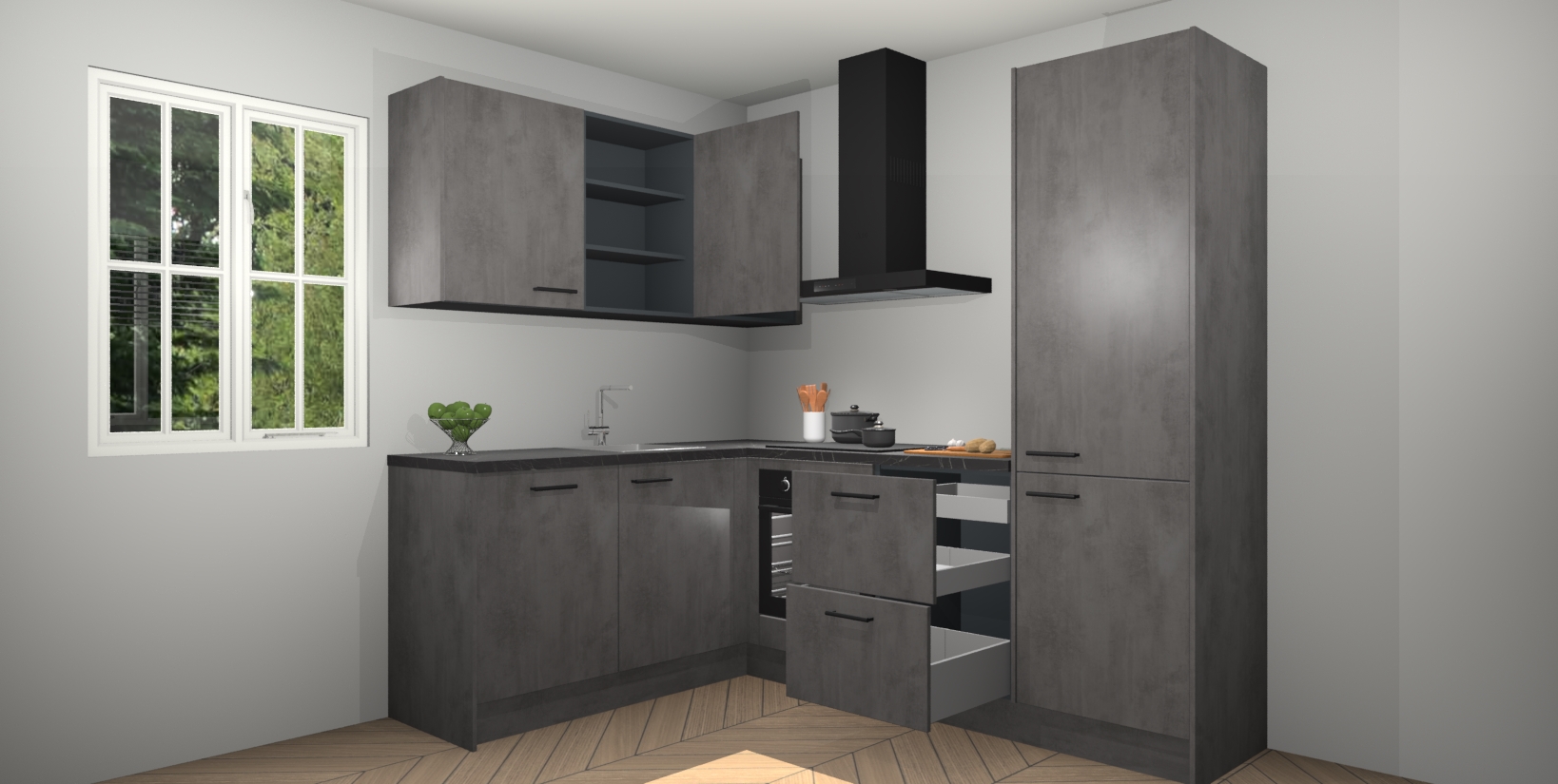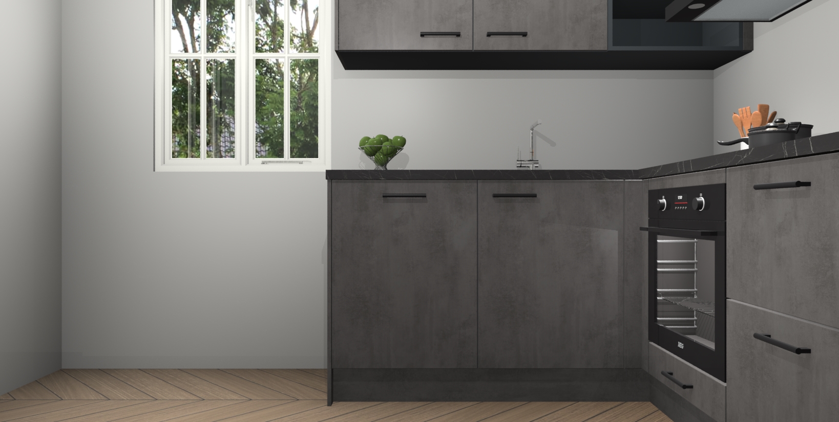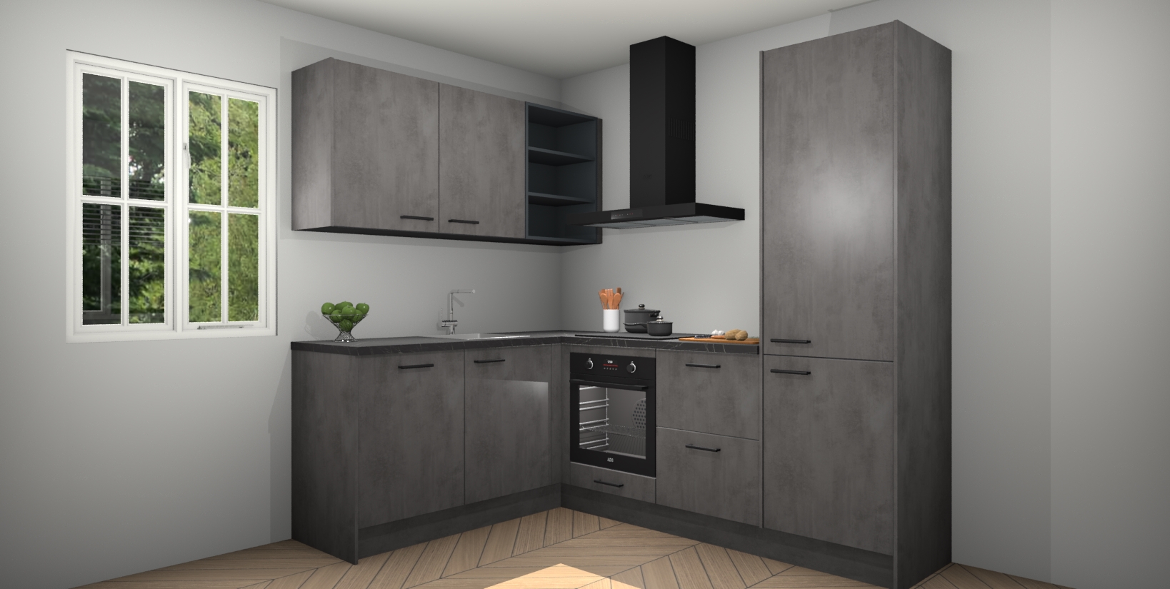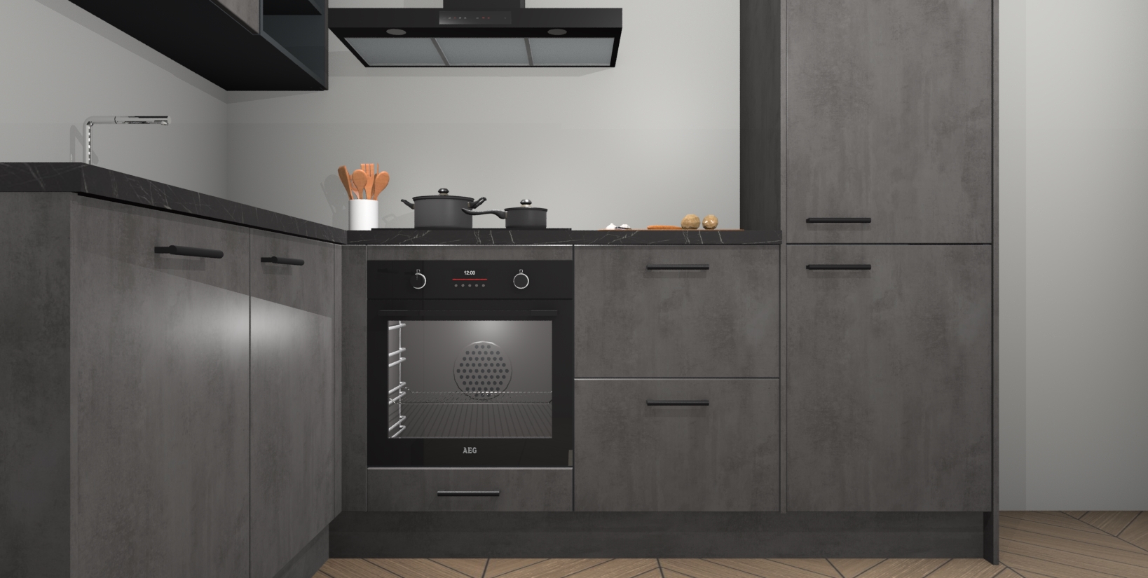Maak kennis met de Beton Antraciet keuken Boekarest, een moderne hoekkeuken waar al uw vrienden en familie jaloers op zullen zijn! Het verbluffende mooie ontwerp past in elk interieur en is een ideale keuze voor wie op zoek is naar een klassieke, maar verfijnde look.