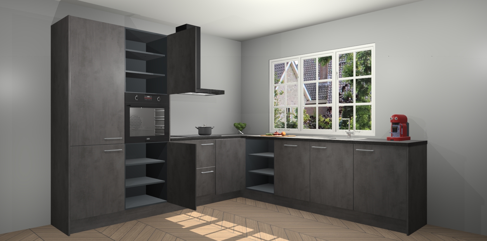 Welkom in de nieuwe wereld van een moderne keuken: de Beton Antraciet keuken Casablanca! Met dit innovatieve keukendesign haalt u de natuur naar binnen. Neem plaats aan uw hout-look keuken en voel u verbonden met de prachtige Beton Antraciet kleur. Zeer gebruiksvriendelijk, ervaring door prettige materialen en kleur die perfect aansluiten bij uw sfeerkeuze in huis.