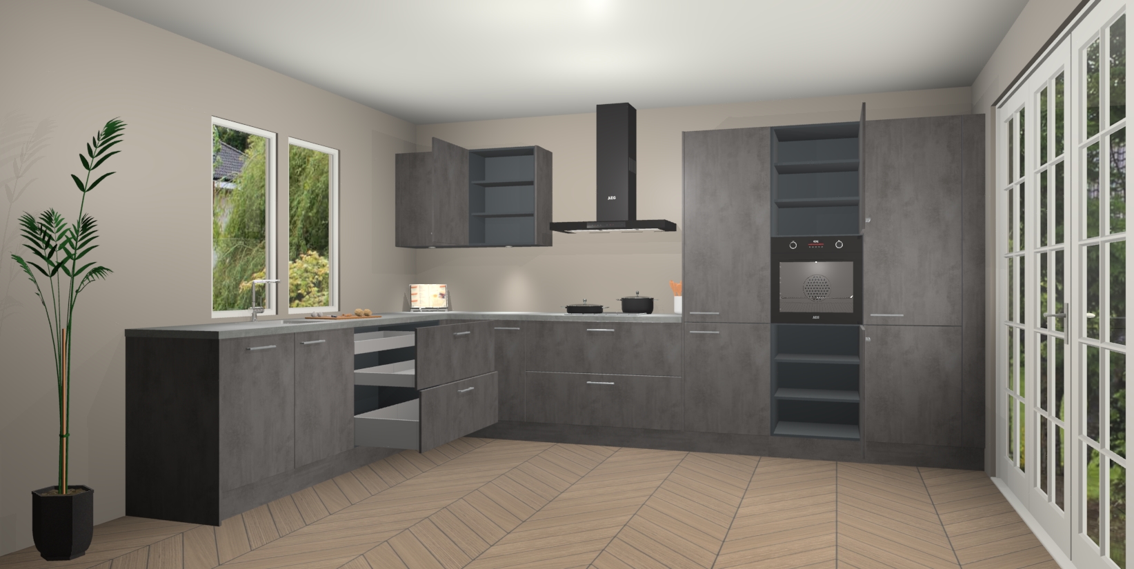 Heeft u nog apparatuur nodig? Geen probleem: de Beton Antraciet keuken Debrecen bevat vijf ingebouwde apparaten - een oven, inductiekookplaat, afzuigkap, vaatwasser en koelkast - die gemakkelijk kunnen worden bijgewerkt naar AEG na bestelling. En als dat nog niet genoeg is; onze kasten worden pre-geassembleerd geleverd en zijn verkrijgbaar tegen een vastgeroeste lage prijs! U hoeft nooit meer te zoeken naar goede kwaliteit en service want onze producten hebben echt Duitse kwaliteit.