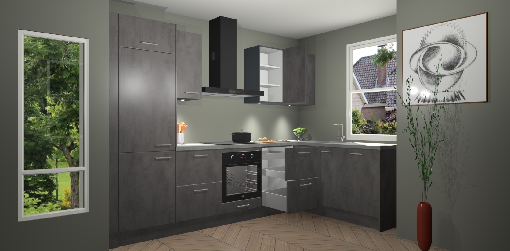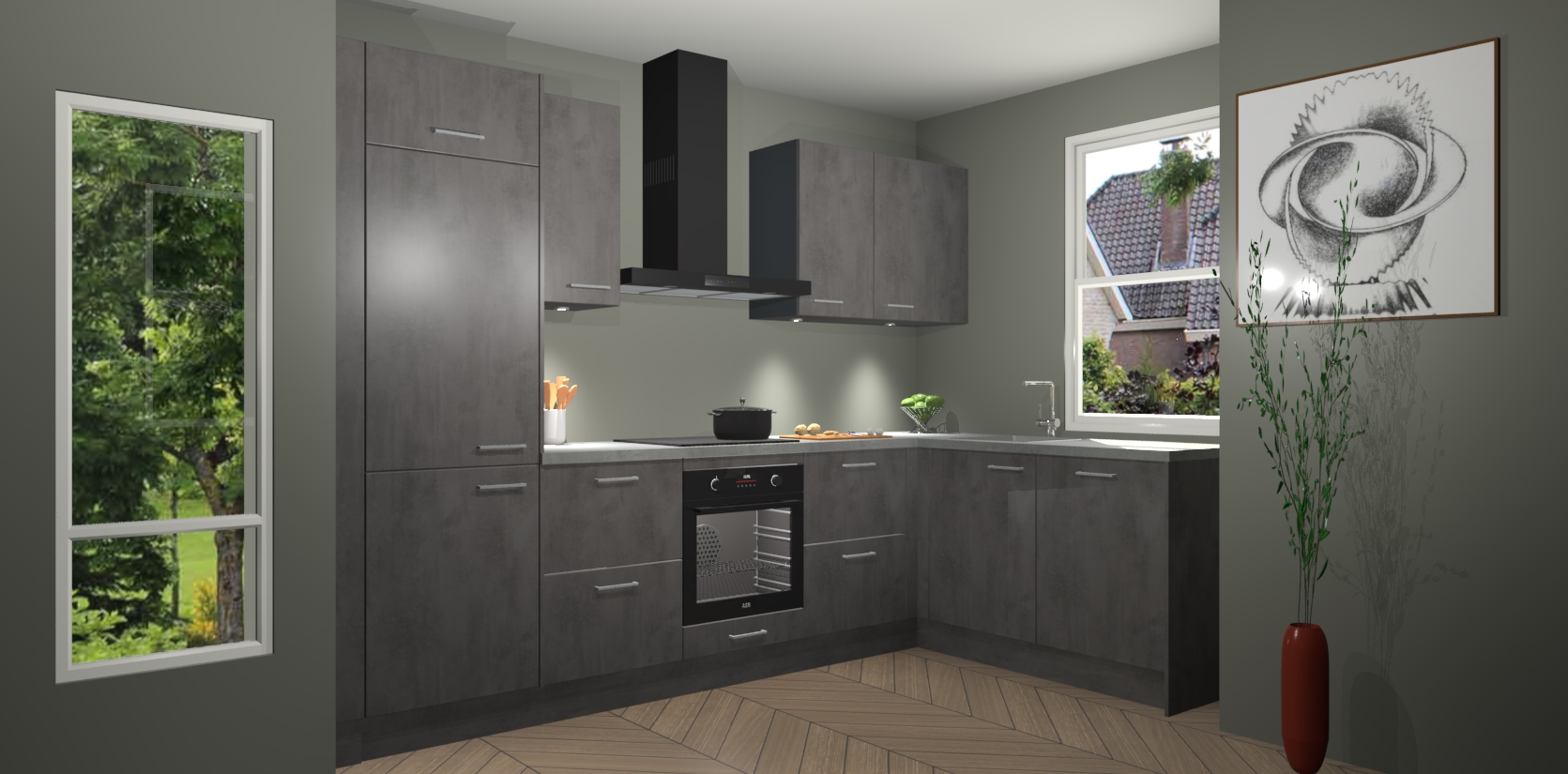 De Beton Antraciet keuken Geneve is precies wat u nodig heeft als u op zoek bent naar modern design, versmolten met tijdloze schoonheid. De strakke afwerking voegt klasse toe terwijl het toch een uitnodigende sfeer behoudt; zeker om zowel gasten als uzelf te inspireren om in stijl te gaan koken! En nog beter, het zal uw budget niet breken - dus waarom wachten? Met de Beton Antraciet keuken Geneve bent u verzekerd van kwaliteit zonder in te leveren op de prijs!