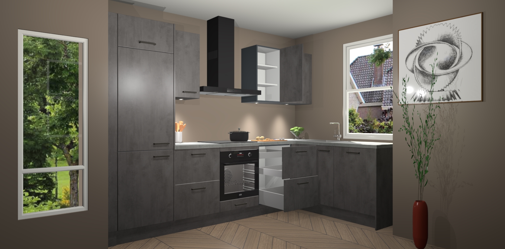 De Beton Antraciet keuken Geneve is precies wat u nodig heeft als u op zoek bent naar modern design, versmolten met tijdloze schoonheid. De strakke afwerking voegt klasse toe terwijl het toch een uitnodigende sfeer behoudt; zeker om zowel gasten als uzelf te inspireren om in stijl te gaan koken! En nog beter, het zal uw budget niet breken - dus waarom wachten? Met de Beton Antraciet keuken Geneve bent u verzekerd van kwaliteit zonder in te leveren op de prijs!