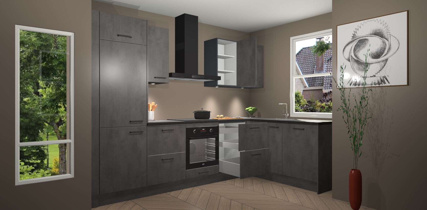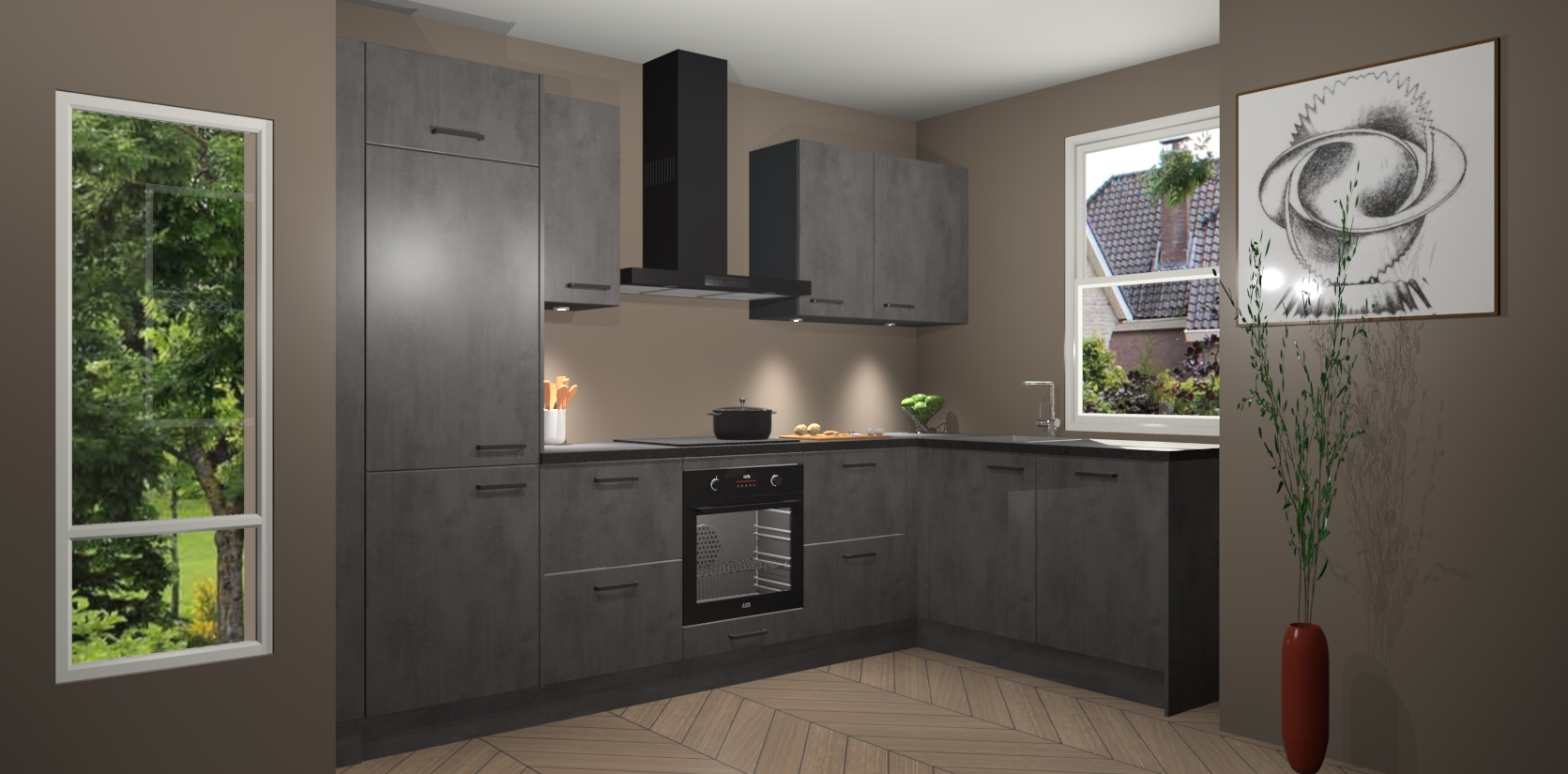 De Beton Antraciet keuken Geneve is uitgerust met 5 inbouwapparaten - een oven, inductiekookplaat, afzuigkap, vaatwasser en koelkast - voor al uw kook- en bewaarbehoeftes. U kunt deze apparaten desgewenst eenvoudig upgraden naar AEG of de oven omruilen voor een combimagnetron na het plaatsen van uw bestelling. En met de soft close deuren, voldoende opbergruimte en kasten die voorgemonteerd worden geleverd, bent u in een mum van tijd klaar om heerlijke maaltijden te bereiden!