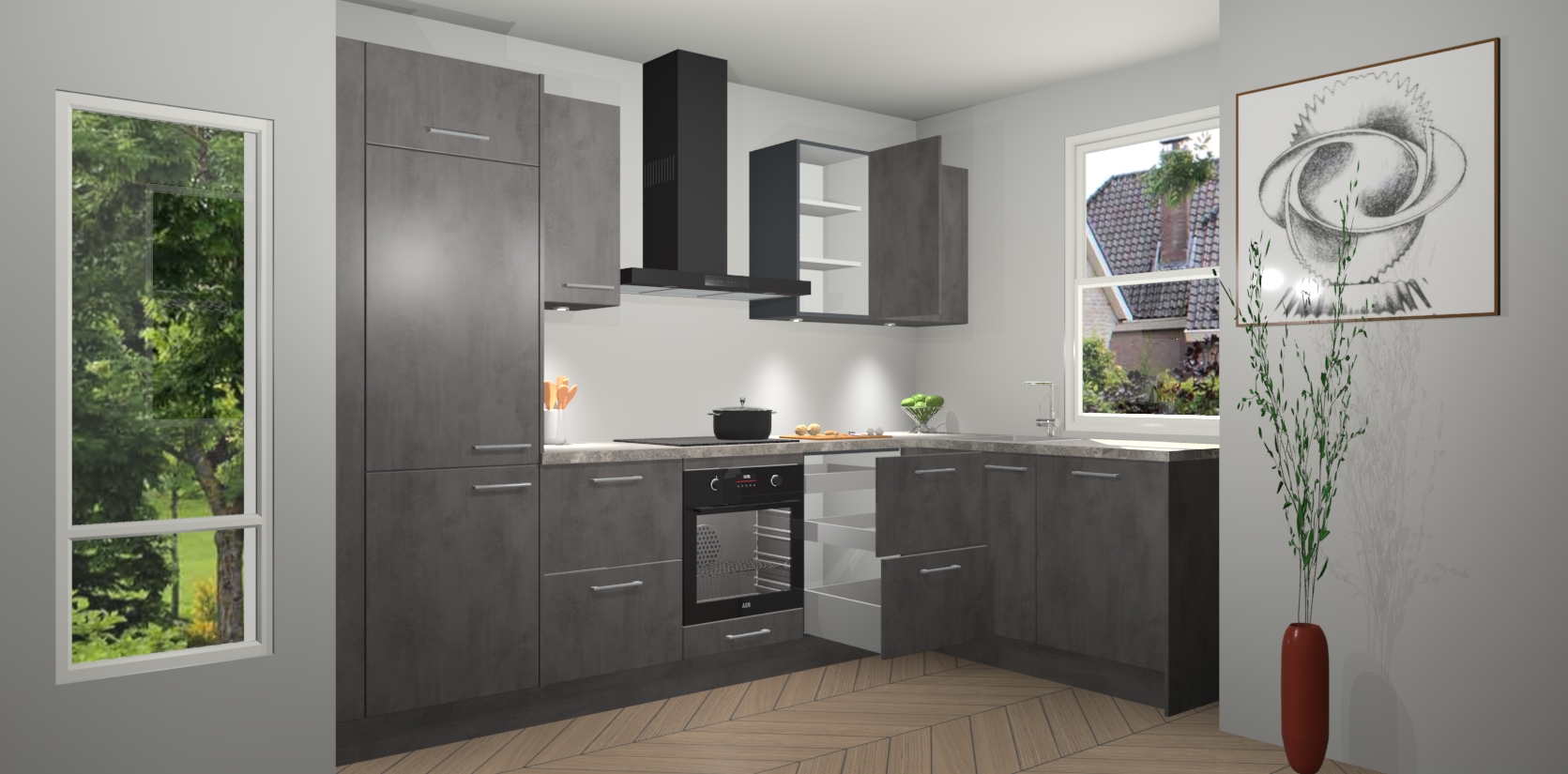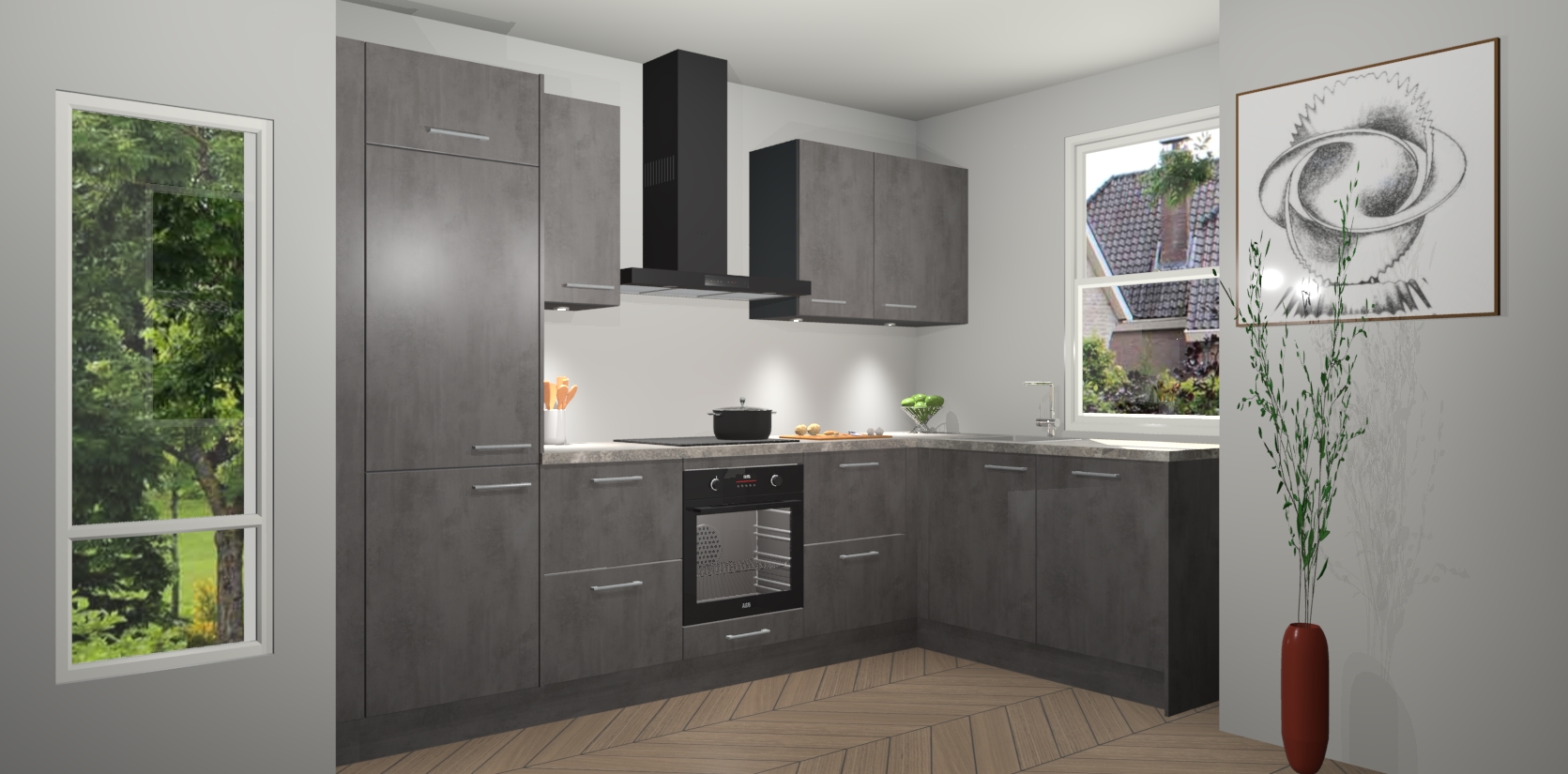 De Beton Antraciet keuken Geneve is precies wat u nodig heeft als u op zoek bent naar modern design, versmolten met tijdloze schoonheid. De strakke afwerking voegt klasse toe terwijl het toch een uitnodigende sfeer behoudt; zeker om zowel gasten als uzelf te inspireren om in stijl te gaan koken! En nog beter, het zal uw budget niet breken - dus waarom wachten? Met de Beton Antraciet keuken Geneve bent u verzekerd van kwaliteit zonder in te leveren op de prijs!