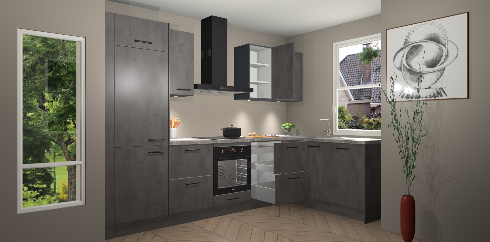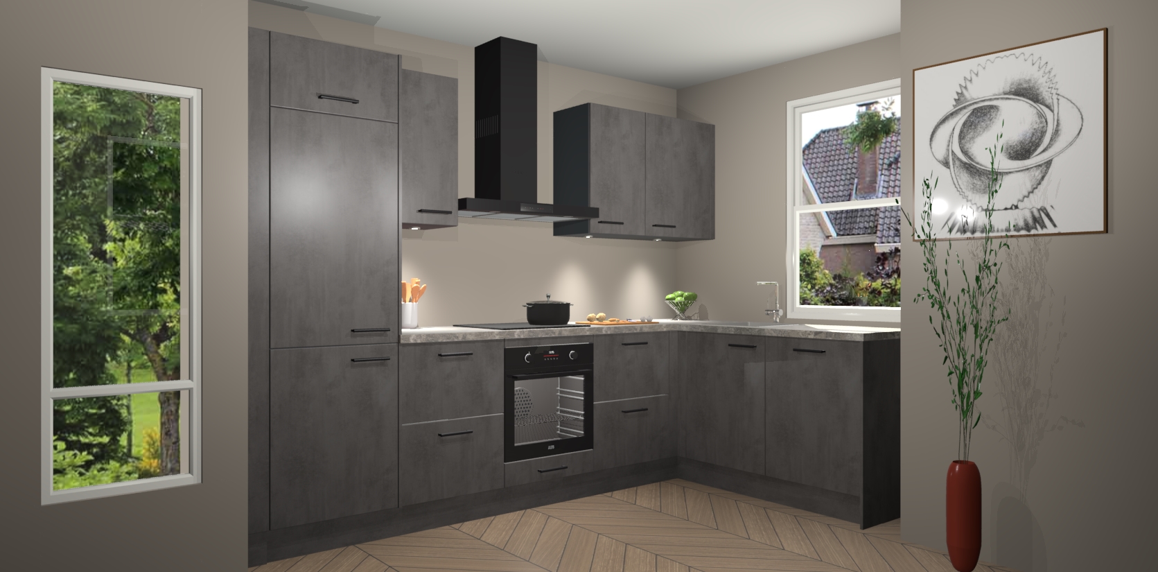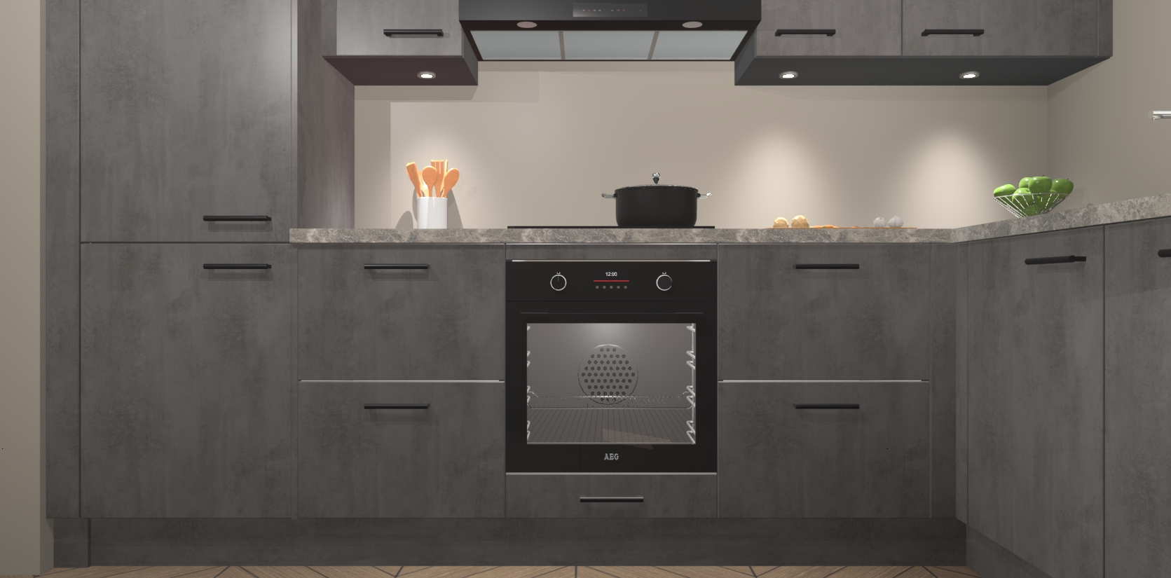 De Beton Antraciet keuken Geneve is uitgerust met 5 inbouwapparaten - een oven, inductiekookplaat, afzuigkap, vaatwasser en koelkast - voor al uw kook- en bewaarbehoeftes. U kunt deze apparaten desgewenst eenvoudig upgraden naar AEG of de oven omruilen voor een combimagnetron na het plaatsen van uw bestelling. En met de soft close deuren, voldoende opbergruimte en kasten die voorgemonteerd worden geleverd, bent u in een mum van tijd klaar om heerlijke maaltijden te bereiden!