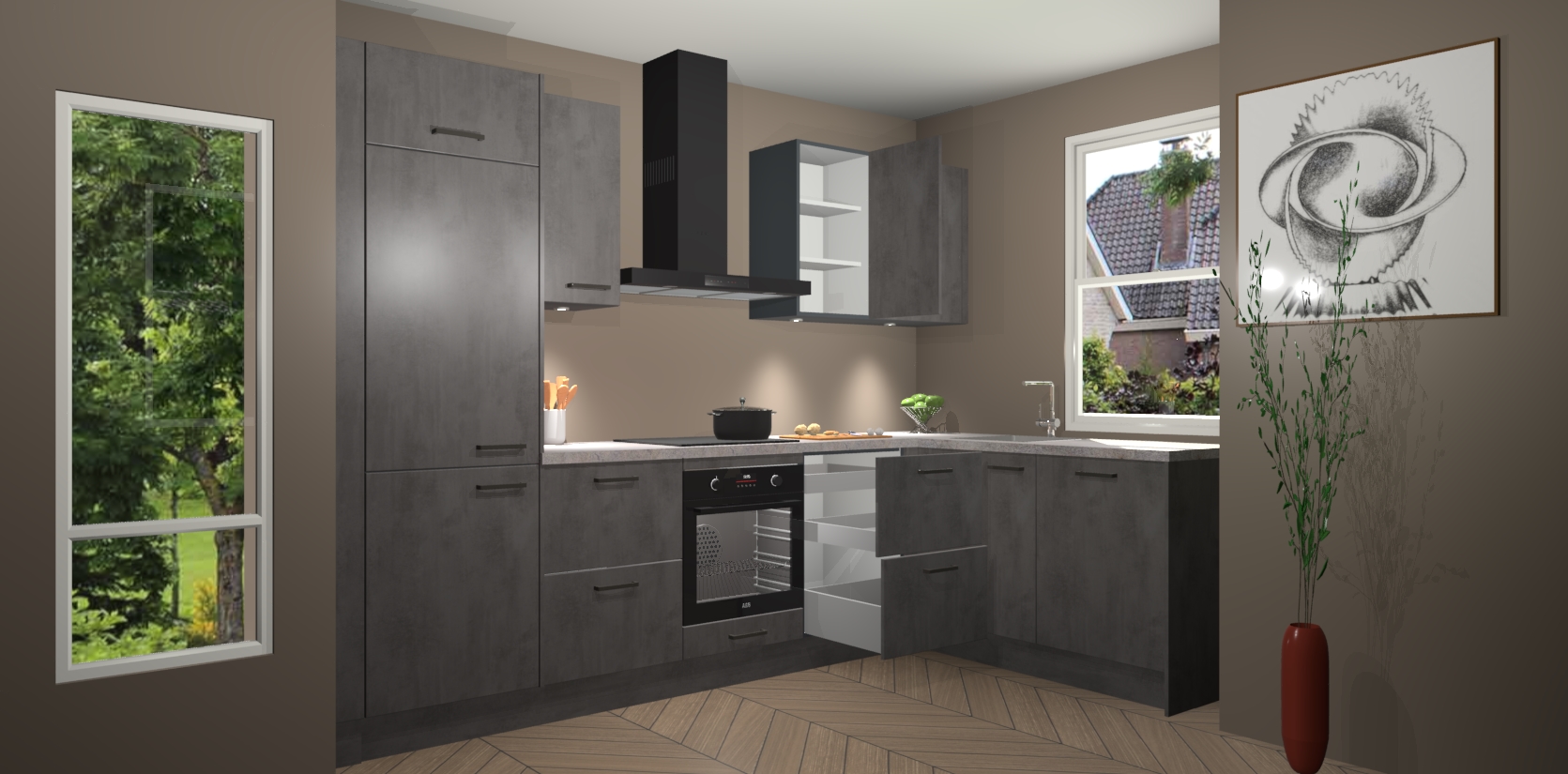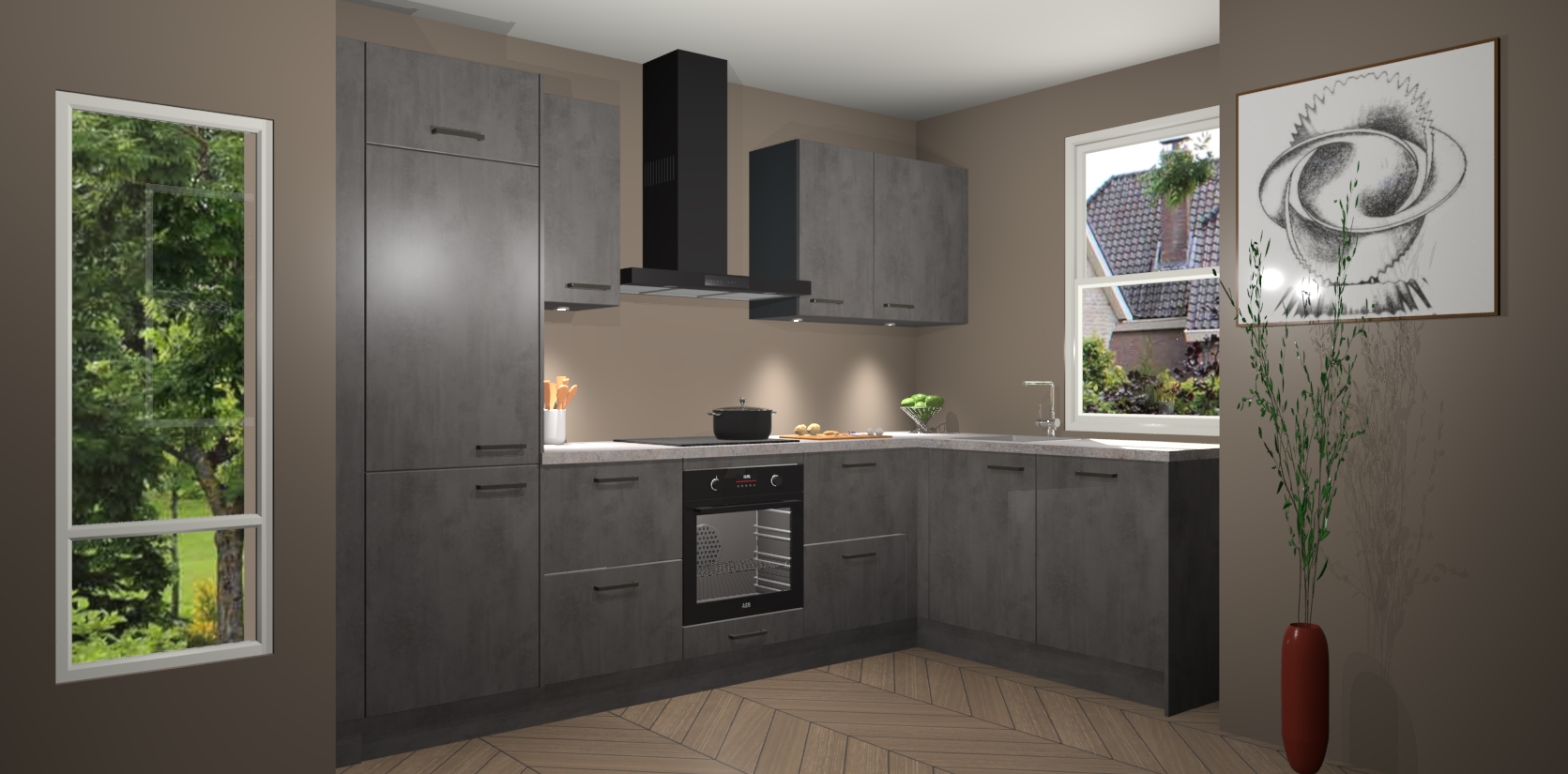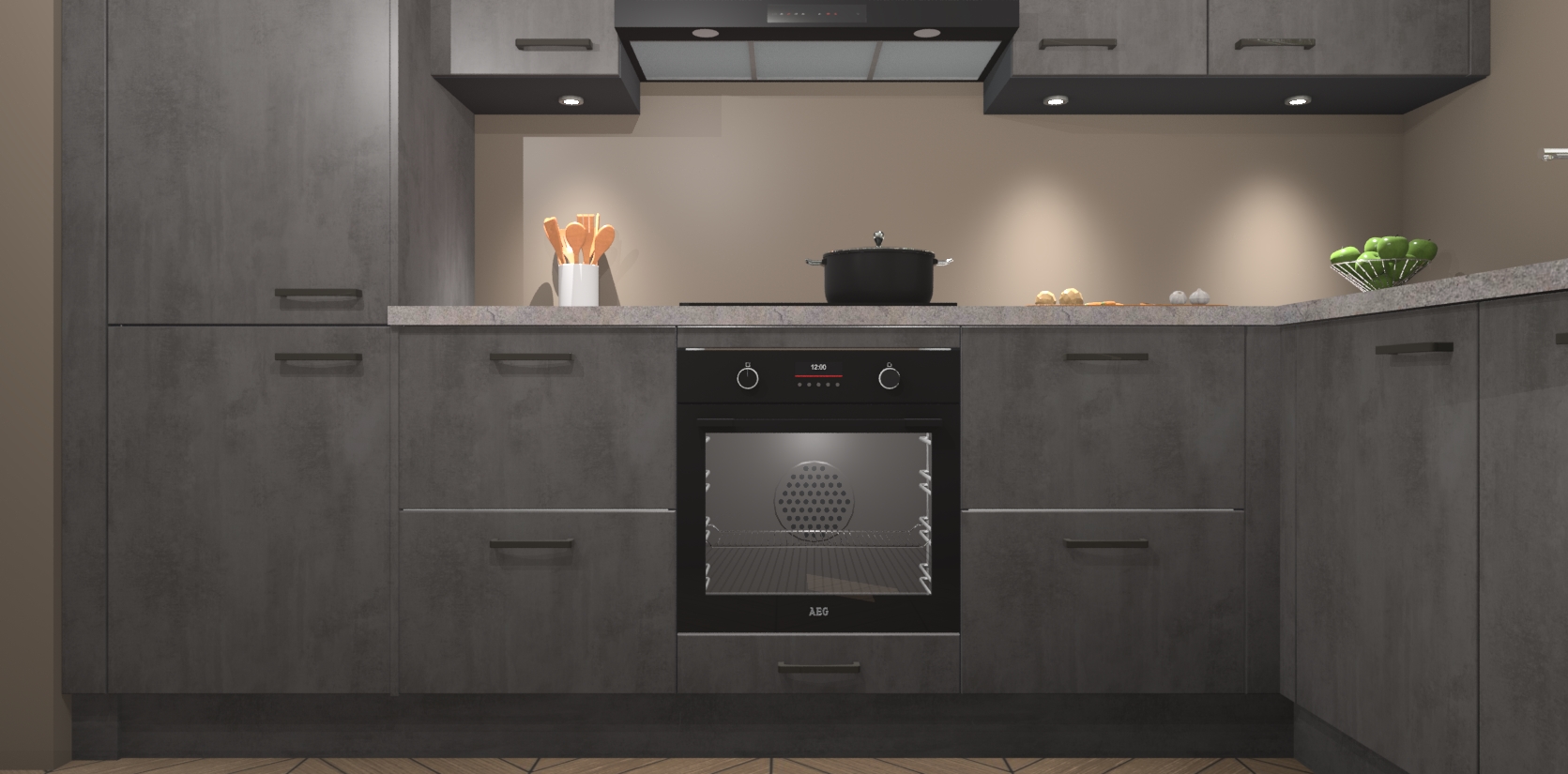 De Beton Antraciet keuken Geneve is uitgerust met 5 inbouwapparaten - een oven, inductiekookplaat, afzuigkap, vaatwasser en koelkast - voor al uw kook- en bewaarbehoeftes. U kunt deze apparaten desgewenst eenvoudig upgraden naar AEG of de oven omruilen voor een combimagnetron na het plaatsen van uw bestelling. En met de soft close deuren, voldoende opbergruimte en kasten die voorgemonteerd worden geleverd, bent u in een mum van tijd klaar om heerlijke maaltijden te bereiden!