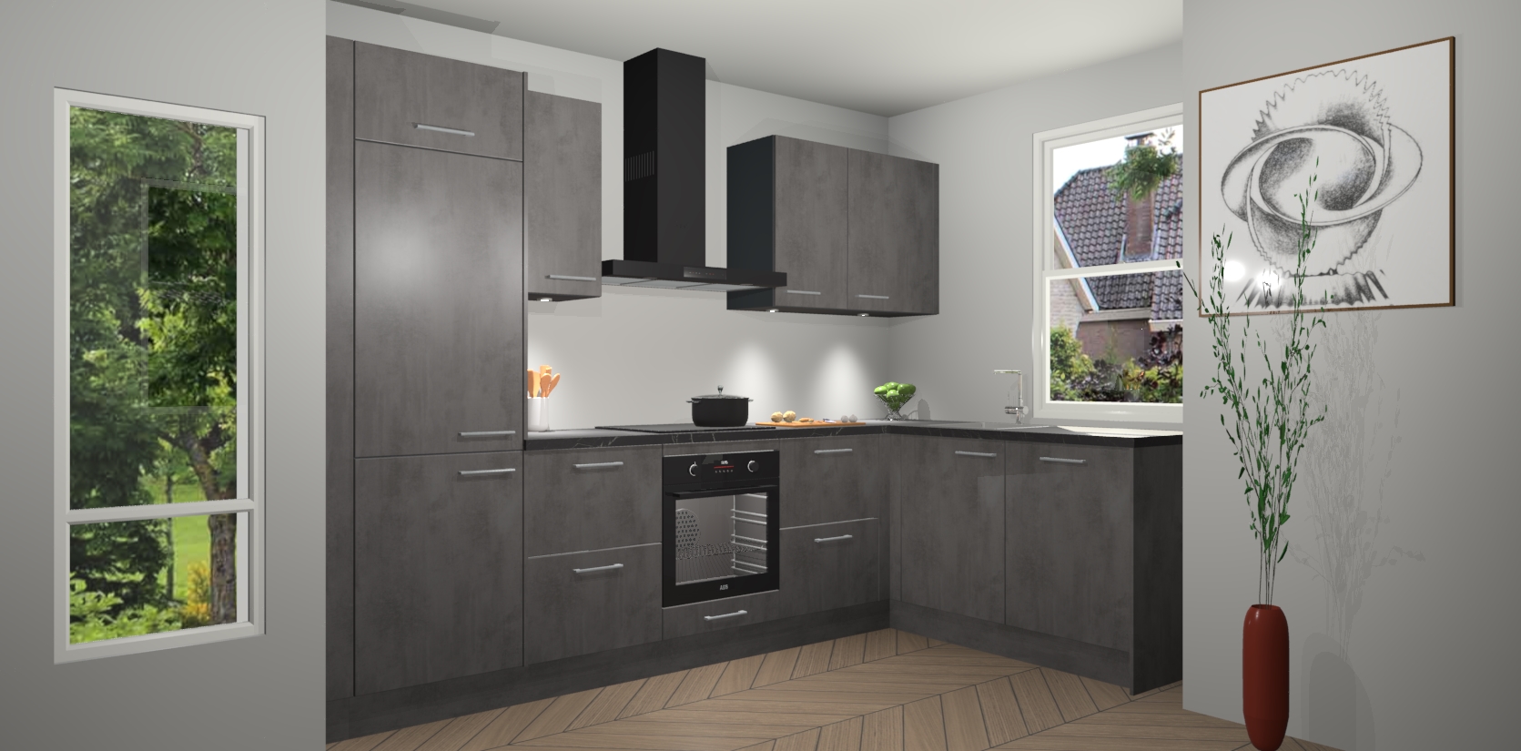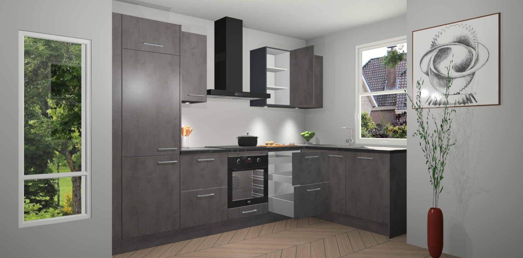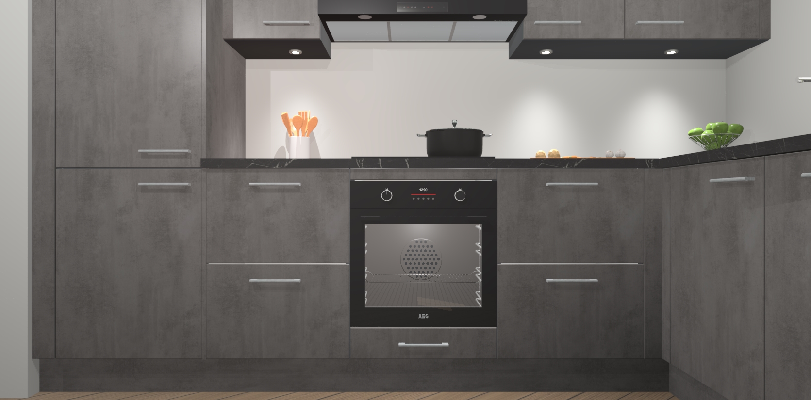 De Beton Antraciet keuken Geneve is uitgerust met 5 inbouwapparaten - een oven, inductiekookplaat, afzuigkap, vaatwasser en koelkast - voor al uw kook- en bewaarbehoeftes. U kunt deze apparaten desgewenst eenvoudig upgraden naar AEG of de oven omruilen voor een combimagnetron na het plaatsen van uw bestelling. En met de soft close deuren, voldoende opbergruimte en kasten die voorgemonteerd worden geleverd, bent u in een mum van tijd klaar om heerlijke maaltijden te bereiden!