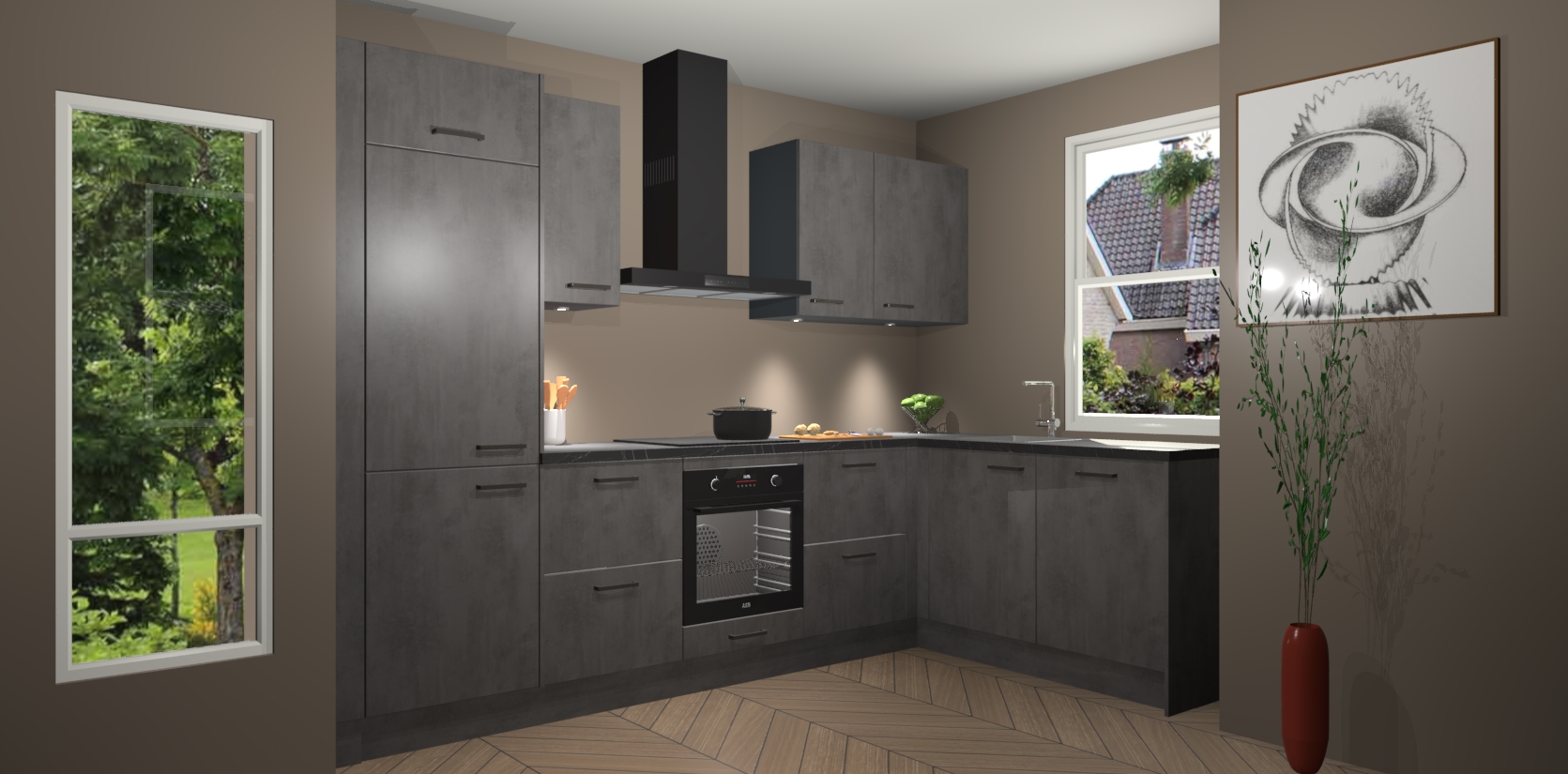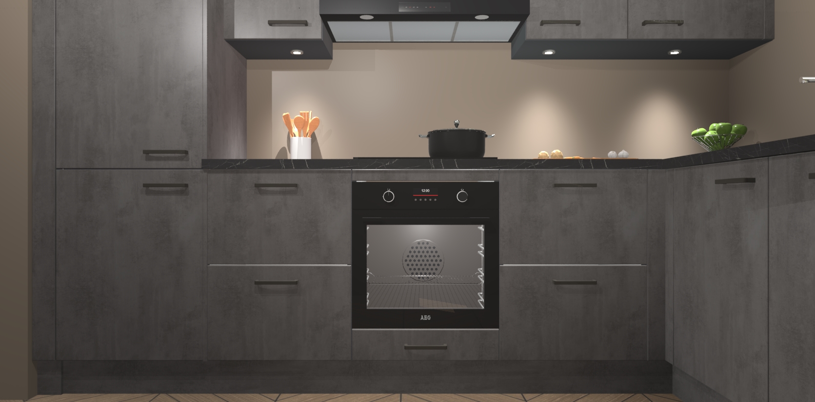 De Beton Antraciet keuken Geneve is uitgerust met 5 inbouwapparaten - een oven, inductiekookplaat, afzuigkap, vaatwasser en koelkast - voor al uw kook- en bewaarbehoeftes. U kunt deze apparaten desgewenst eenvoudig upgraden naar AEG of de oven omruilen voor een combimagnetron na het plaatsen van uw bestelling. En met de soft close deuren, voldoende opbergruimte en kasten die voorgemonteerd worden geleverd, bent u in een mum van tijd klaar om heerlijke maaltijden te bereiden!