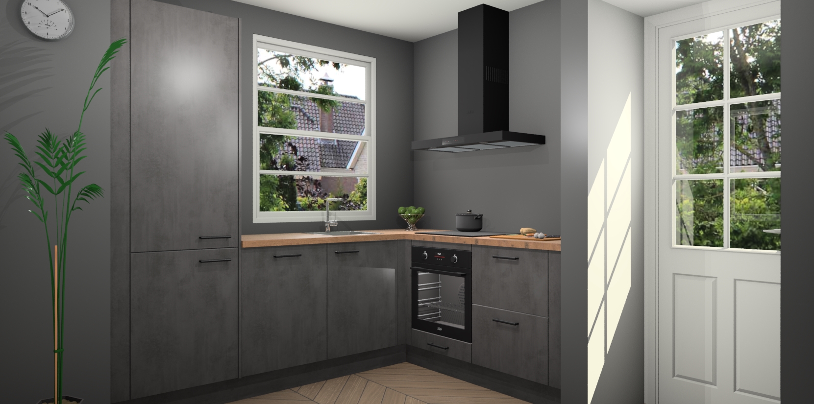 Wilt u een echte aanwinst voor uw keuken, maar bent u op zoek naar iets specialers dan de standaardkeukens? Kies dan voor de Beton Antraciet keuken Harbin! Dit prachtige hoekkeukenontwerp geeft u alle ruimte om optimaal te genieten van heerlijk koken. Het uitmuntende afwerkingsniveau, de fraaie houtstructuur en de sfeervolle zwarte grepen maken van de Beton Antraciet keuken Harbin de perfecte keuze voor zowel enthousiaste thuiskoks als design-minded interieurliefhebbers.