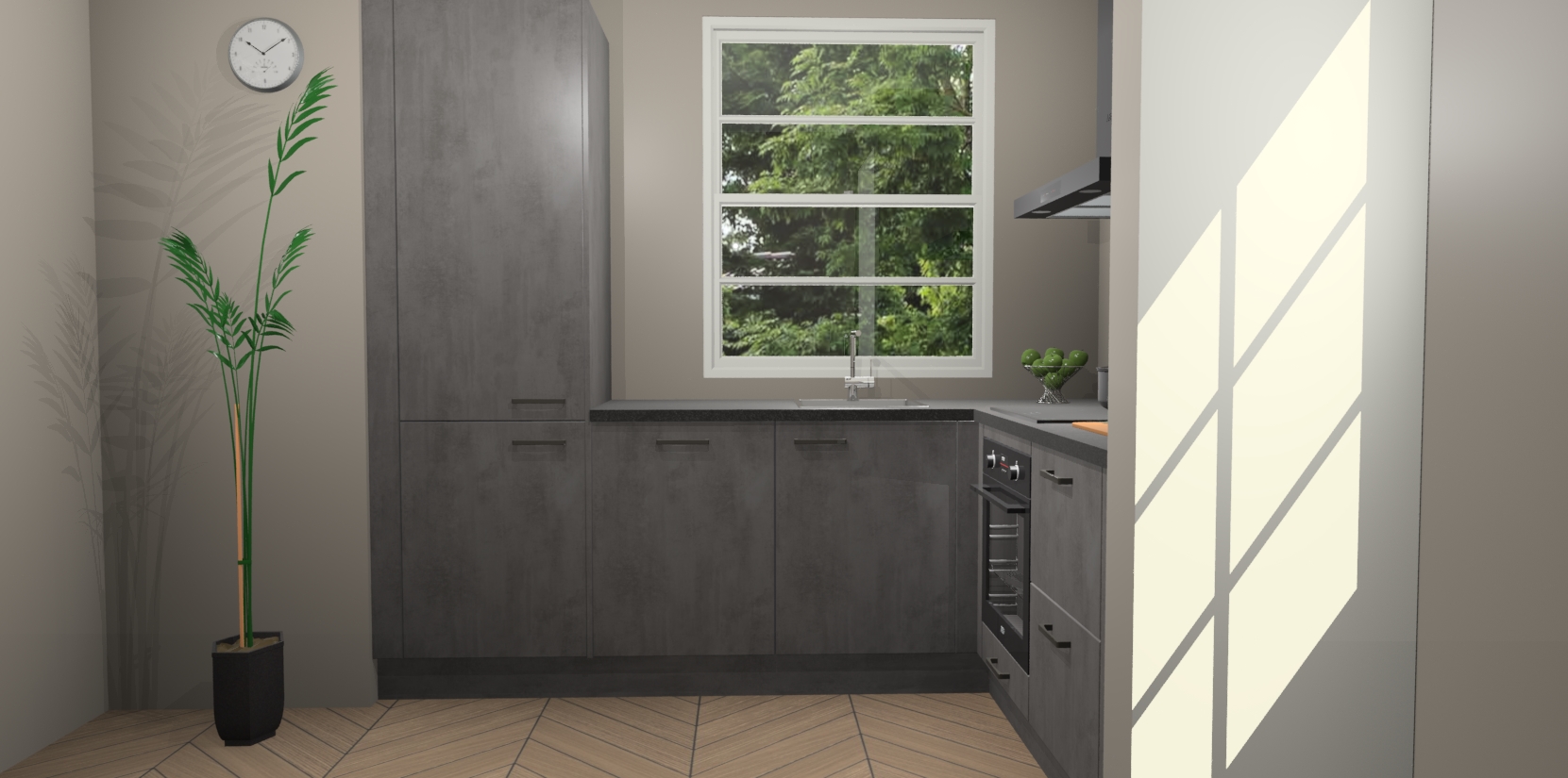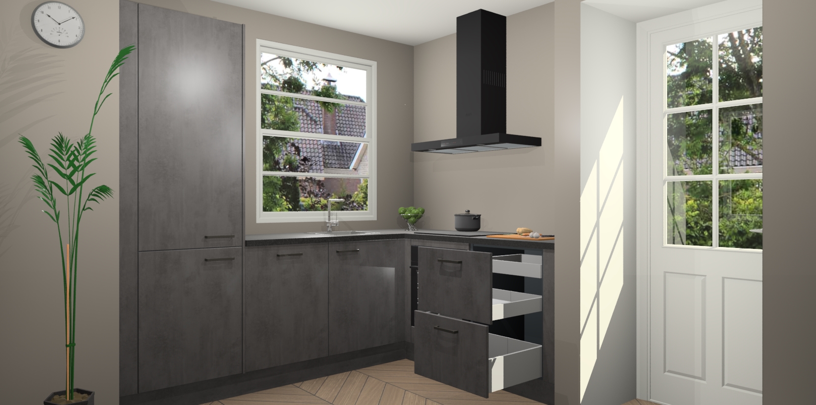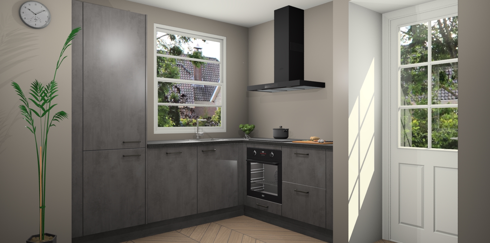Wilt u een echte aanwinst voor uw keuken, maar bent u op zoek naar iets specialers dan de standaardkeukens? Kies dan voor de Beton Antraciet keuken Harbin! Dit prachtige hoekkeukenontwerp geeft u alle ruimte om optimaal te genieten van heerlijk koken. Het uitmuntende afwerkingsniveau, de fraaie houtstructuur en de sfeervolle zwarte grepen maken van de Beton Antraciet keuken Harbin de perfecte keuze voor zowel enthousiaste thuiskoks als design-minded interieurliefhebbers.