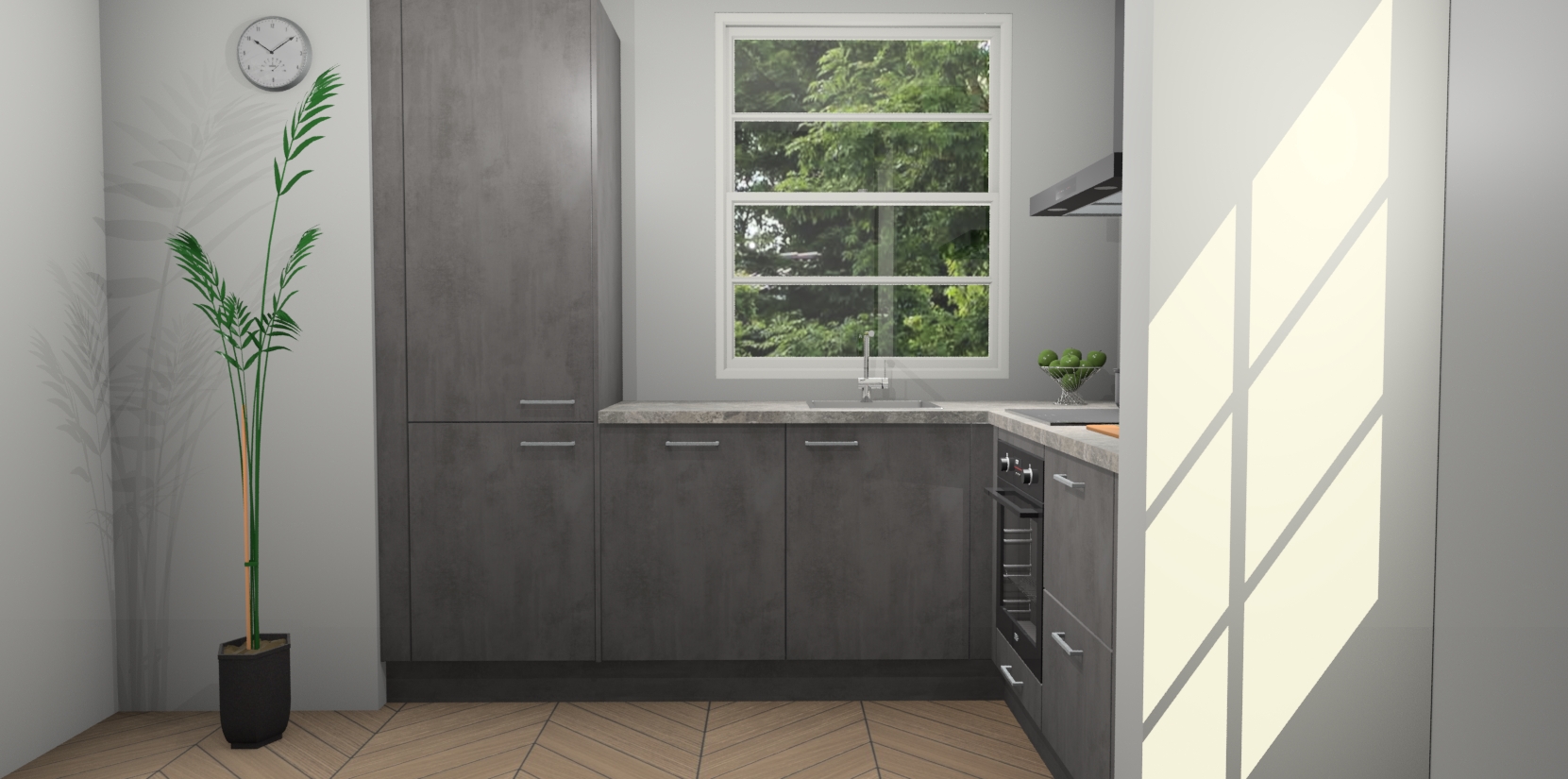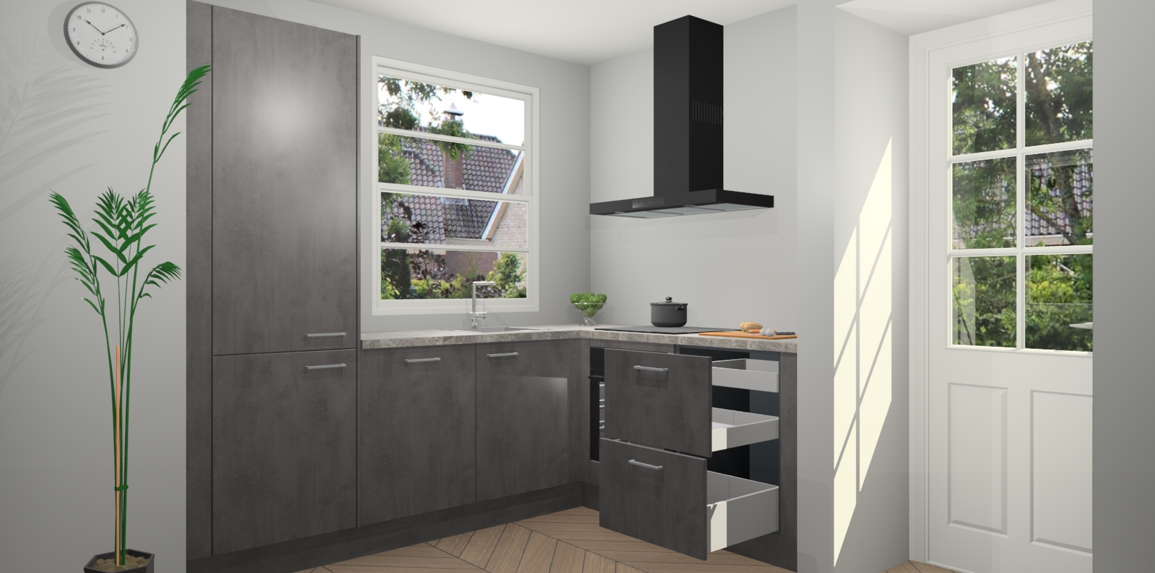 Wilt u een echte aanwinst voor uw keuken, maar bent u op zoek naar iets specialers dan de standaardkeukens? Kies dan voor de Beton Antraciet keuken Harbin! Dit prachtige hoekkeukenontwerp geeft u alle ruimte om optimaal te genieten van heerlijk koken. Het uitmuntende afwerkingsniveau, de fraaie houtstructuur en de sfeervolle zwarte grepen maken van de Beton Antraciet keuken Harbin de perfecte keuze voor zowel enthousiaste thuiskoks als design-minded interieurliefhebbers.