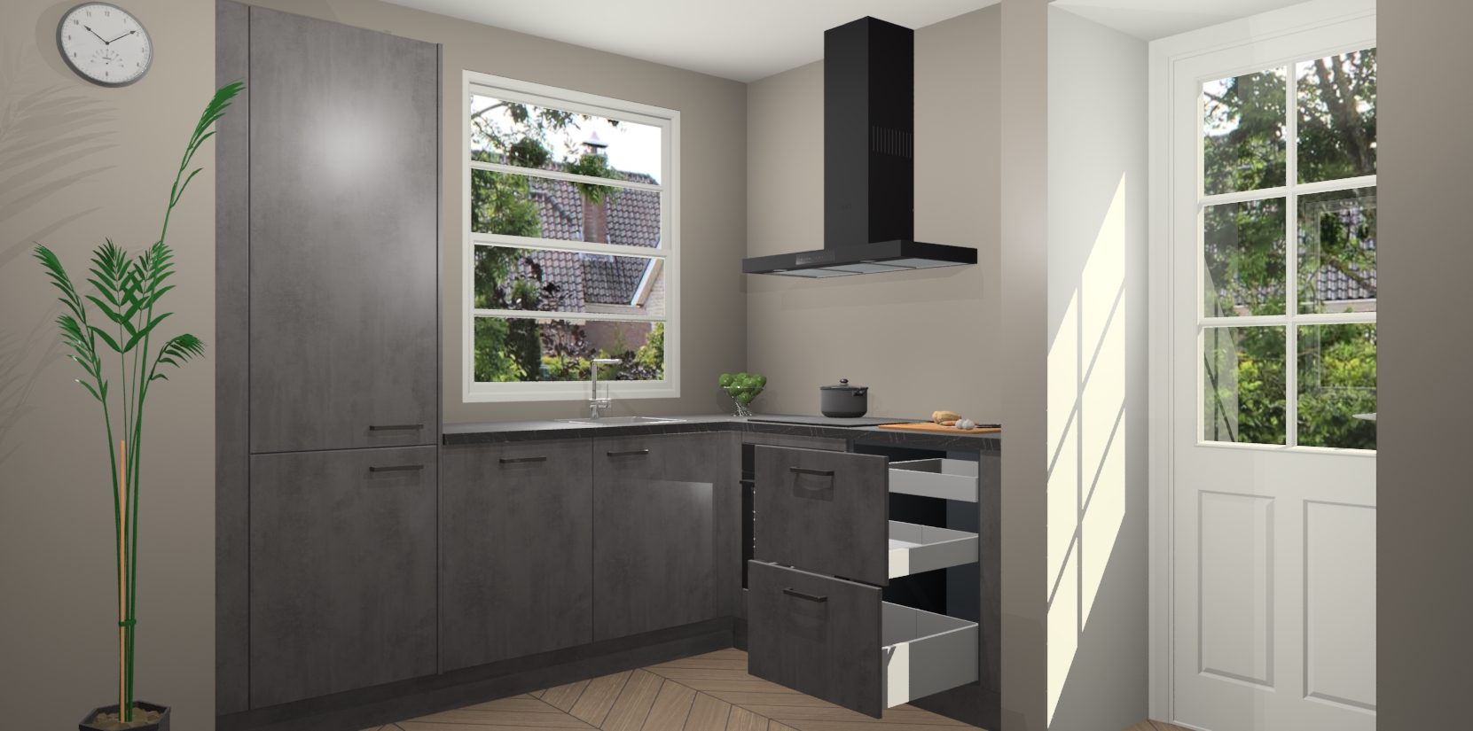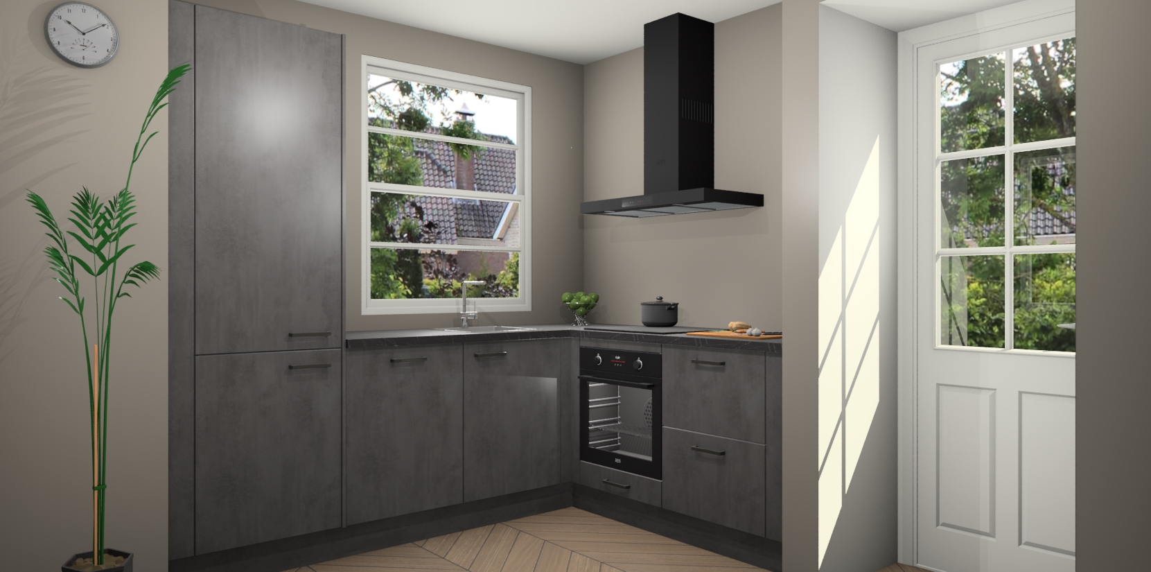 Wilt u een echte aanwinst voor uw keuken, maar bent u op zoek naar iets specialers dan de standaardkeukens? Kies dan voor de Beton Antraciet keuken Harbin! Dit prachtige hoekkeukenontwerp geeft u alle ruimte om optimaal te genieten van heerlijk koken. Het uitmuntende afwerkingsniveau, de fraaie houtstructuur en de sfeervolle zwarte grepen maken van de Beton Antraciet keuken Harbin de perfecte keuze voor zowel enthousiaste thuiskoks als design-minded interieurliefhebbers.