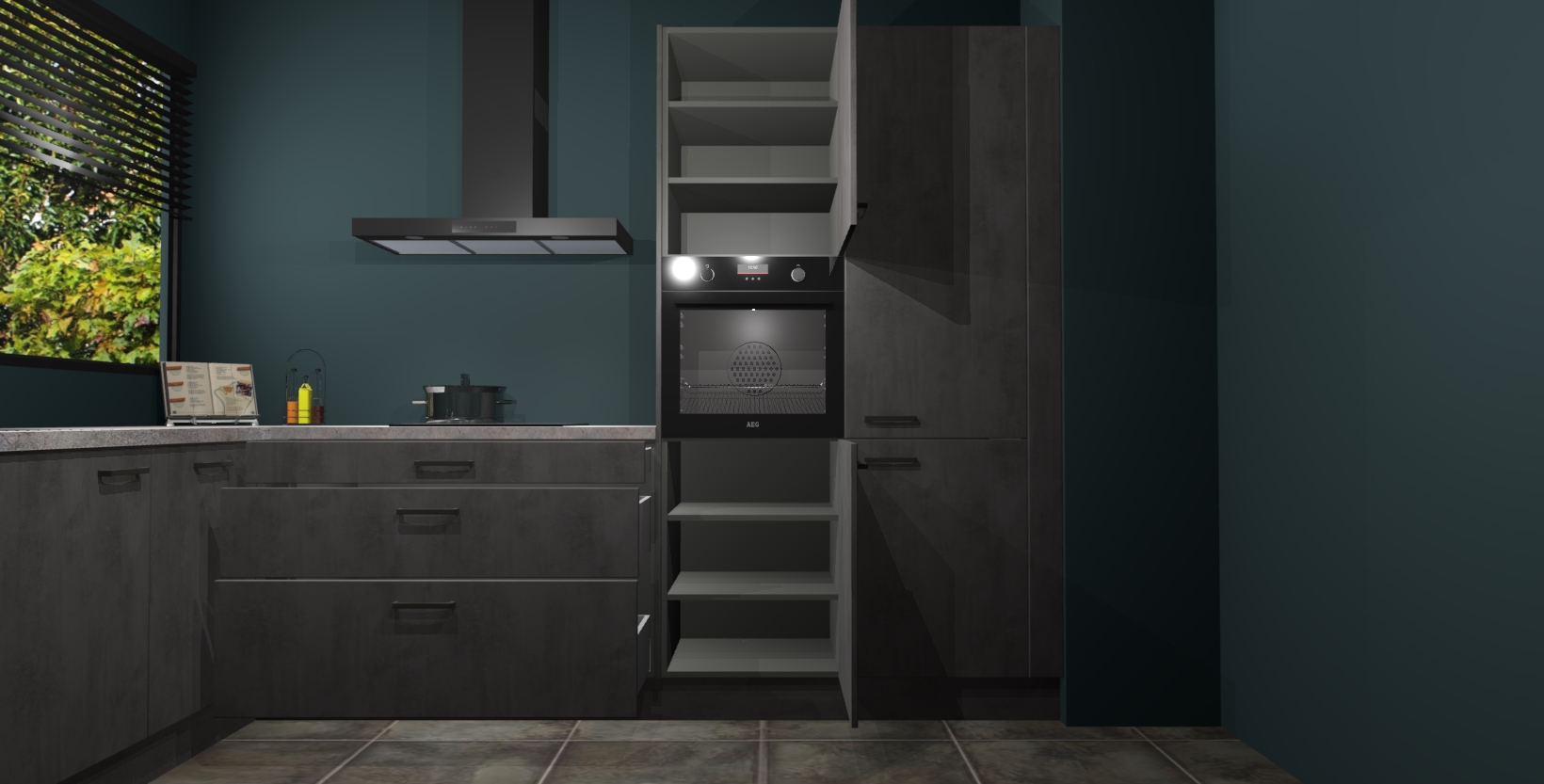 Met een modern, tijdloos design en ruime opslagruimte, zult u zich in no-time thuis voelen in uw nieuwe keuken. Uw leven wordt eenvoudiger met de soft-close deuren die voor het ultieme stille comfort zorgen - geen geluid dat u stoort terwijl u kookt. Ook is de keuken voorzien van 5 ingebouwde apparaten: een oven, inductie kookplaat, afzuigkap, vaatwasser en koelkast. Deze kunnen gemakkelijk na bestelling worden bijgewerkt naar AEG - waardoor uw luxe ervaring compleet is.