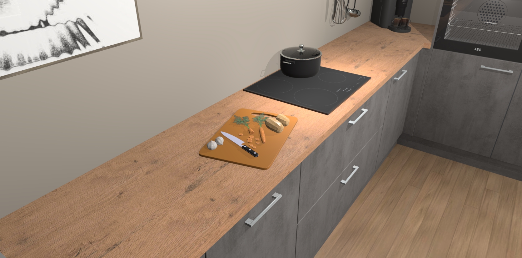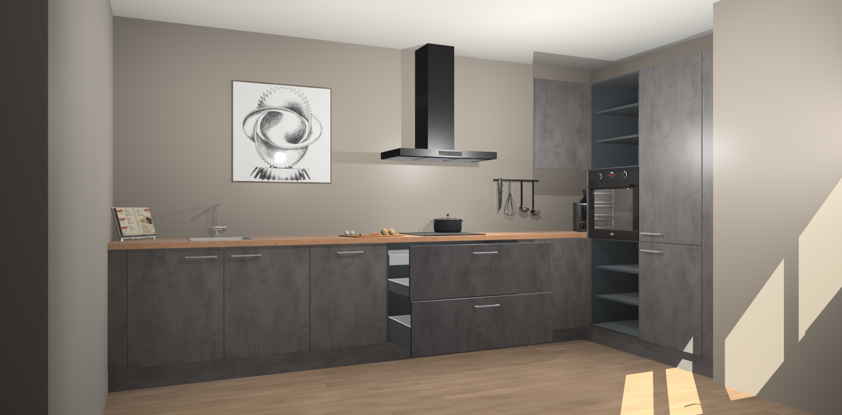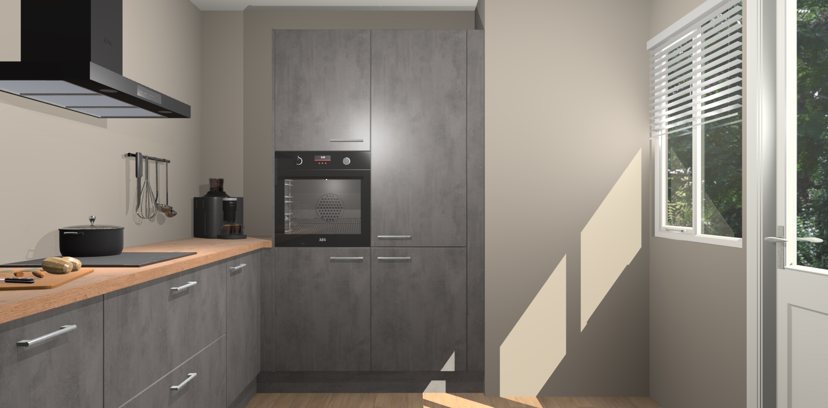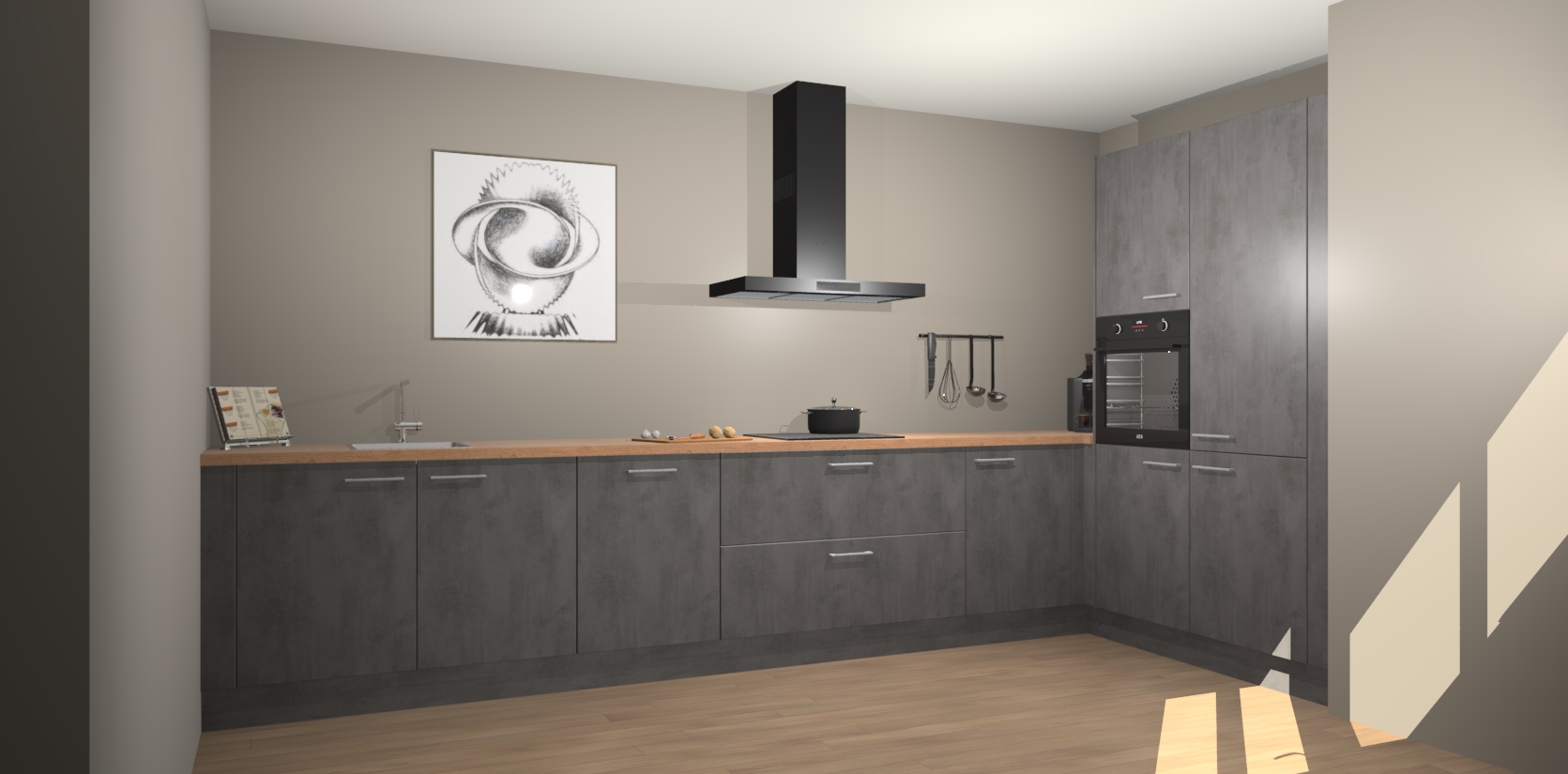 Welkom bij de Beton Antraciet keuken Khao Lak. Deze prachtige keuken zal de komende jaren het middelpunt van de belangstelling in uw huis zijn. Uitgerust met vijf inbouwapparaten komt u nooit kookgereedschap tekort. Bovendien geeft de warme houtlook elke ruimte een uitnodigende en tijdloze uitstraling.