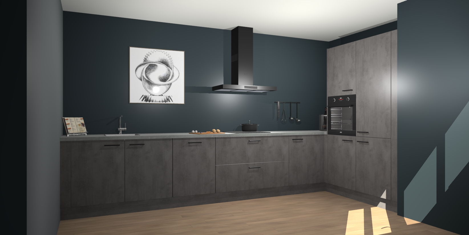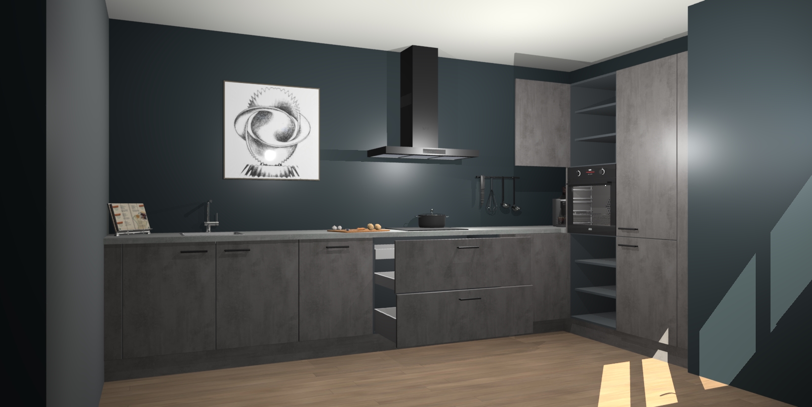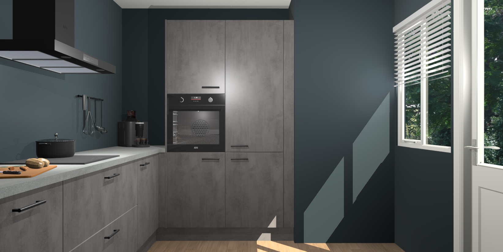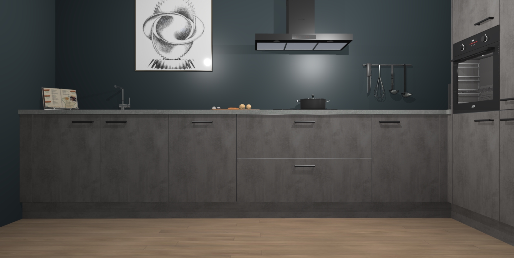 Welkom bij de Beton Antraciet keuken Khao Lak. Deze prachtige keuken zal de komende jaren het middelpunt van de belangstelling in uw huis zijn. Uitgerust met vijf inbouwapparaten komt u nooit kookgereedschap tekort. Bovendien geeft de warme houtlook elke ruimte een uitnodigende en tijdloze uitstraling.