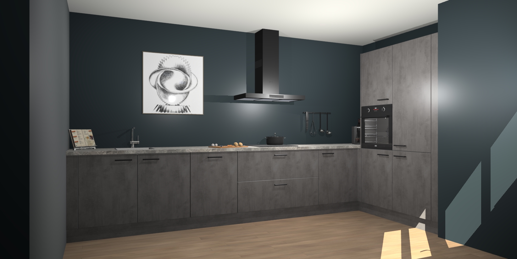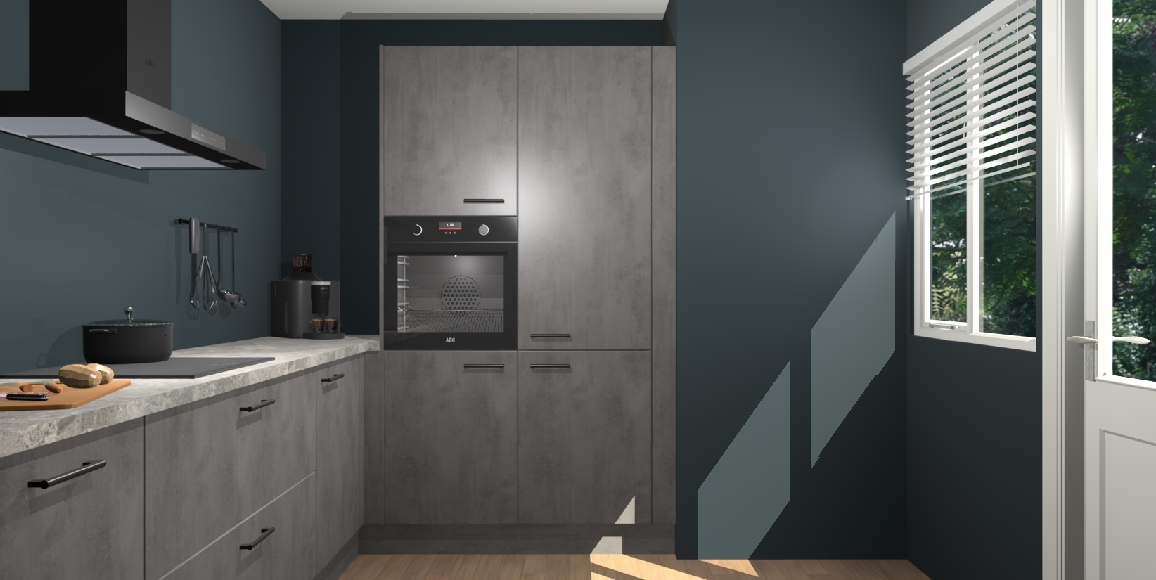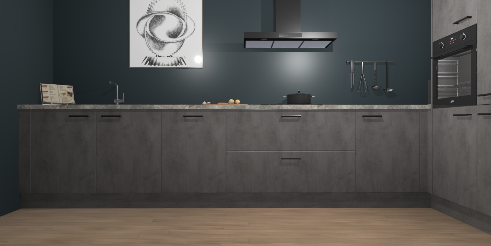 Welkom bij de Beton Antraciet keuken Khao Lak. Deze prachtige keuken zal de komende jaren het middelpunt van de belangstelling in uw huis zijn. Uitgerust met vijf inbouwapparaten komt u nooit kookgereedschap tekort. Bovendien geeft de warme houtlook elke ruimte een uitnodigende en tijdloze uitstraling.