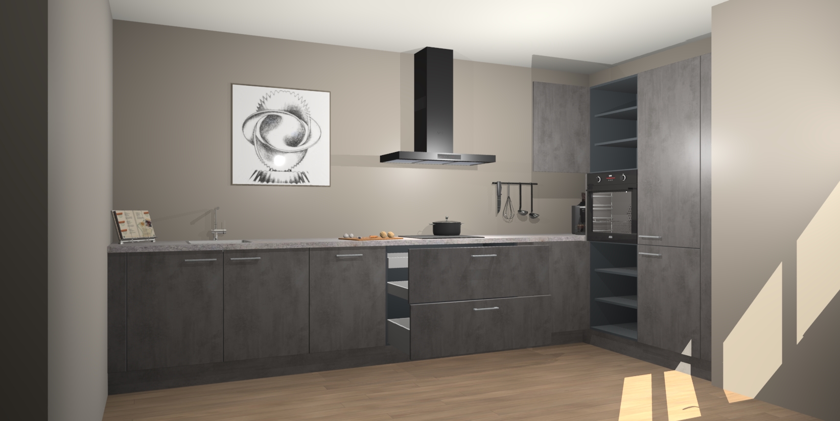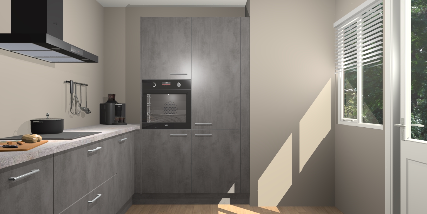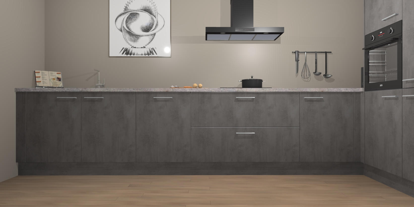 Welkom bij de Beton Antraciet keuken Khao Lak. Deze prachtige keuken zal de komende jaren het middelpunt van de belangstelling in uw huis zijn. Uitgerust met vijf inbouwapparaten komt u nooit kookgereedschap tekort. Bovendien geeft de warme houtlook elke ruimte een uitnodigende en tijdloze uitstraling.