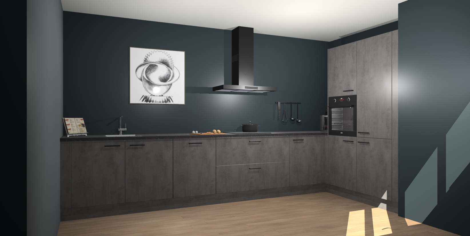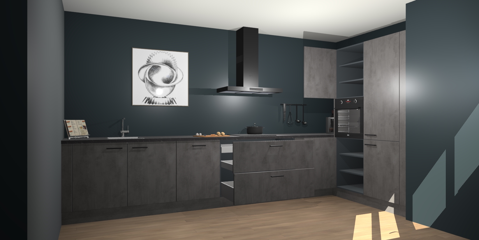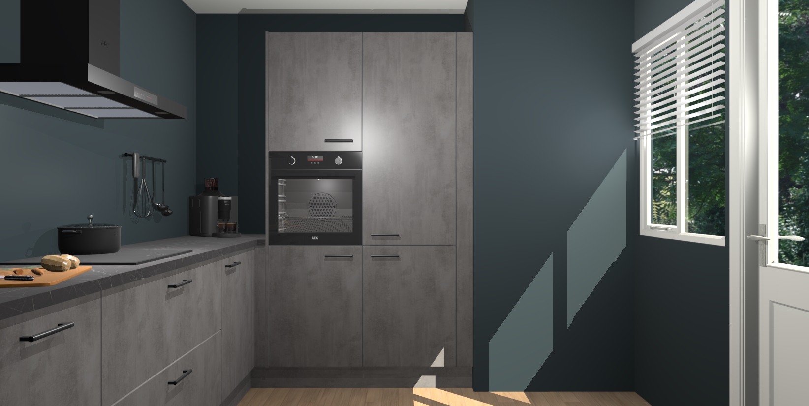 Welkom bij de Beton Antraciet keuken Khao Lak. Deze prachtige keuken zal de komende jaren het middelpunt van de belangstelling in uw huis zijn. Uitgerust met vijf inbouwapparaten komt u nooit kookgereedschap tekort. Bovendien geeft de warme houtlook elke ruimte een uitnodigende en tijdloze uitstraling.