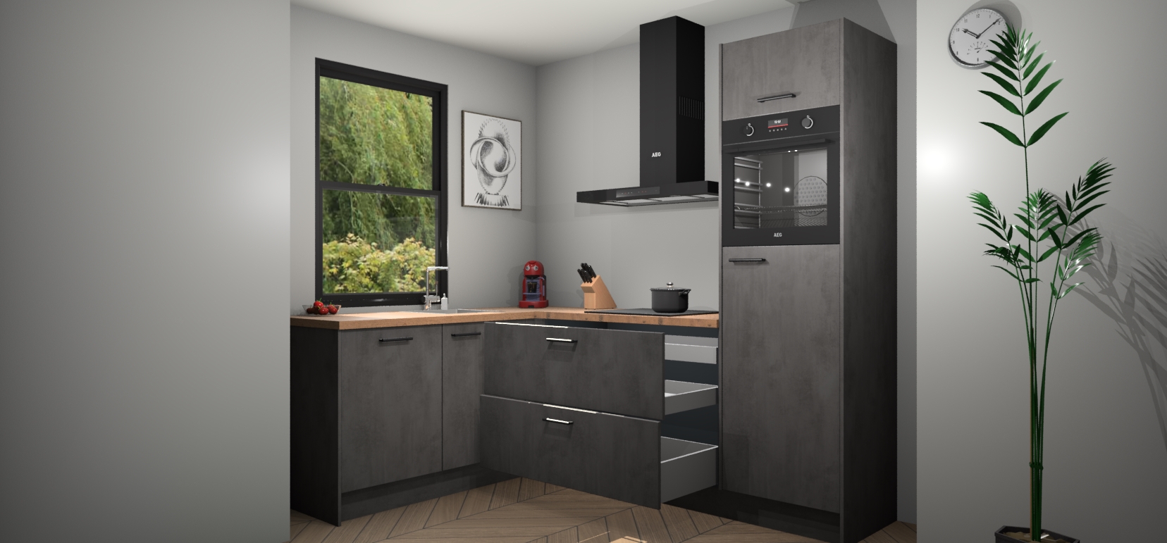 Deze prachtige hoekkeuken heeft alle benodigdheden om uw droomkook- en eetruimte compleet te maken. De Beton Antraciet kasten bieden een echo van raffinement, terwijl de 5 inbouwapparaten genoeg opties bieden voor het bereiden van heerlijke maaltijden. De oven, inductiekookplaat, afzuigkap, vaatwasser en koelkast zorgen ervoor dat u tijd in de keuken zo efficiënt mogelijk verloopt, terwijl ze ook dat extra vleugje luxe bieden.