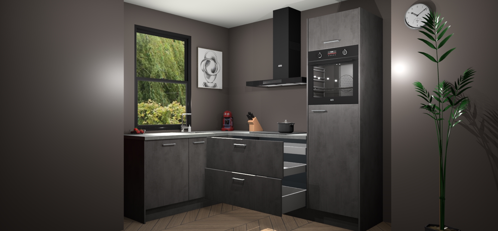 Deze prachtige hoekkeuken heeft alle benodigdheden om uw droomkook- en eetruimte compleet te maken. De Beton Antraciet kasten bieden een echo van raffinement, terwijl de 5 inbouwapparaten genoeg opties bieden voor het bereiden van heerlijke maaltijden. De oven, inductiekookplaat, afzuigkap, vaatwasser en koelkast zorgen ervoor dat u tijd in de keuken zo efficiënt mogelijk verloopt, terwijl ze ook dat extra vleugje luxe bieden.