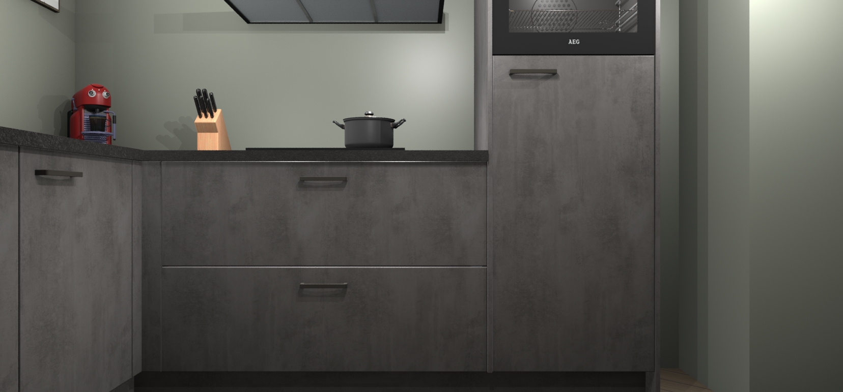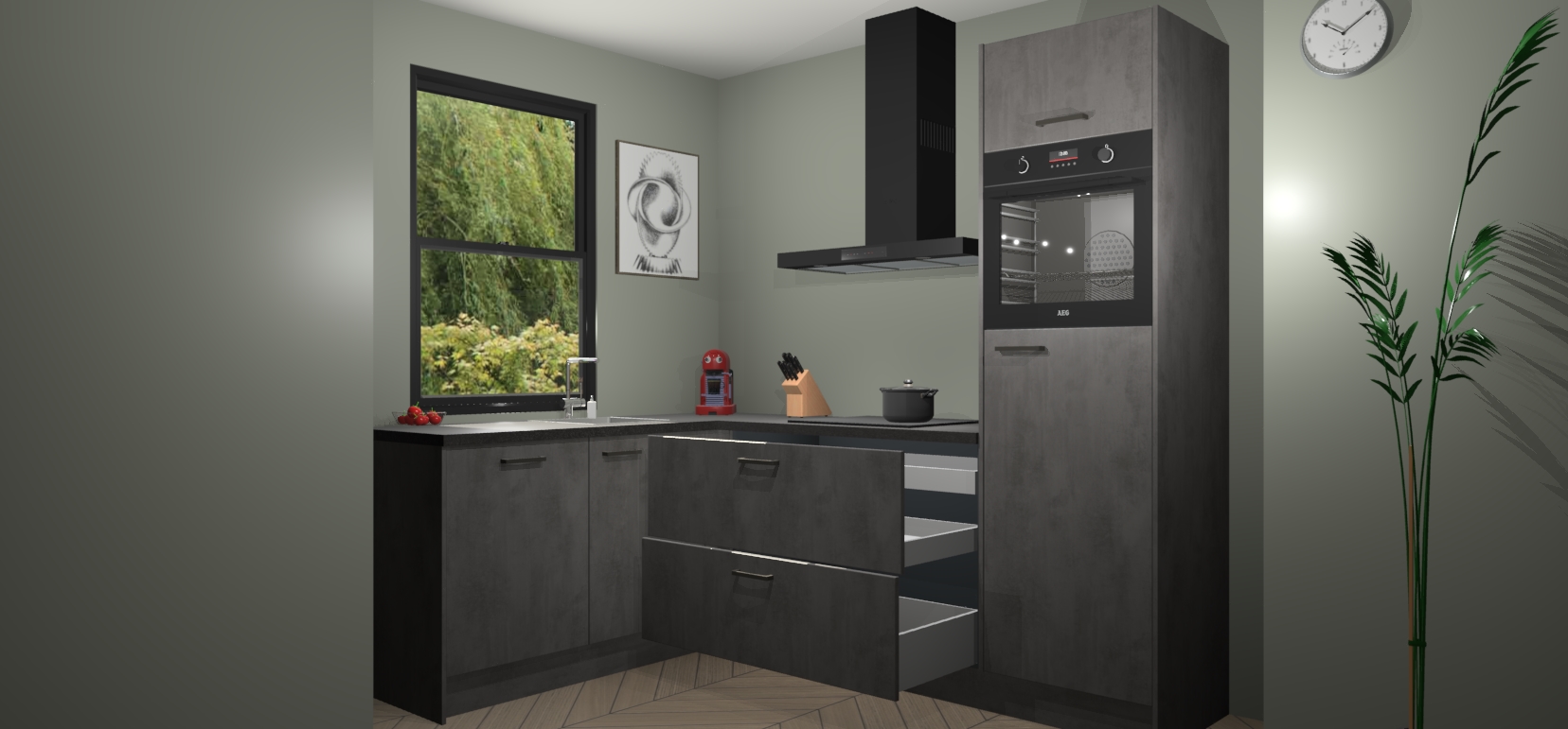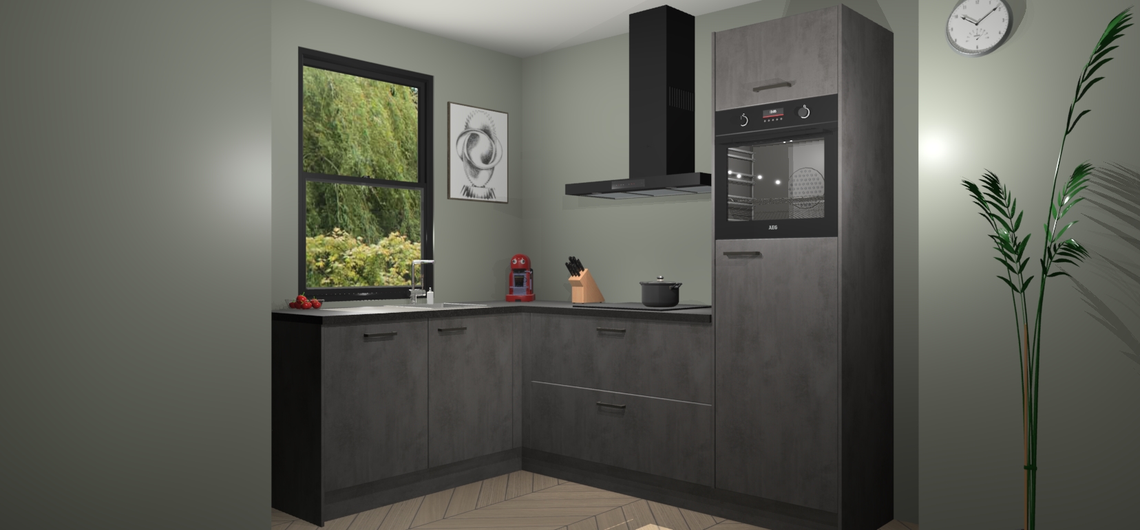 Deze prachtige hoekkeuken heeft alle benodigdheden om uw droomkook- en eetruimte compleet te maken. De Beton Antraciet kasten bieden een echo van raffinement, terwijl de 5 inbouwapparaten genoeg opties bieden voor het bereiden van heerlijke maaltijden. De oven, inductiekookplaat, afzuigkap, vaatwasser en koelkast zorgen ervoor dat u tijd in de keuken zo efficiënt mogelijk verloopt, terwijl ze ook dat extra vleugje luxe bieden.