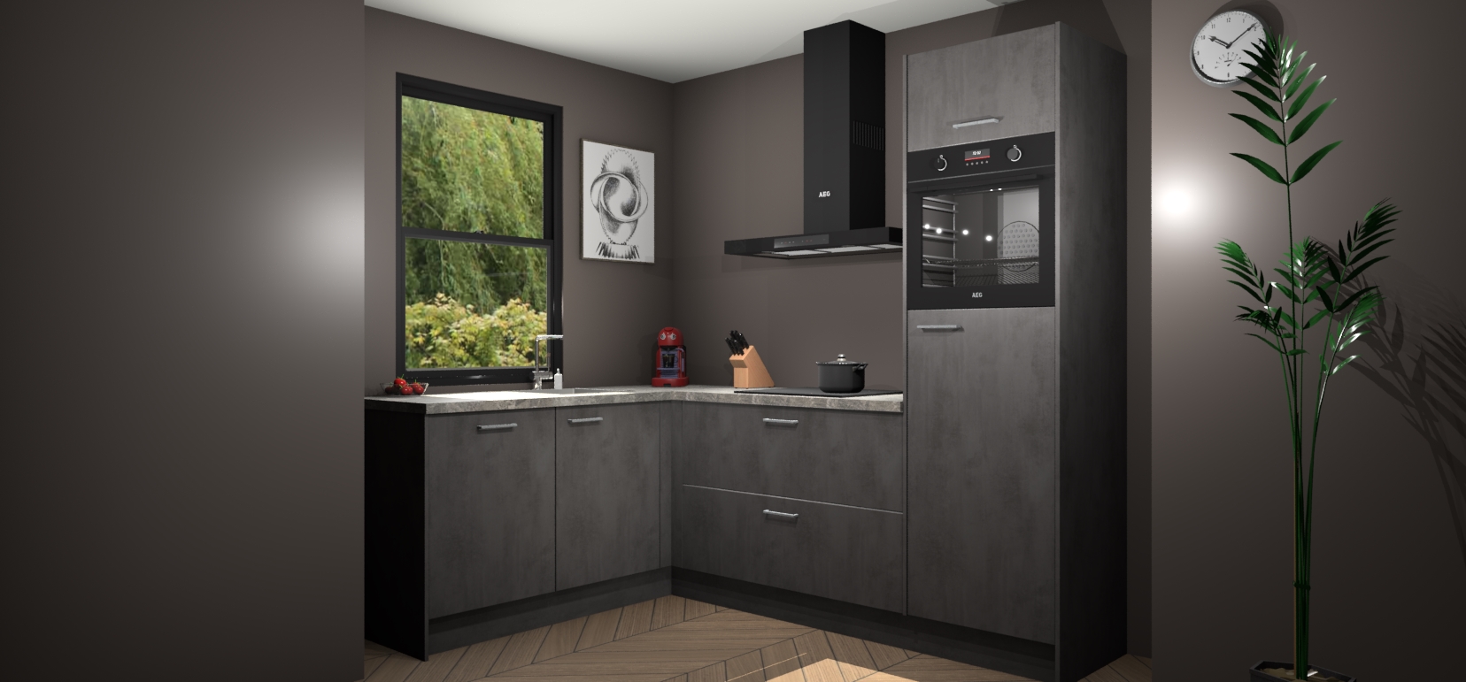 Deze prachtige hoekkeuken heeft alle benodigdheden om uw droomkook- en eetruimte compleet te maken. De Beton Antraciet kasten bieden een echo van raffinement, terwijl de 5 inbouwapparaten genoeg opties bieden voor het bereiden van heerlijke maaltijden. De oven, inductiekookplaat, afzuigkap, vaatwasser en koelkast zorgen ervoor dat u tijd in de keuken zo efficiënt mogelijk verloopt, terwijl ze ook dat extra vleugje luxe bieden.