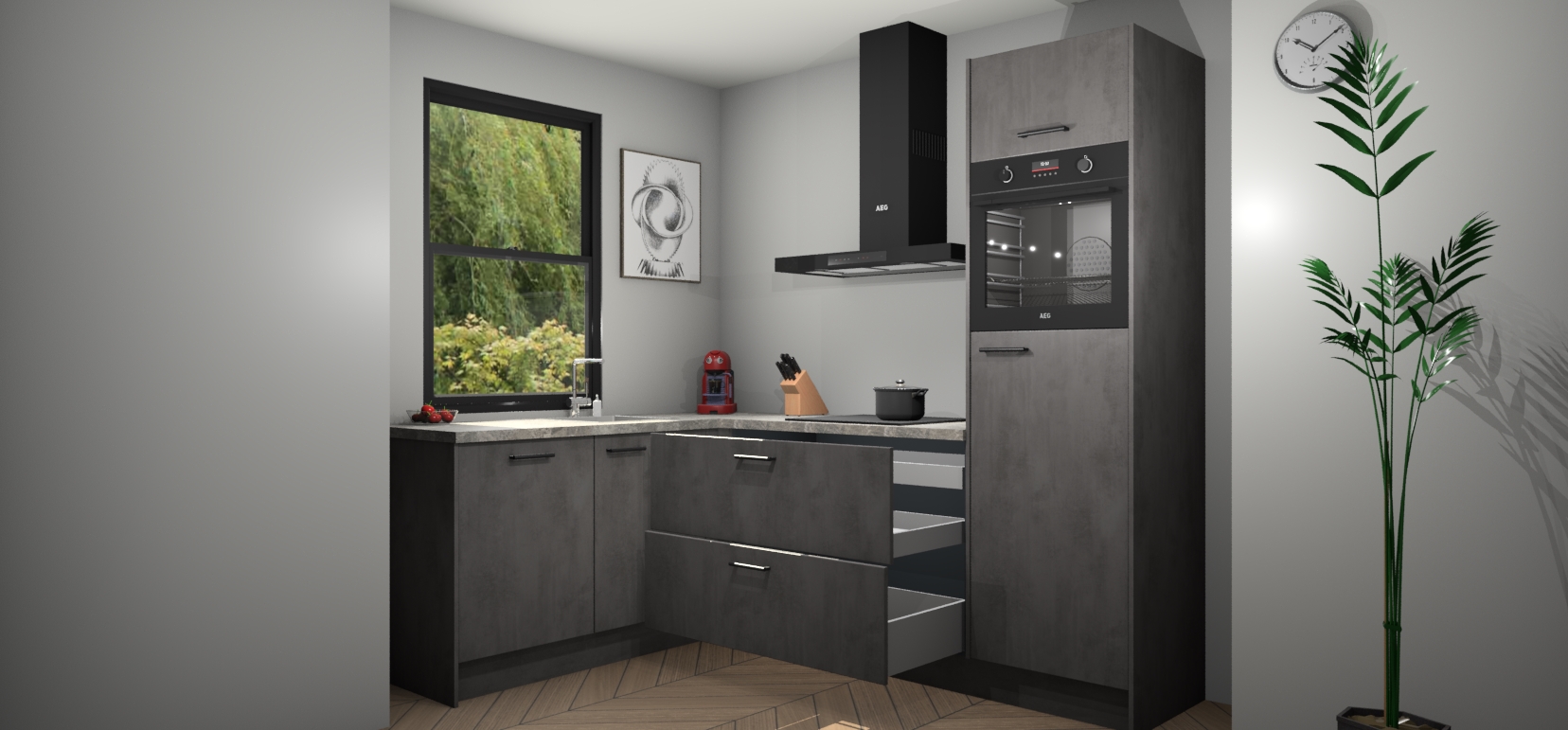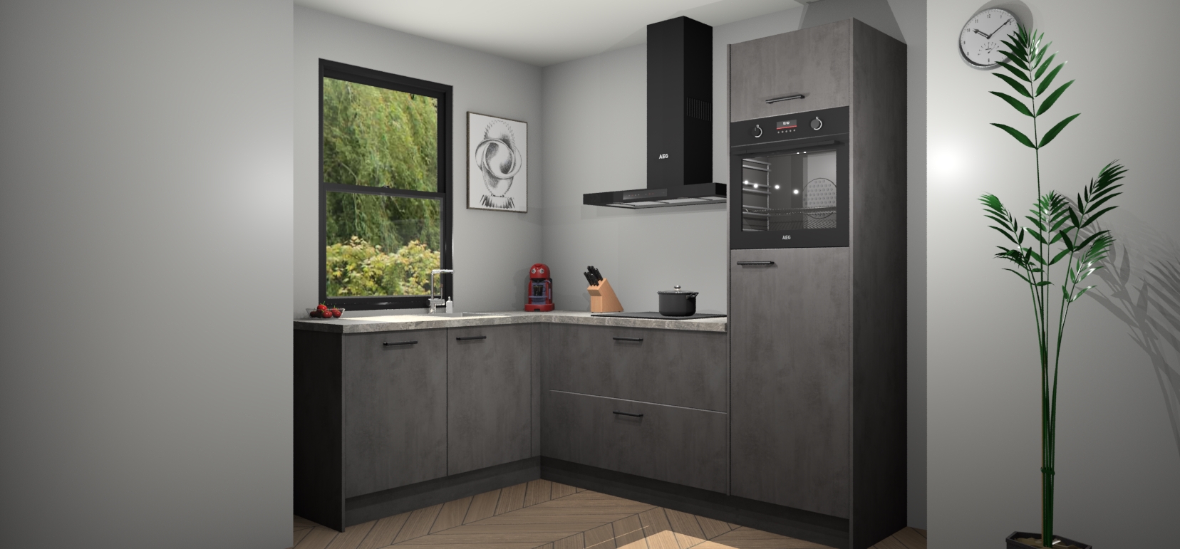 Deze prachtige hoekkeuken heeft alle benodigdheden om uw droomkook- en eetruimte compleet te maken. De Beton Antraciet kasten bieden een echo van raffinement, terwijl de 5 inbouwapparaten genoeg opties bieden voor het bereiden van heerlijke maaltijden. De oven, inductiekookplaat, afzuigkap, vaatwasser en koelkast zorgen ervoor dat u tijd in de keuken zo efficiënt mogelijk verloopt, terwijl ze ook dat extra vleugje luxe bieden.