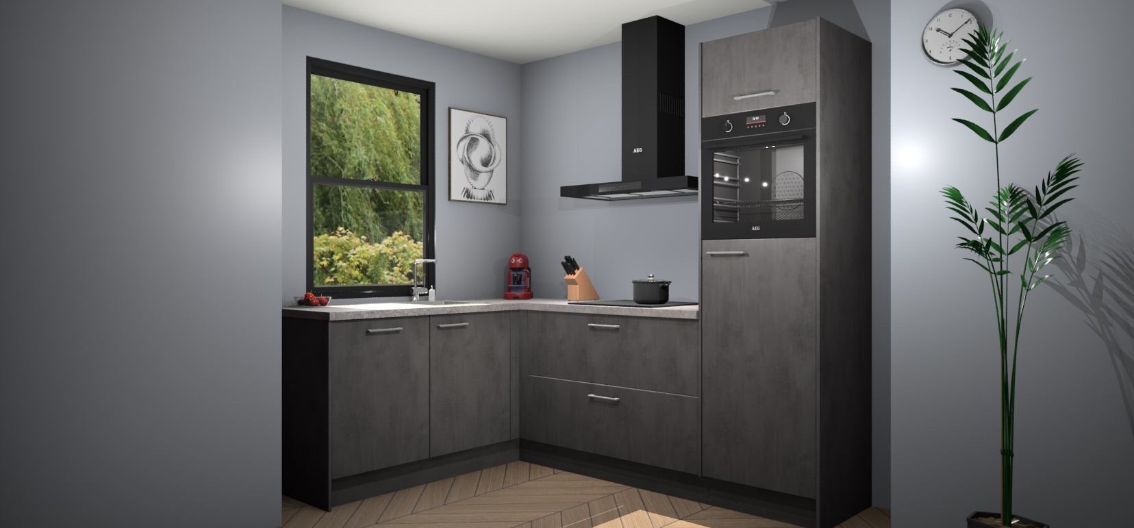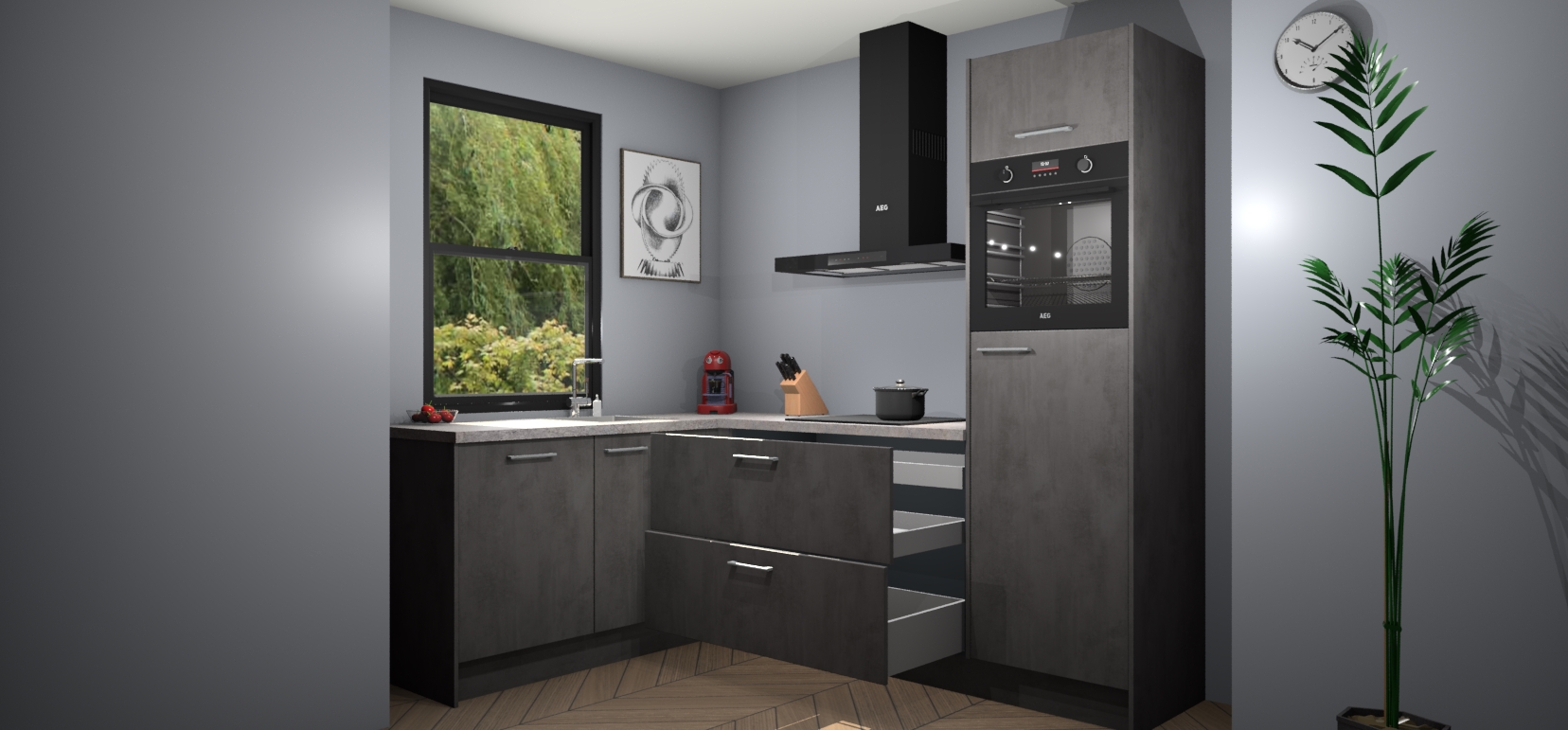 Deze prachtige hoekkeuken heeft alle benodigdheden om uw droomkook- en eetruimte compleet te maken. De Beton Antraciet kasten bieden een echo van raffinement, terwijl de 5 inbouwapparaten genoeg opties bieden voor het bereiden van heerlijke maaltijden. De oven, inductiekookplaat, afzuigkap, vaatwasser en koelkast zorgen ervoor dat u tijd in de keuken zo efficiënt mogelijk verloopt, terwijl ze ook dat extra vleugje luxe bieden.