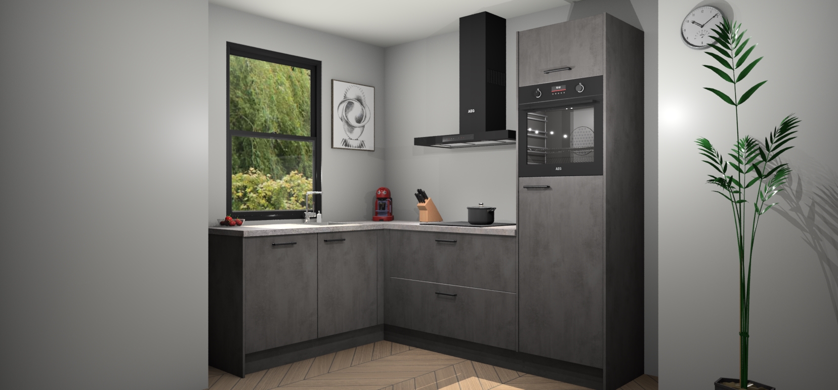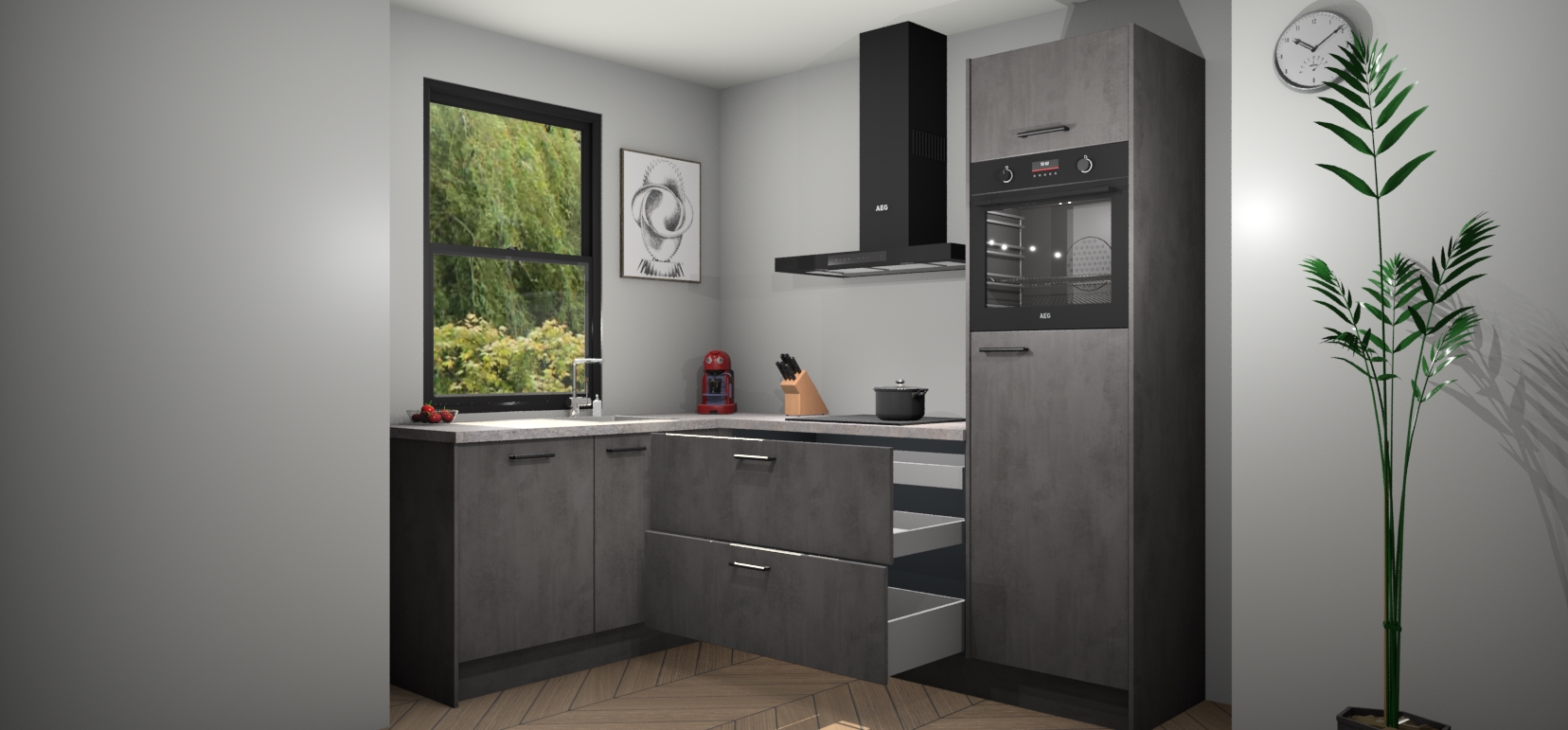 Deze prachtige hoekkeuken heeft alle benodigdheden om uw droomkook- en eetruimte compleet te maken. De Beton Antraciet kasten bieden een echo van raffinement, terwijl de 5 inbouwapparaten genoeg opties bieden voor het bereiden van heerlijke maaltijden. De oven, inductiekookplaat, afzuigkap, vaatwasser en koelkast zorgen ervoor dat u tijd in de keuken zo efficiënt mogelijk verloopt, terwijl ze ook dat extra vleugje luxe bieden.