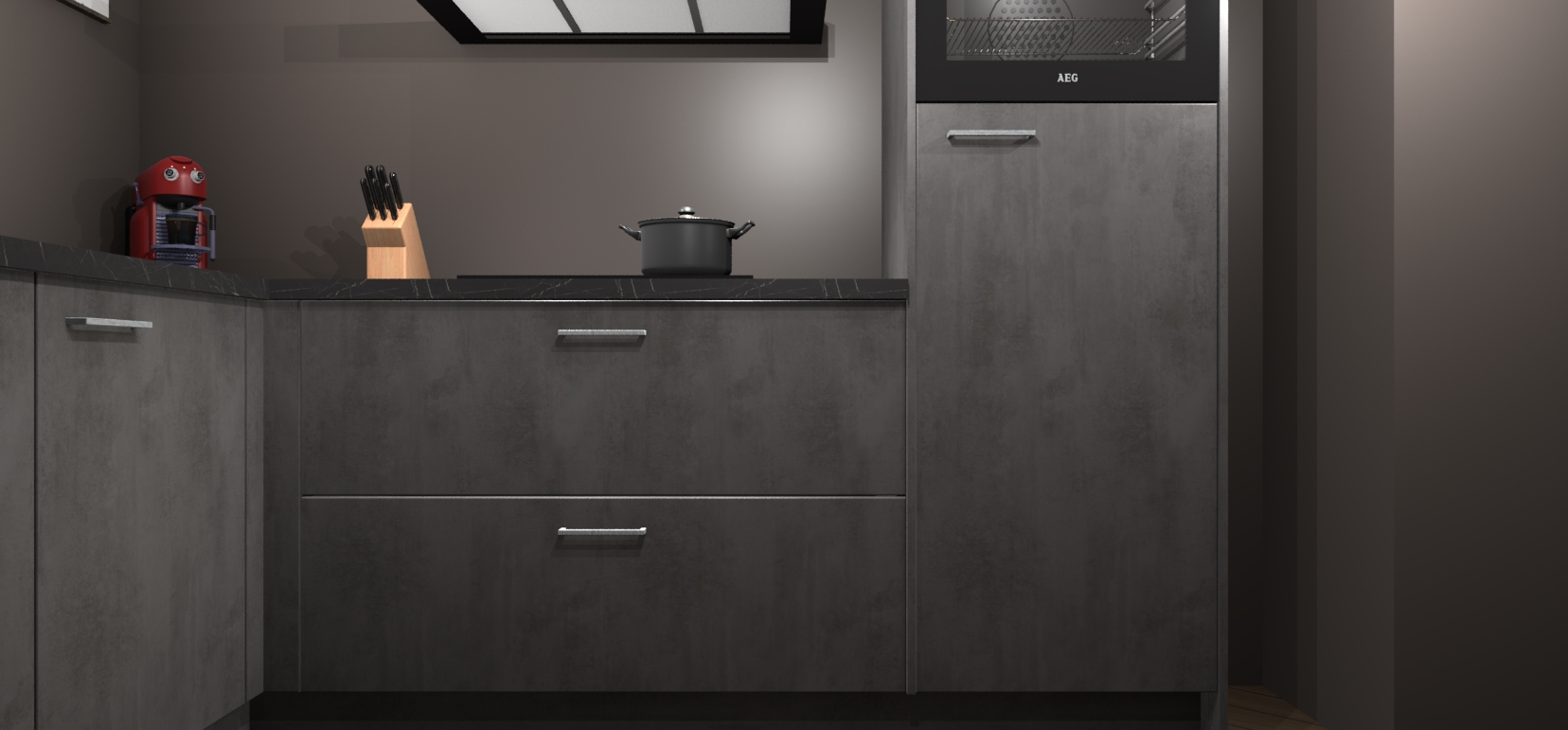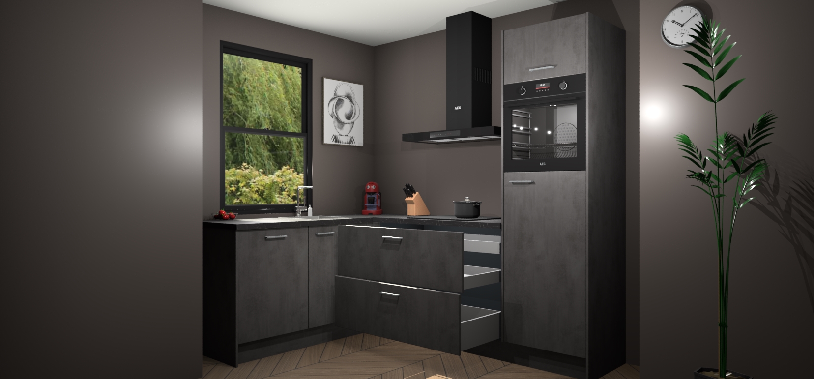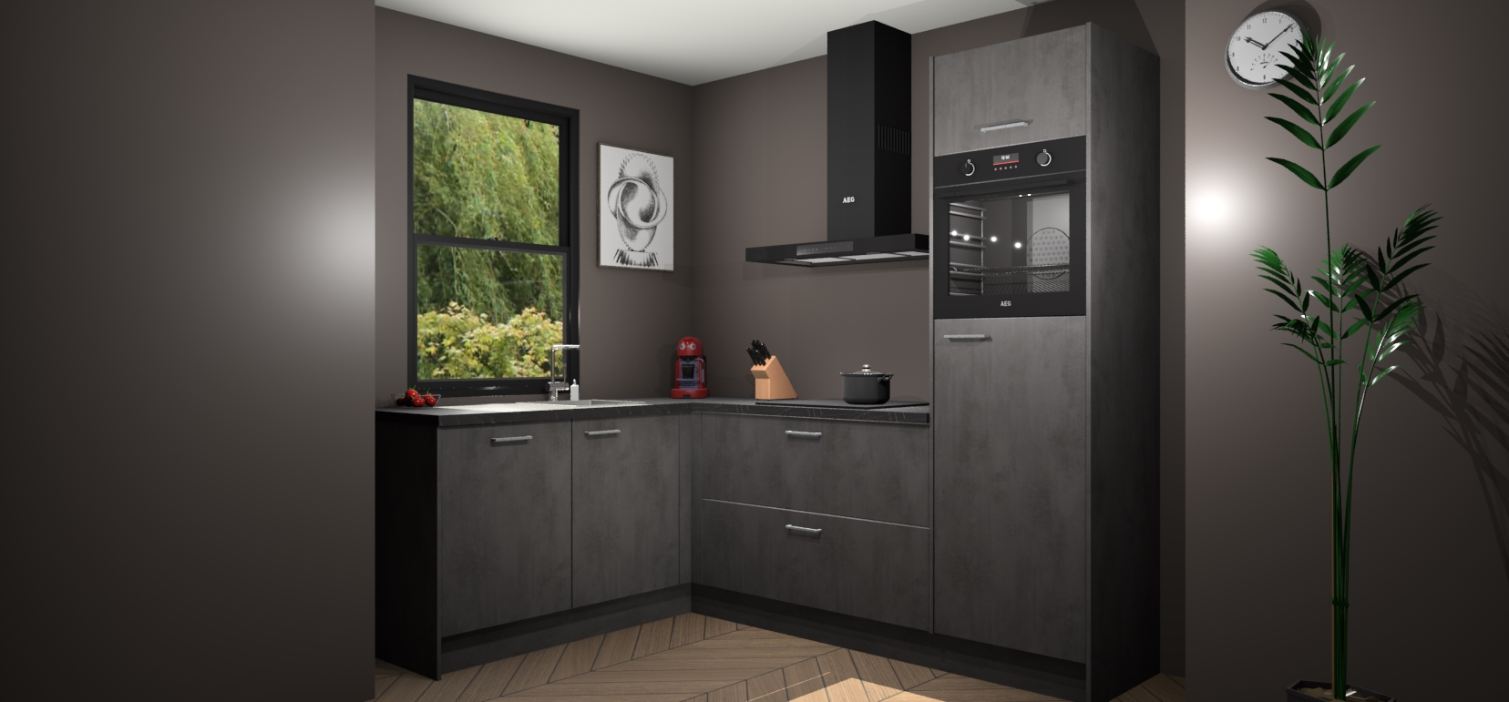 Deze prachtige hoekkeuken heeft alle benodigdheden om uw droomkook- en eetruimte compleet te maken. De Beton Antraciet kasten bieden een echo van raffinement, terwijl de 5 inbouwapparaten genoeg opties bieden voor het bereiden van heerlijke maaltijden. De oven, inductiekookplaat, afzuigkap, vaatwasser en koelkast zorgen ervoor dat u tijd in de keuken zo efficiënt mogelijk verloopt, terwijl ze ook dat extra vleugje luxe bieden.