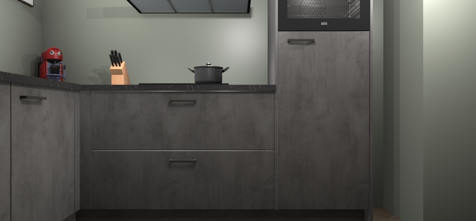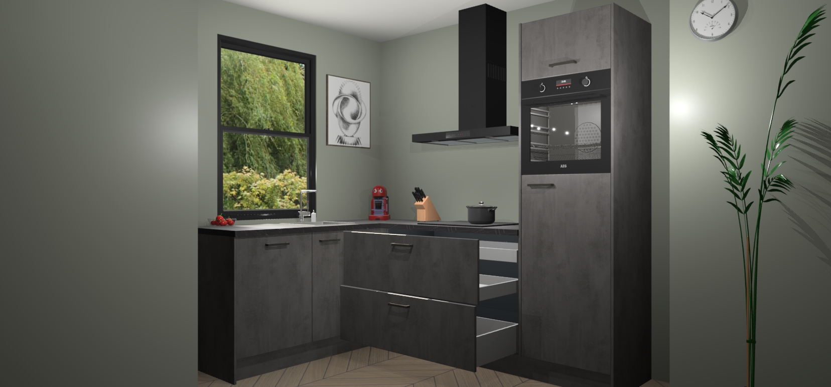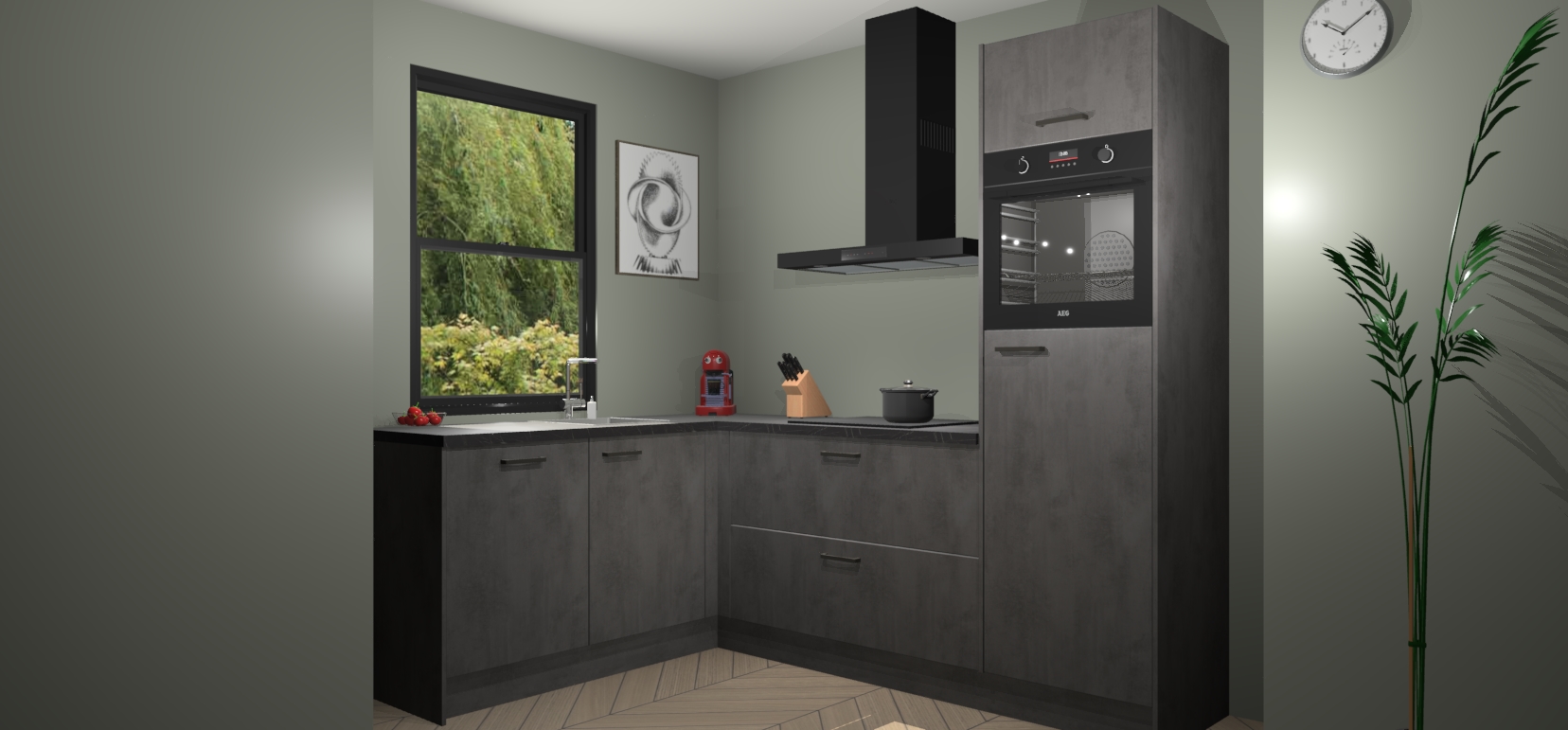 Deze prachtige hoekkeuken heeft alle benodigdheden om uw droomkook- en eetruimte compleet te maken. De Beton Antraciet kasten bieden een echo van raffinement, terwijl de 5 inbouwapparaten genoeg opties bieden voor het bereiden van heerlijke maaltijden. De oven, inductiekookplaat, afzuigkap, vaatwasser en koelkast zorgen ervoor dat u tijd in de keuken zo efficiënt mogelijk verloopt, terwijl ze ook dat extra vleugje luxe bieden.