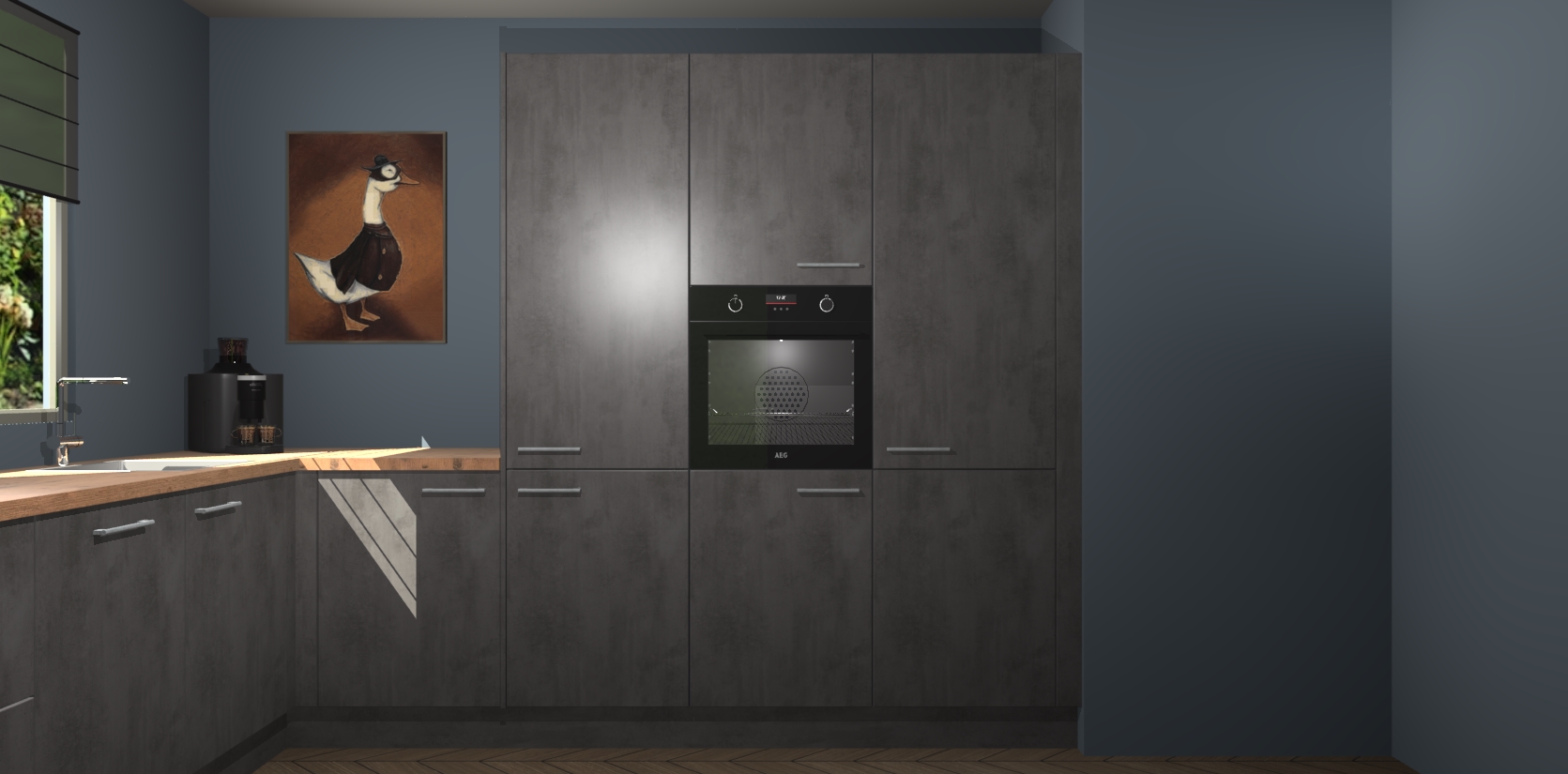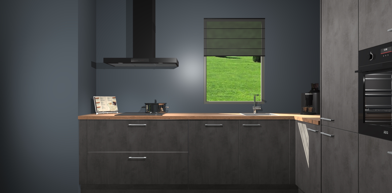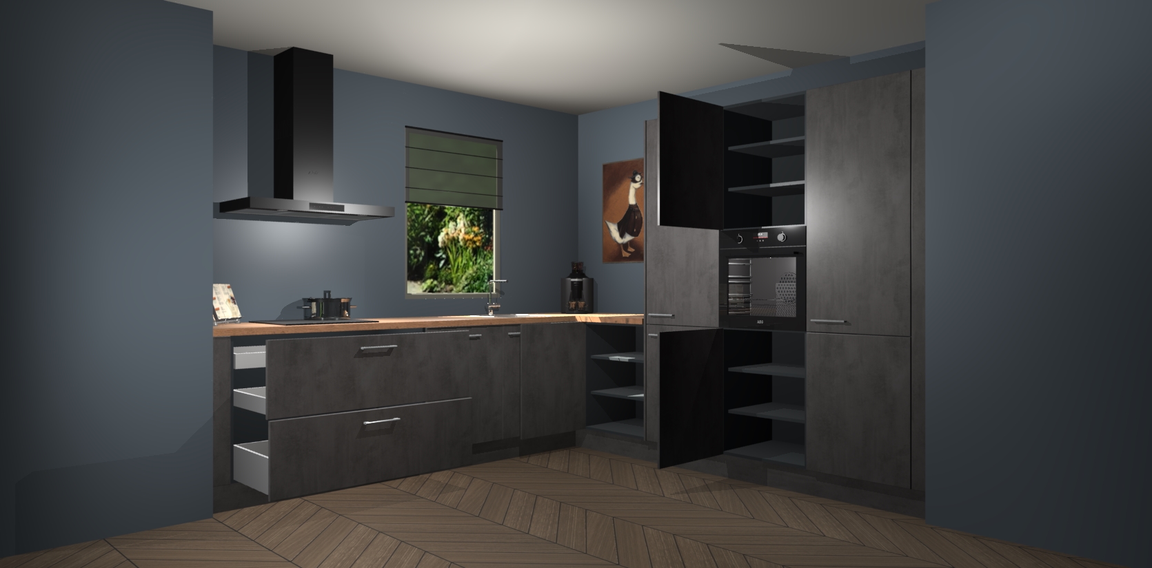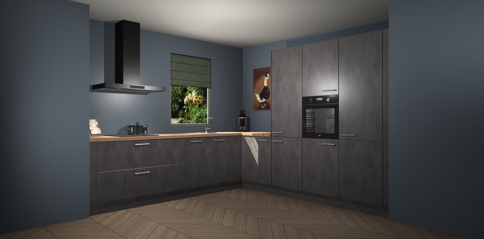 Welkom bij de Beton Antraciet keuken Laos. Deze prachtige keuken zal de komende jaren het middelpunt van de belangstelling in uw huis zijn. Uitgerust met vijf inbouwapparaten komt u nooit kookgereedschap tekort. Bovendien geeft de warme houtlook elke ruimte een uitnodigende en tijdloze uitstraling.